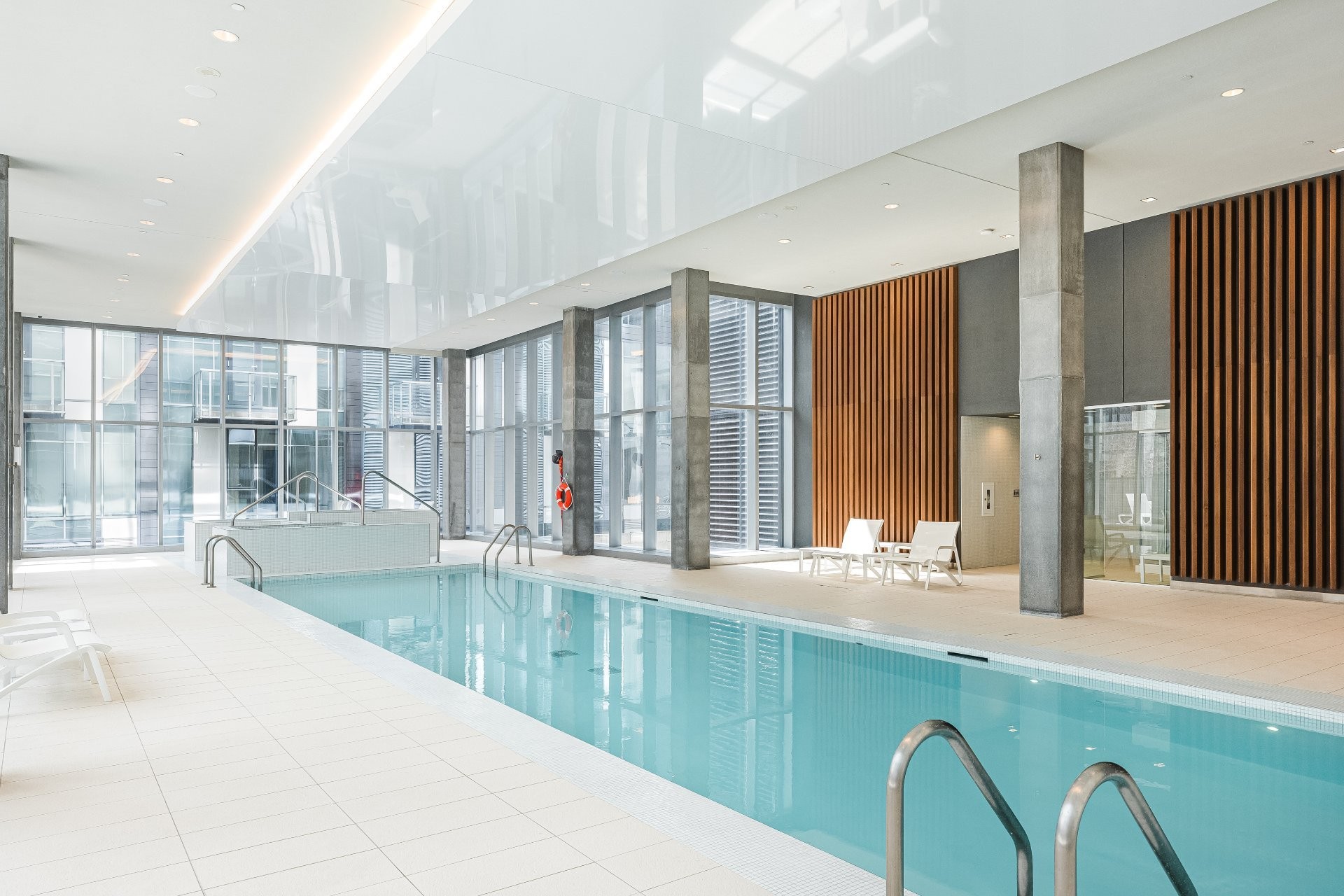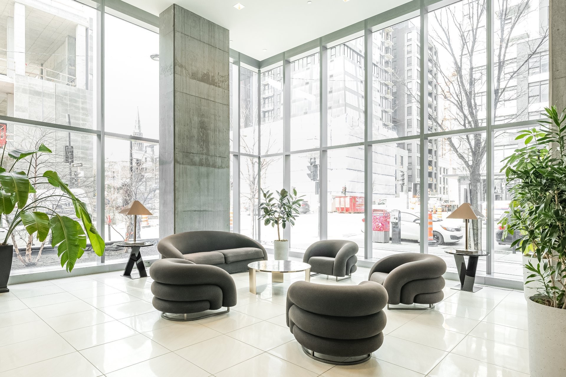 Stylish partially-furnished corner unit at YUL with 2 bedrooms, 1 bathroom, and bright, open living space. Floor-to-ceiling windows flood the unit with natural light and offer dynamic city views. Includes private locker space and indoor parking. Enjoy world-class amenities: indoor pool with multiple spas, sauna, steam room, fully equipped gym, sky lounge with BBQ, and a 23,000sft. private garden designed by Armani/Casa. Located steps from Lucien-L'Allier metro, REM, Concordia, Bell Centre, shopping, dining, and vibrant nightlife. Ideal for those seeking luxurious downtown living in a high-end, secure building. Parking available for purchase.