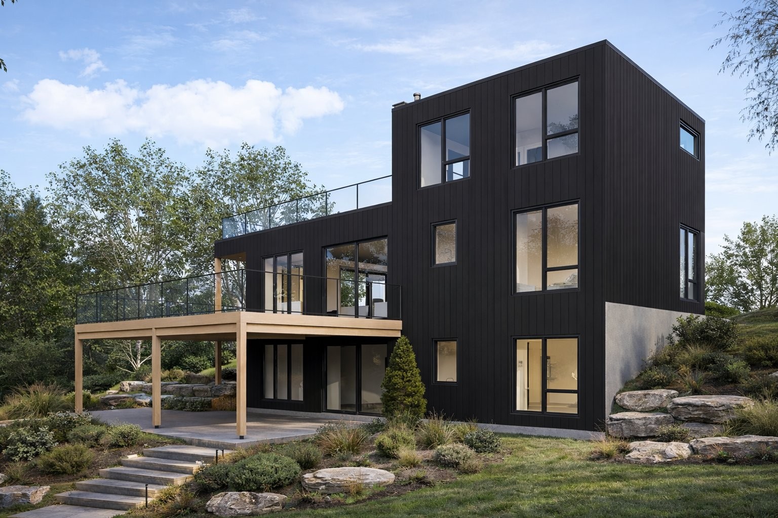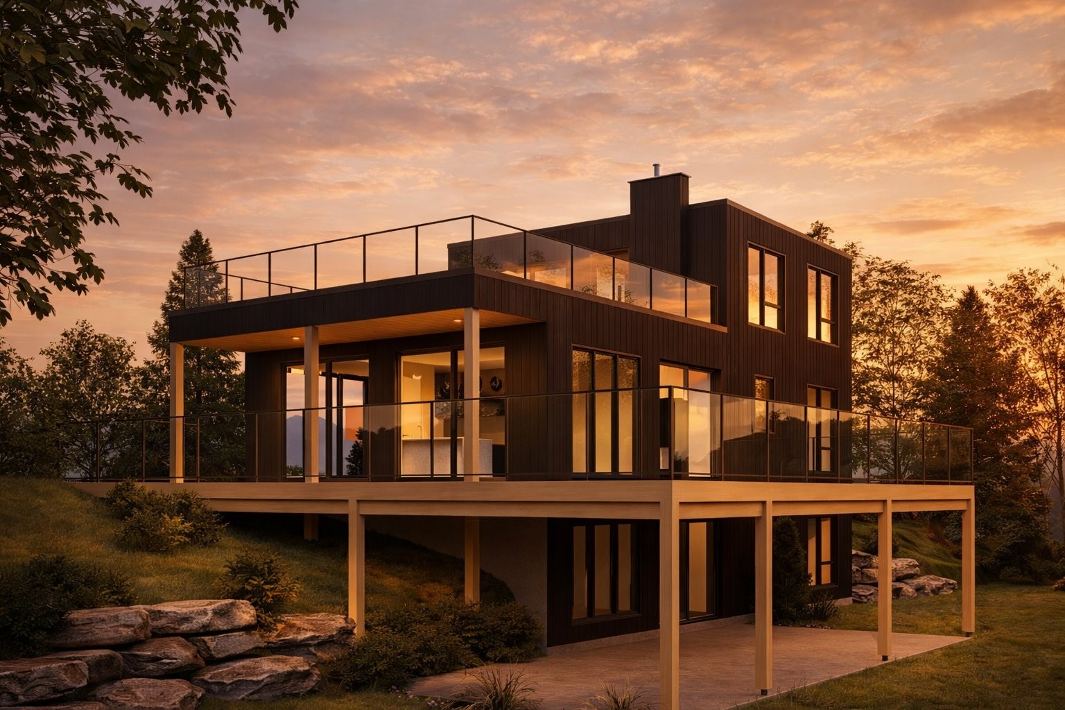 SHORT-TERM RENTALS ALLOWED. A unique contemporary cottage on three levels featuring 4 bedrooms, an office, and 3 bathrooms, located in the Chic Shack community near Mont-Tremblant. Modern architecture with cathedral ceilings and panoramic windows offering remarkable views of the mountains. Approximately 2,532 sq. ft. of living space spread across the garden level, ground floor, and upper floor. Large terraces on two levels to fully enjoy the surrounding nature. Property currently under construction with completion scheduled for mid-September 2026.