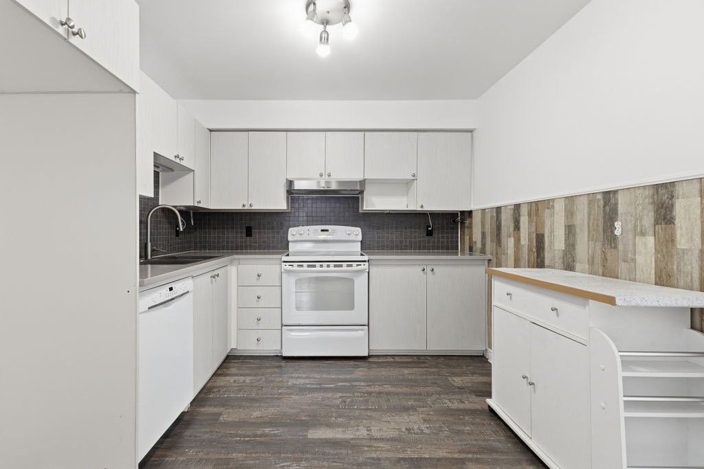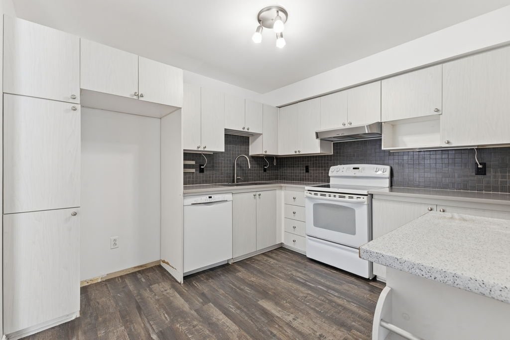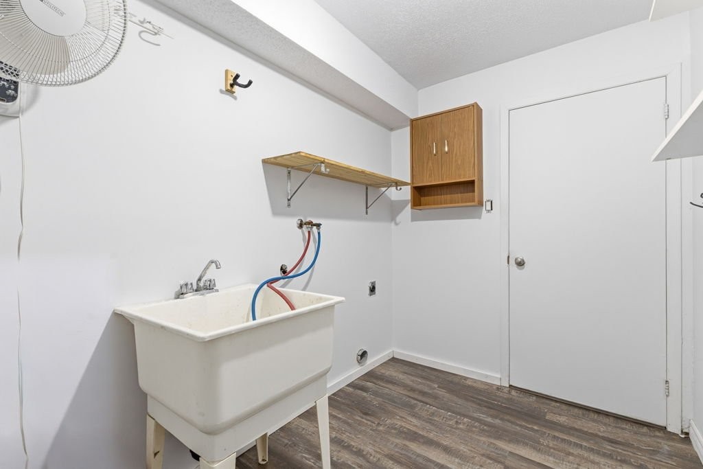 Stove, dishwasher, wall-mounted air conditioner, laundry sink.