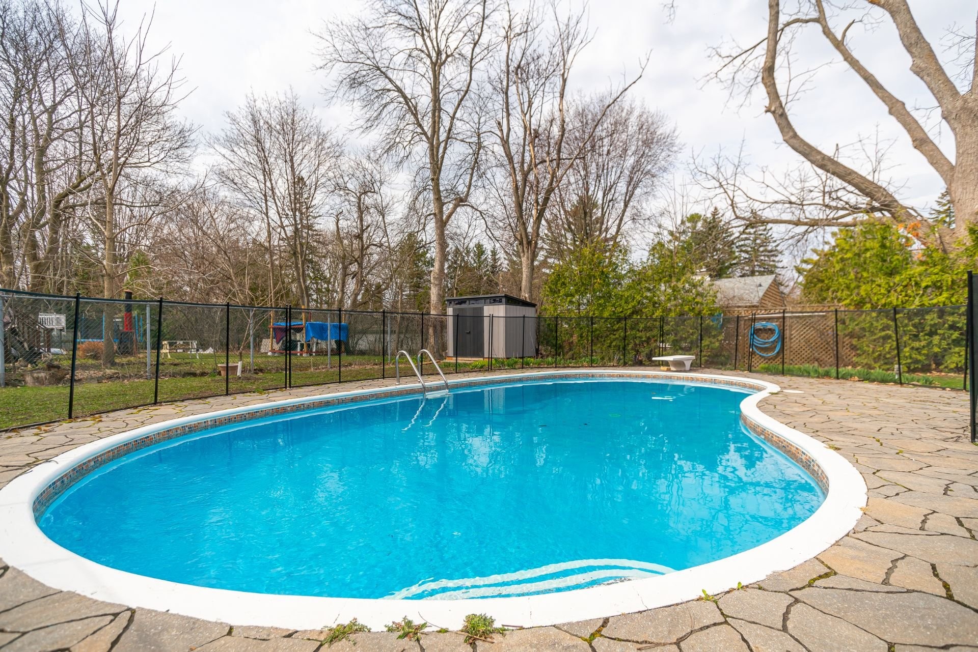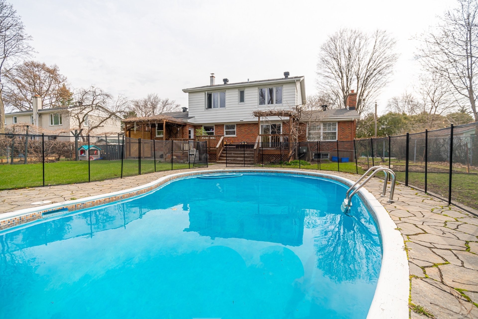 The spacious fully fenced backyard offers a large wood patio, flagstone patio with a pergola and a heated in-ground pool surrounded by flagstone and fence.