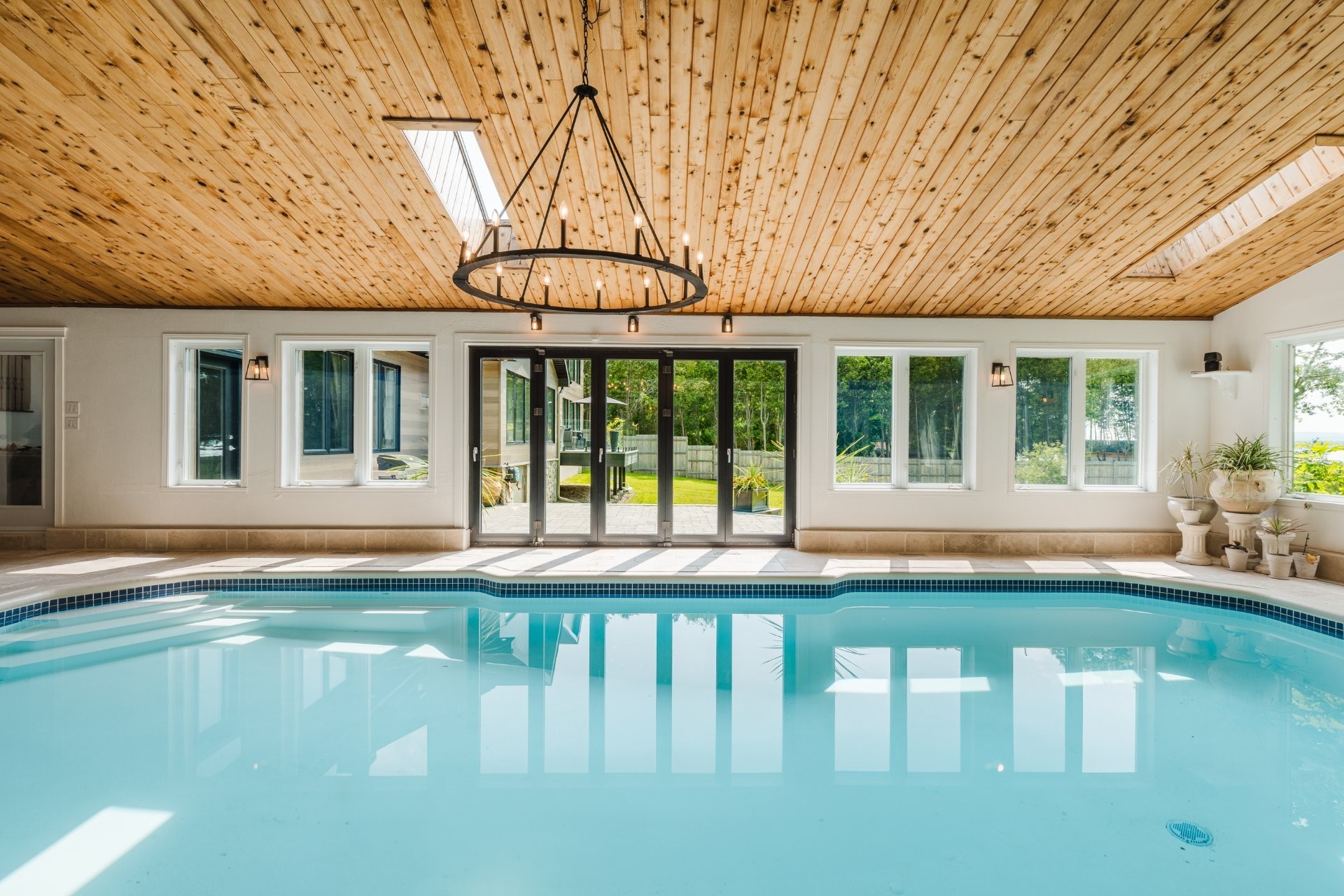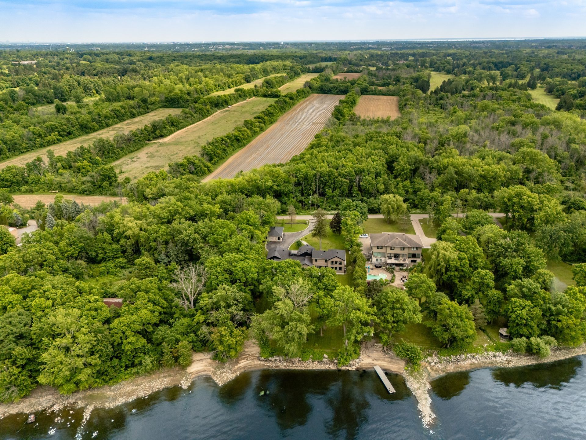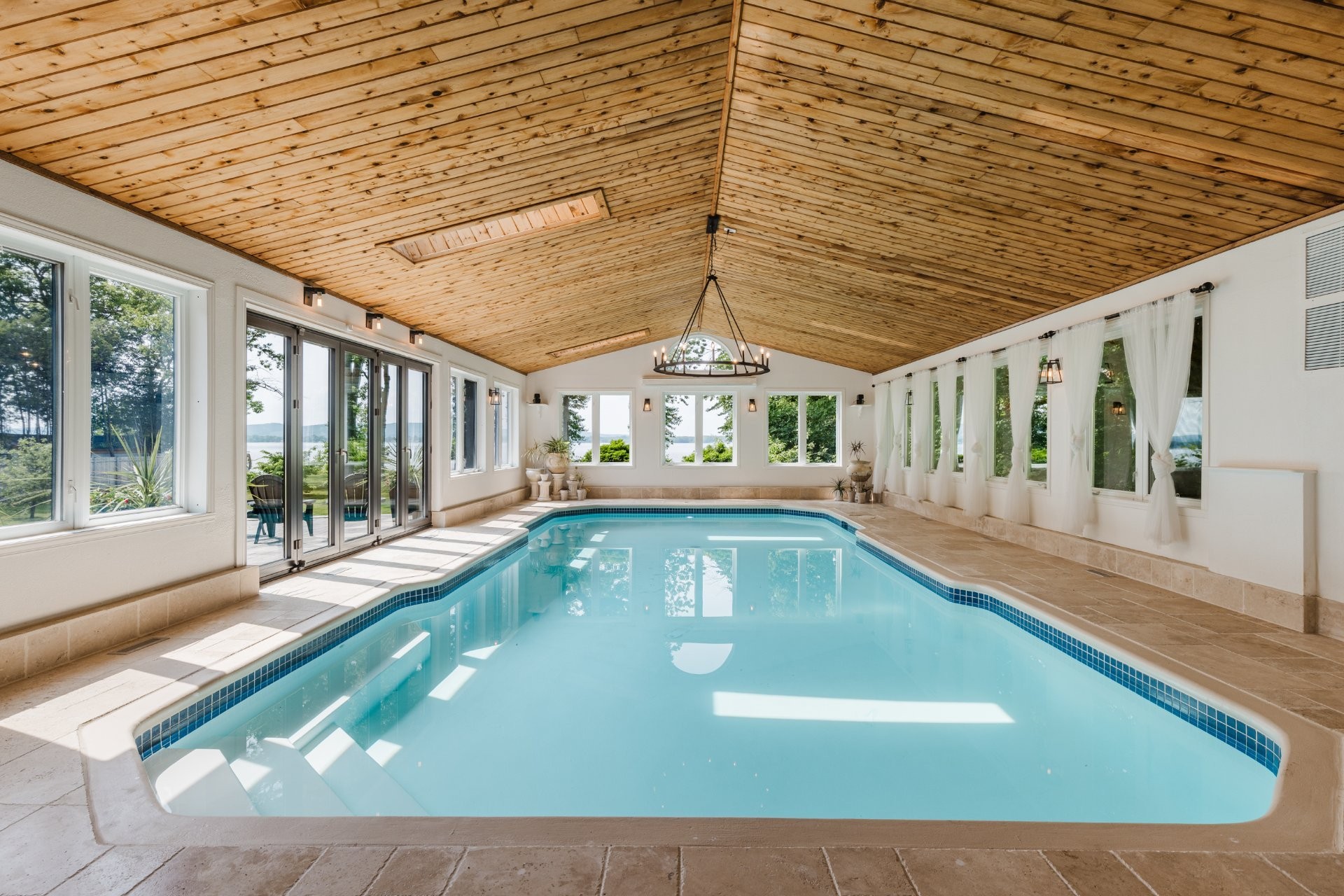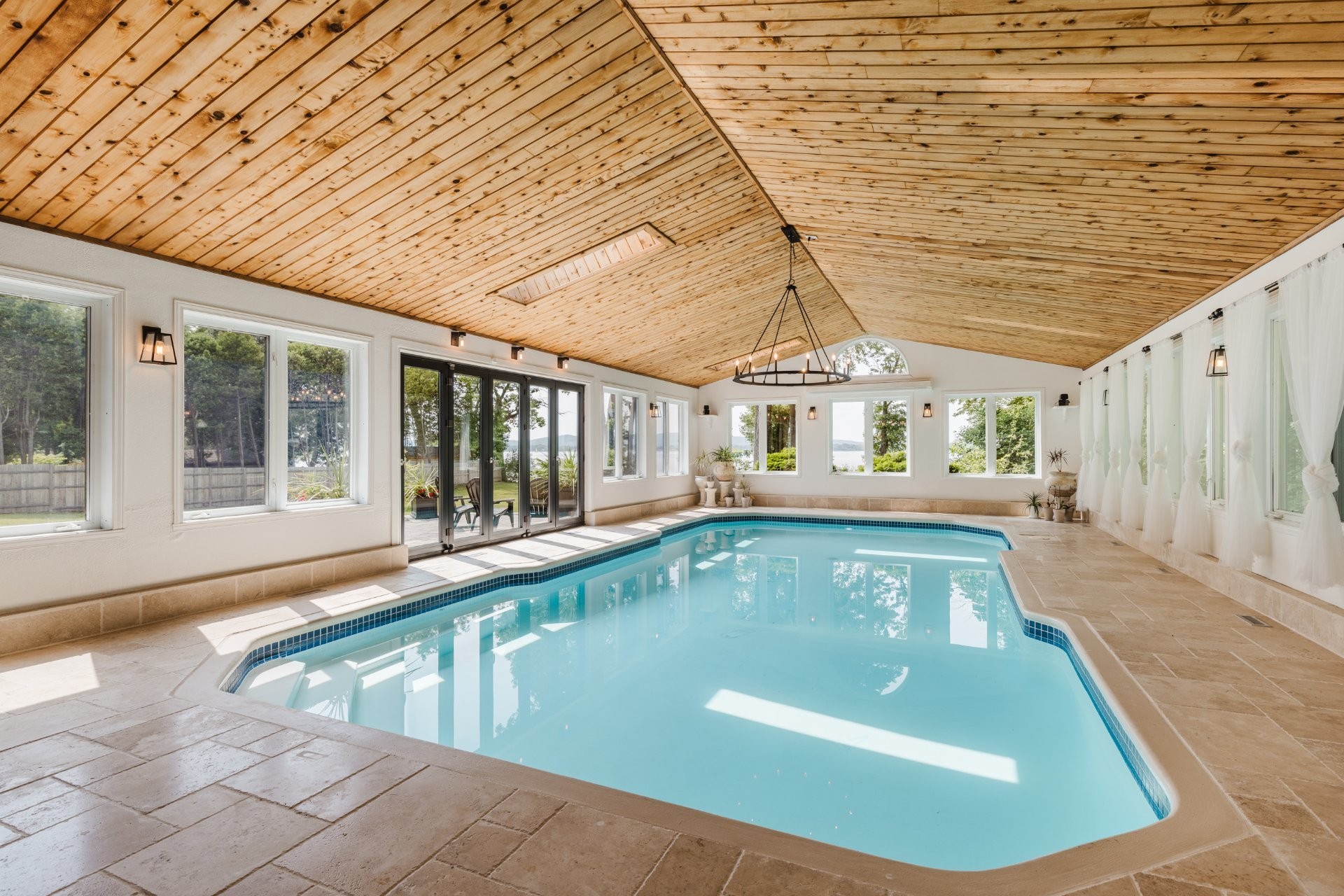 Handsome and imposing waterfront estate,in prime location,w/ panoramic views;this all-stone 7,348 sqft residence,set on a large 52,842 sq ft lot,was built and renovated to a high standard,w/ quality fixtures & finishes,and boasts 5-car garage(2 + 3),7 bedrooms,6.5 bathrooms(4 ensuite),luxury indoor pool pavilion + shower,bar,4 fireplaces,grand oak staircase(basement to 2nd floor),porcelain and hardwood floors (1st & 2nd),chef's custom wood kitchen with premium appliances,dinette,formal dining room,2 living rooms,games room/family (cinema) room,primary bedroom suite,custom walk-ins,balcony & large unistone patio,private backyard & sandy beach.