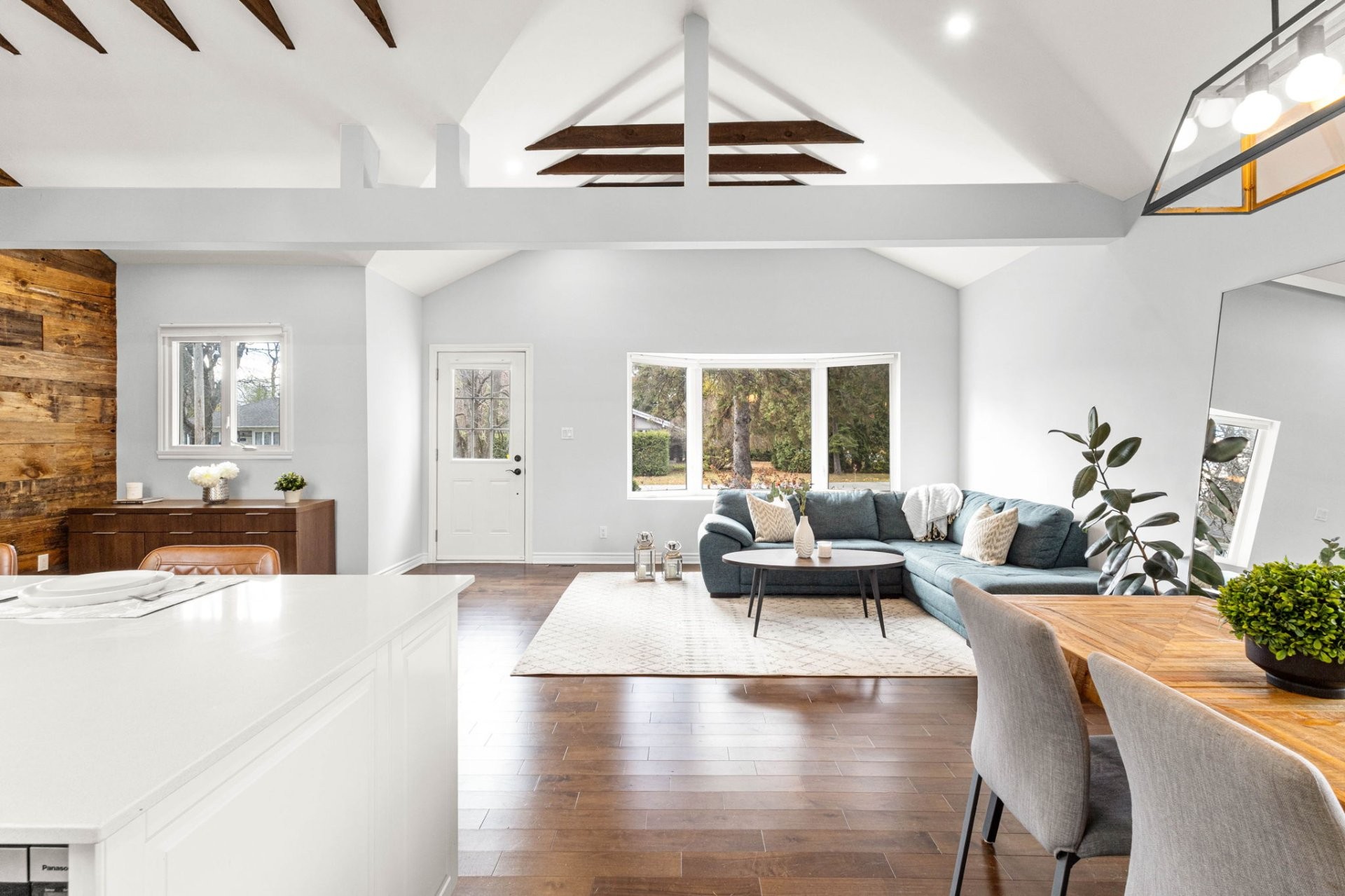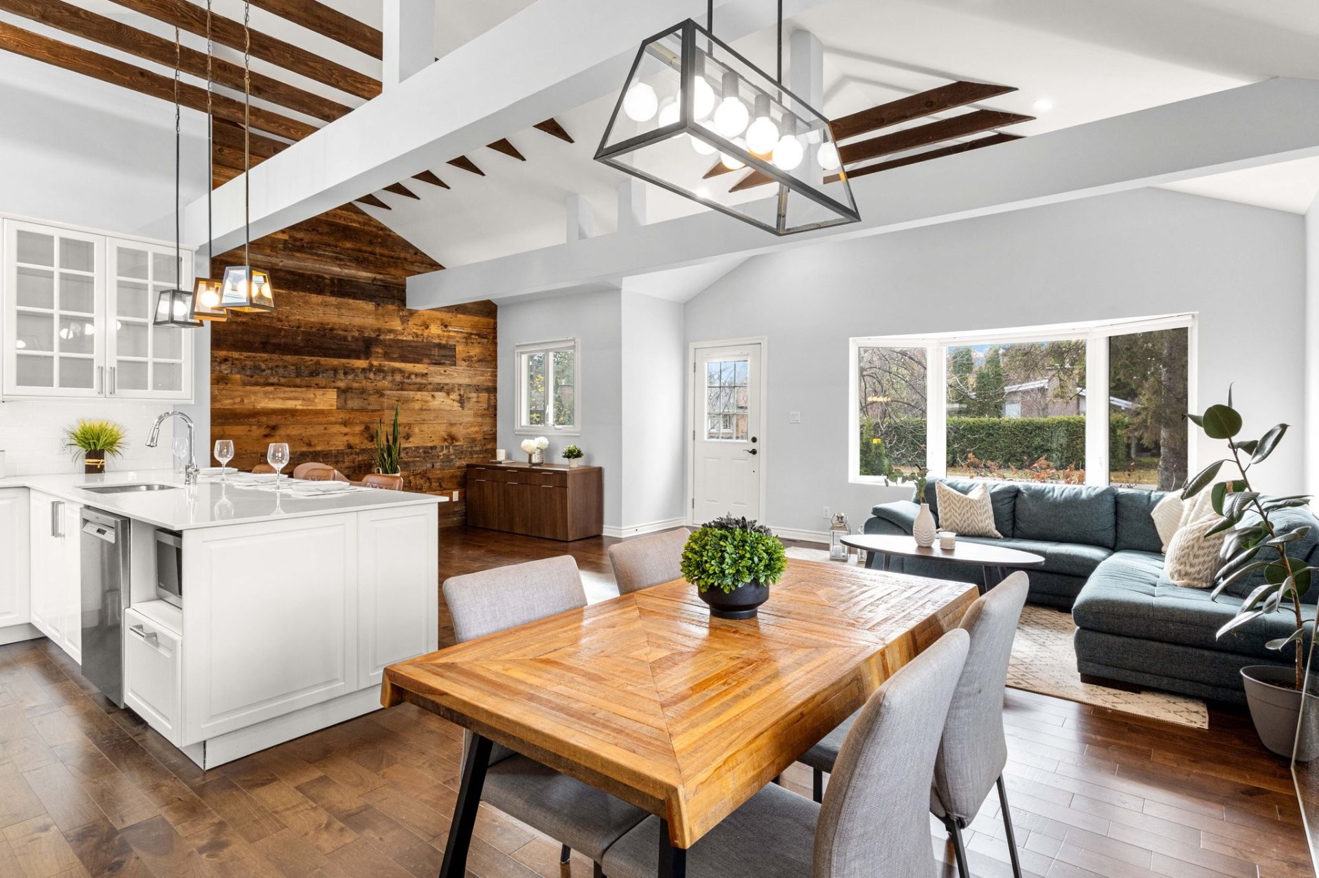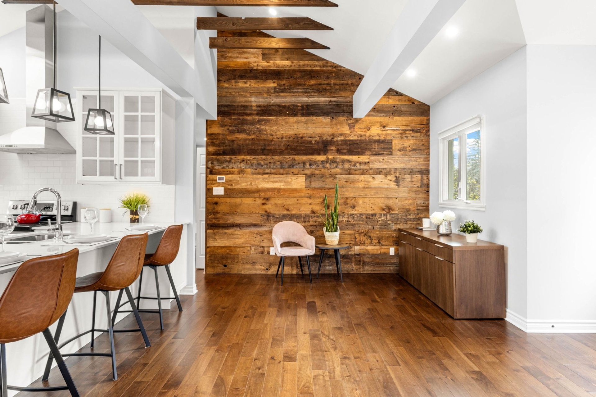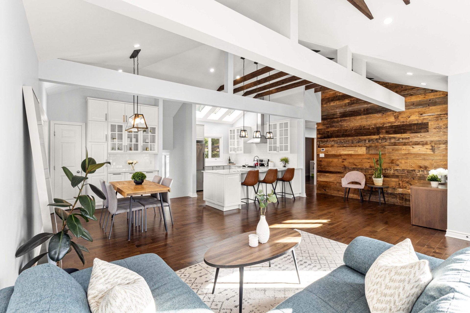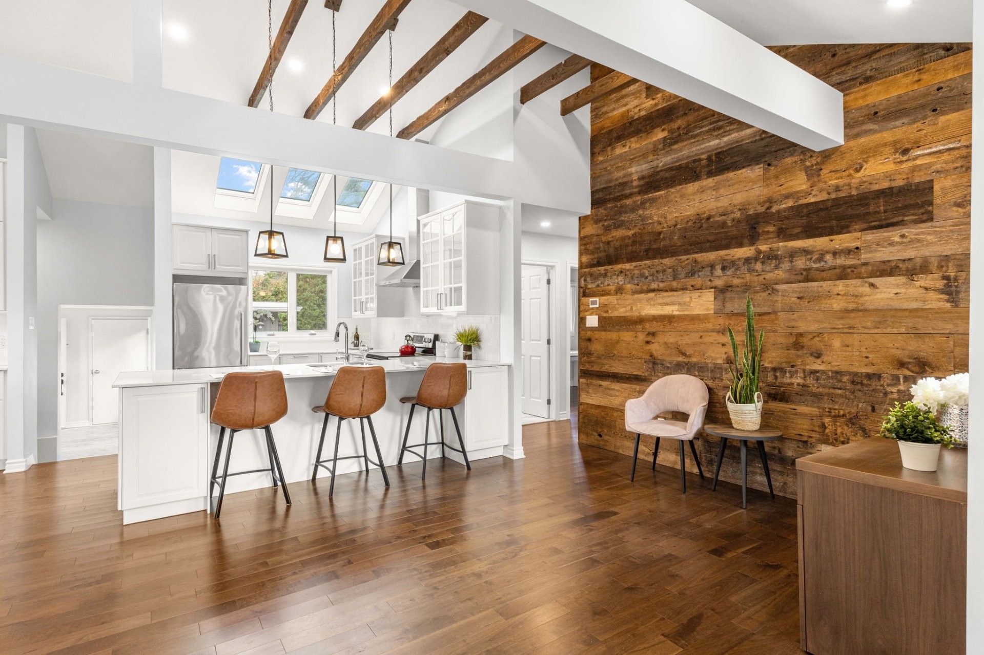 Step inside to a bright, open-concept living area with soaring 14-foot vaulted ceilings, a large bay window, and three skylights that flood the space with natural light. The walnut floors and barnwood accent wall add warmth and character. The modern kitchen is a chef's delight, featuring a 10-foot quartz peninsula, double sink, ample storage including a pantry, and seamless flow into the spacious dining area with custom built-ins - perfect for entertaining. The primary bedroom suite offers generous built-in closets and an ensuite with quartz countertops, a vessel sink, and an oversized rainfall shower. A second bedroom, an additional full bathroom, and a large mudroom with access to the garage, driveway, and backyard complete the main level - providing both functionality and style.