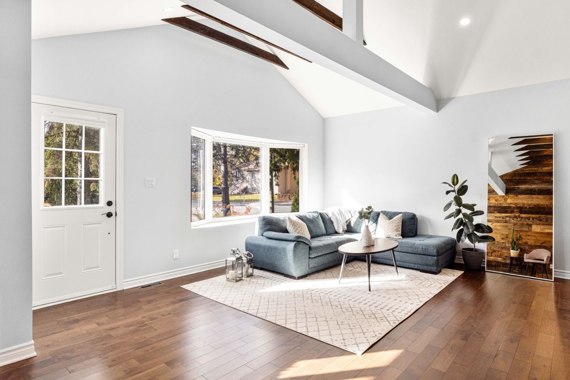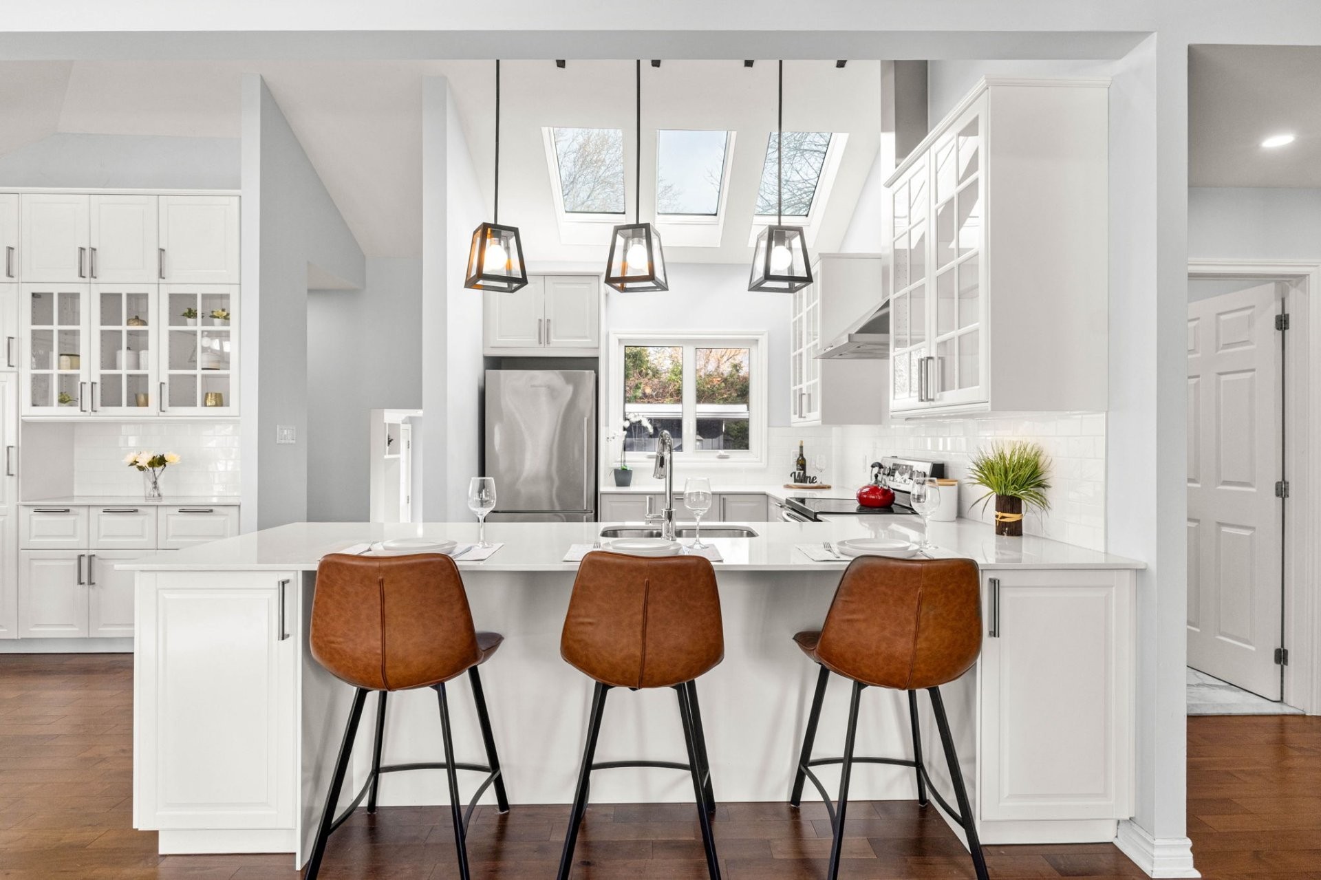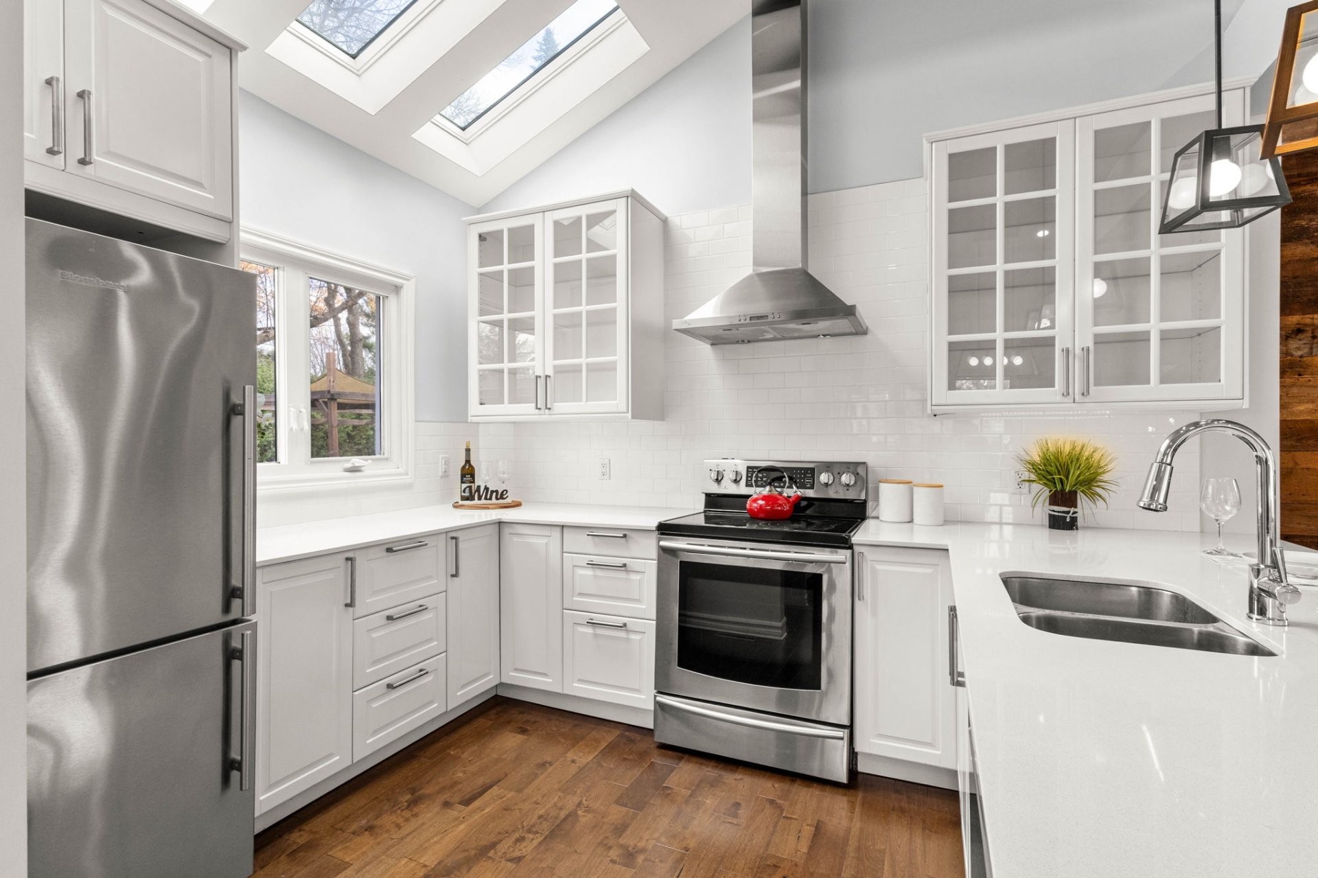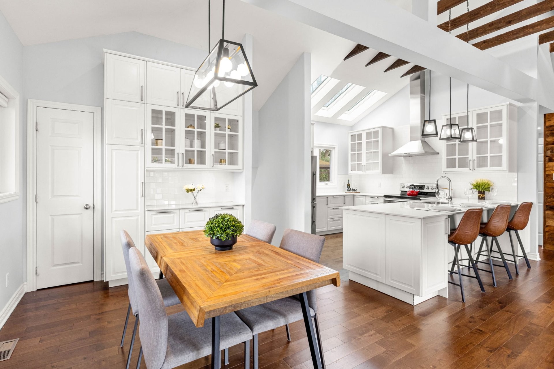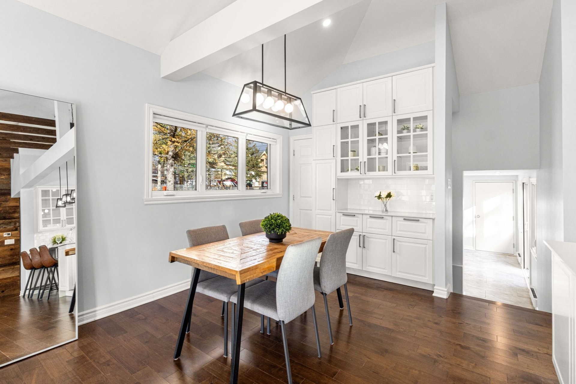 Step inside to a bright, open-concept living area with soaring 14-foot vaulted ceilings, a large bay window, and three skylights that flood the space with natural light. The walnut floors and barnwood accent wall add warmth and character. The modern kitchen is a chef's delight, featuring a 10-foot quartz peninsula, double sink, ample storage including a pantry, and seamless flow into the spacious dining area with custom built-ins - perfect for entertaining. The primary bedroom suite offers generous built-in closets and an ensuite with quartz countertops, a vessel sink, and an oversized rainfall shower. A second bedroom, an additional full bathroom, and a large mudroom with access to the garage, driveway, and backyard complete the main level - providing both functionality and style.