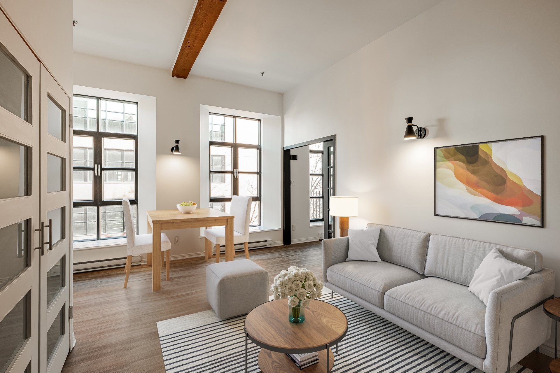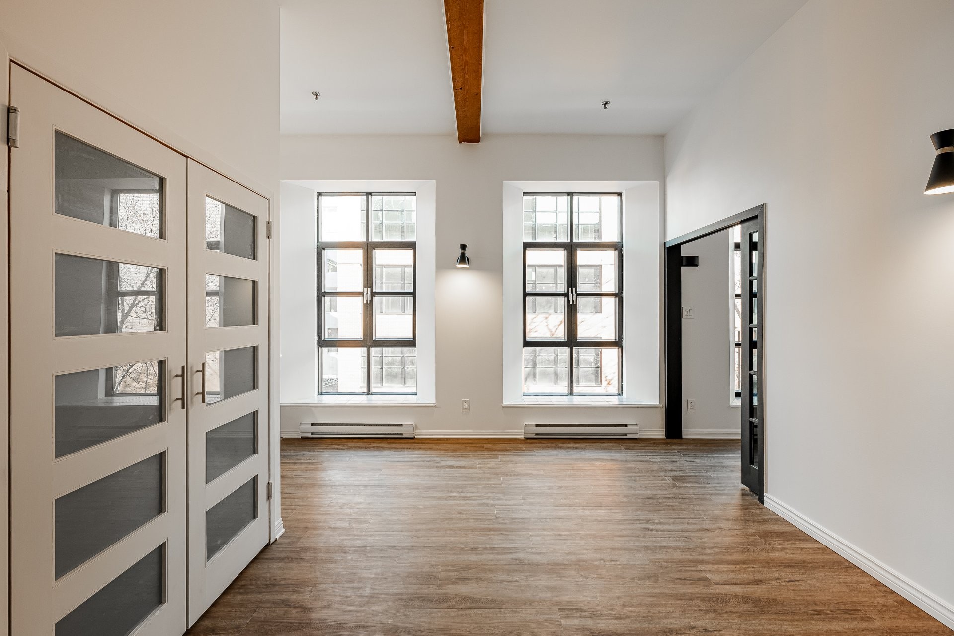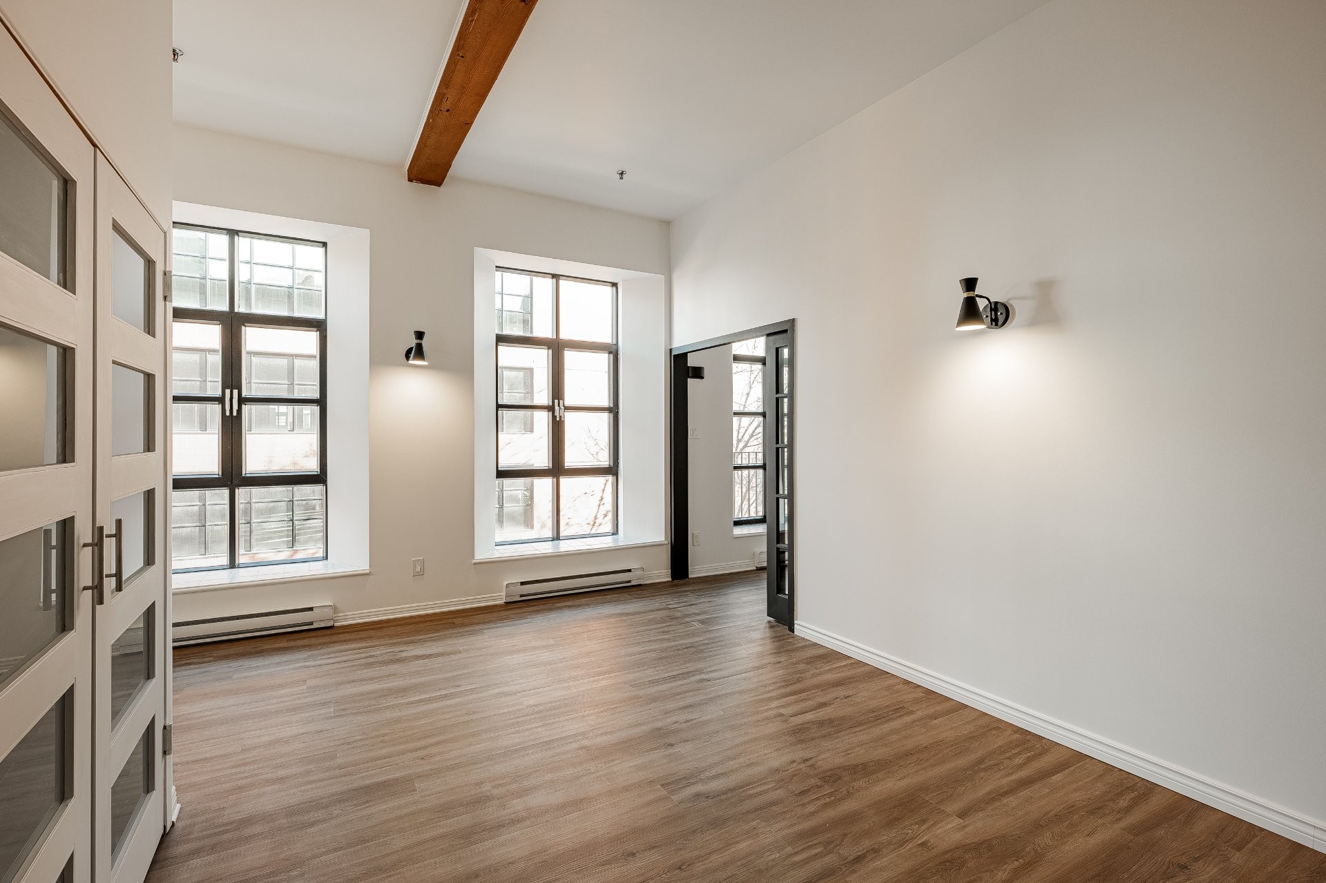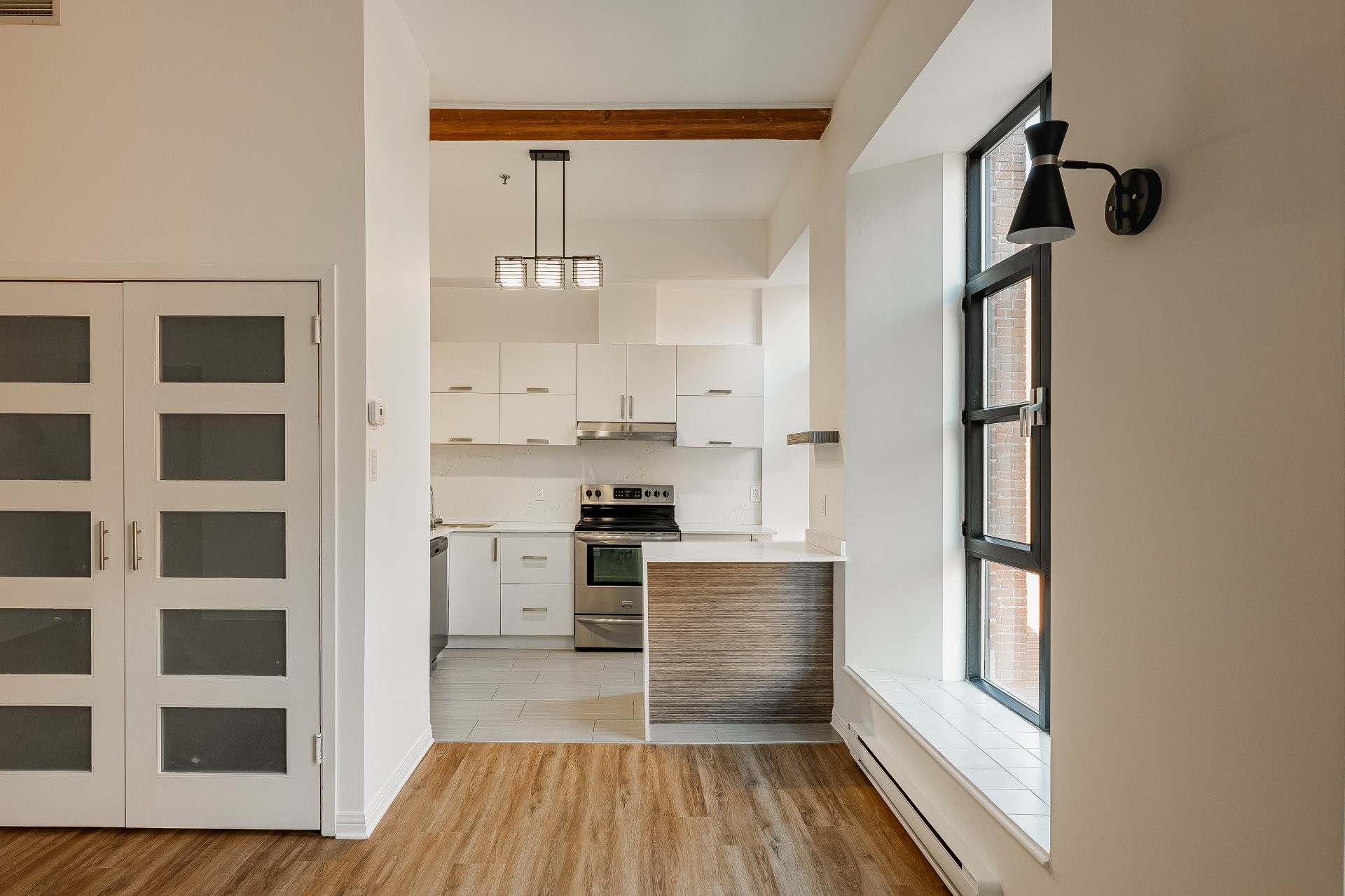 Stunning 3rd floor condo at the Corticelli Lofts! Located in the vibrant community of Pointe-Saint-Charles. A condo complex perched along the Lachine canal with integrated waterways flowing amongst the buildings - unlike anything in Montreal! One bedroom condo with separate office. New flooring, quartz kitchen counters and A/C system. Wood beams & over 10 feet high ceilings accented with tall black windows - a hallmark esthetic of this historic building's origin. Enjoy views from the 3rd floor of the trees & peaceful waterway below. Storage locker and parking tag for the complex's communal parking lot included! Available immediately.