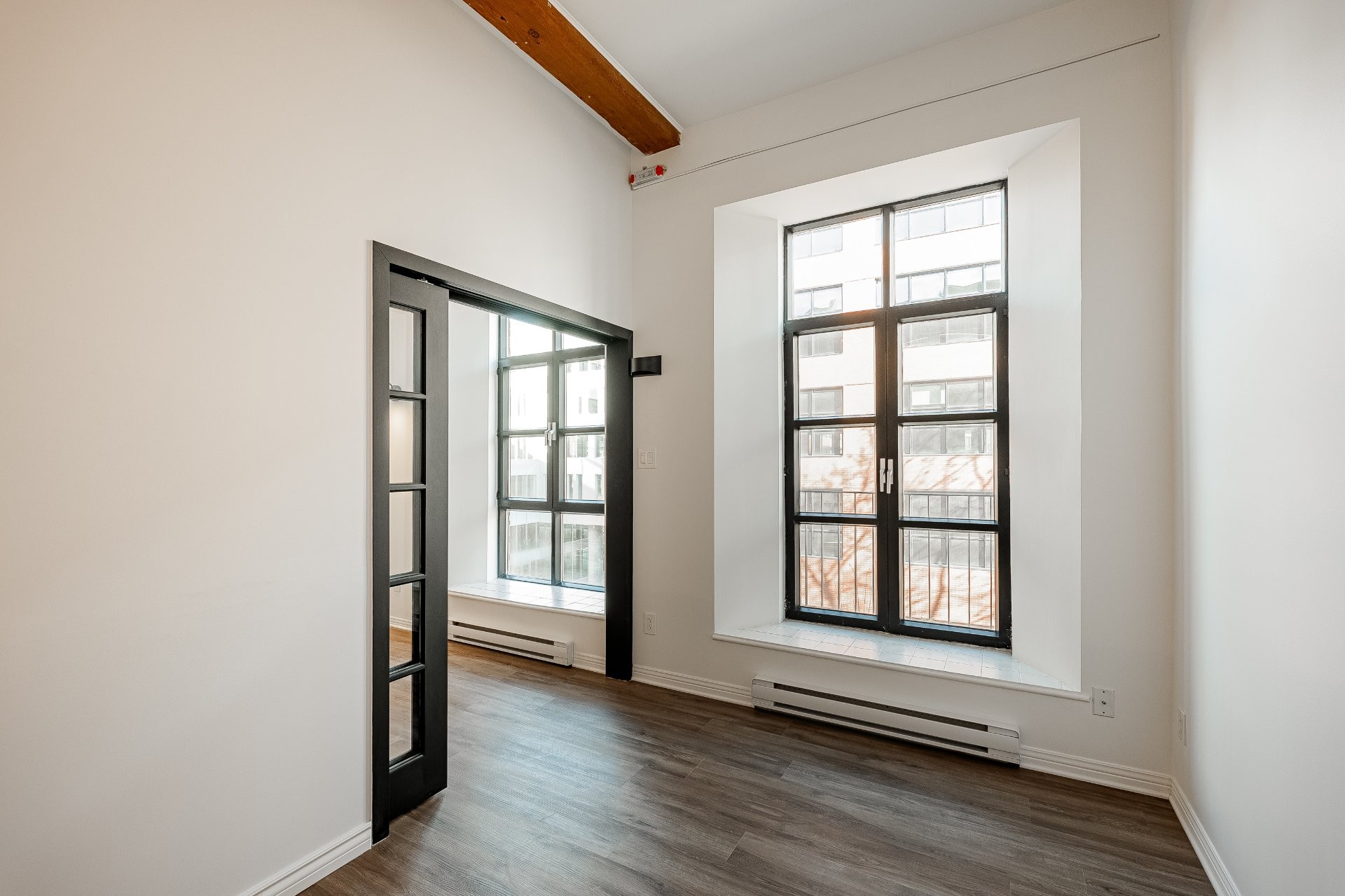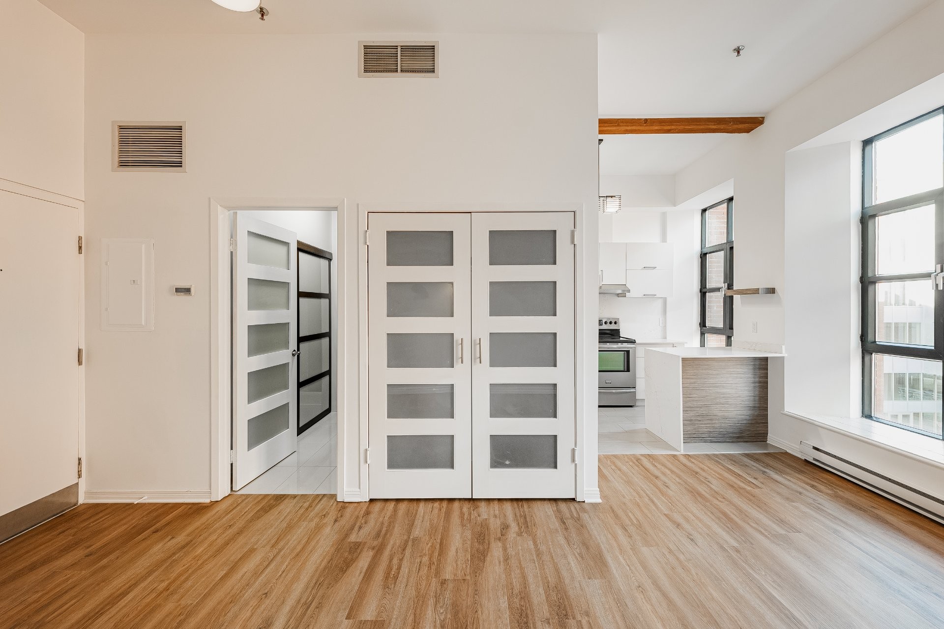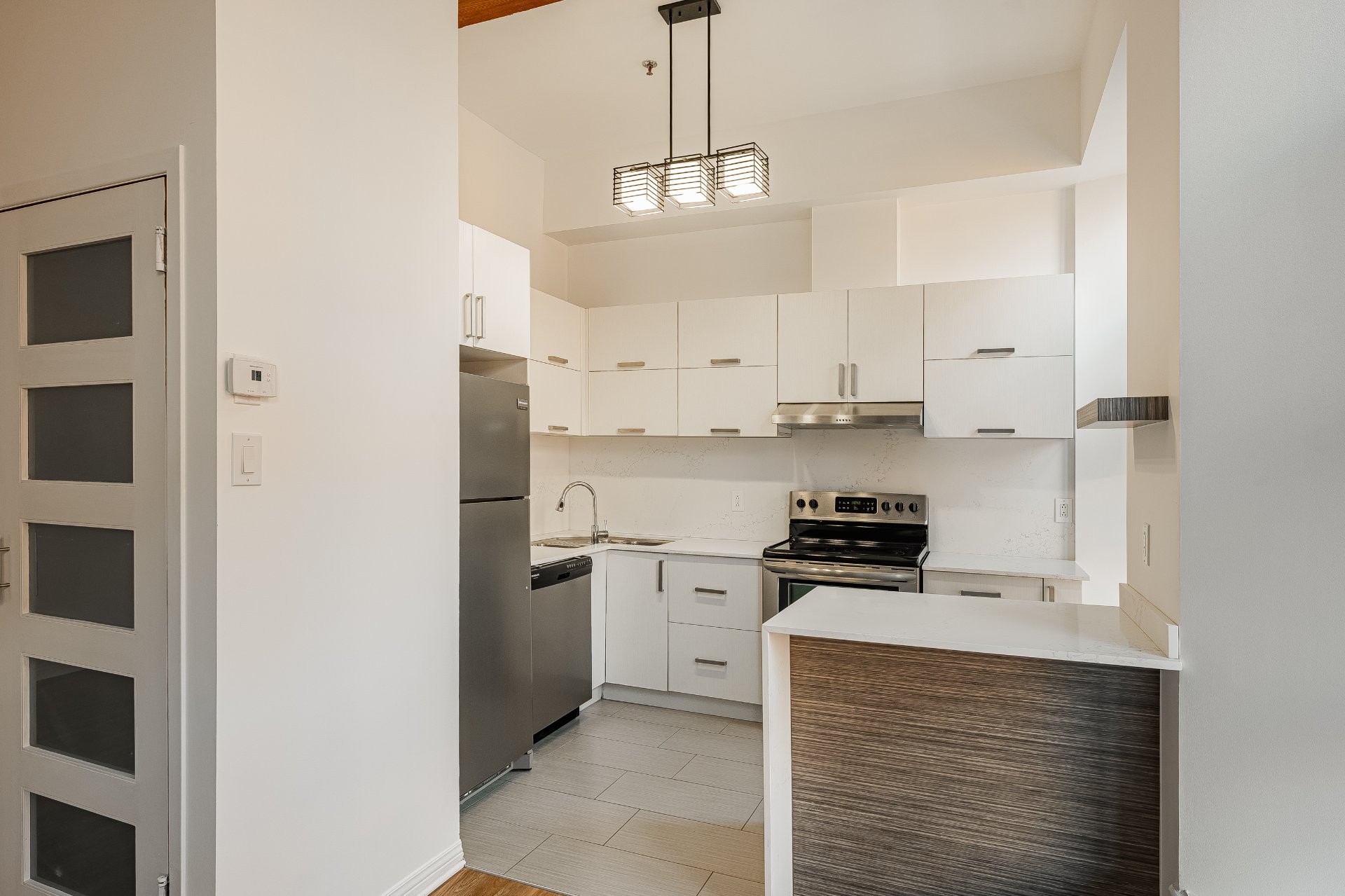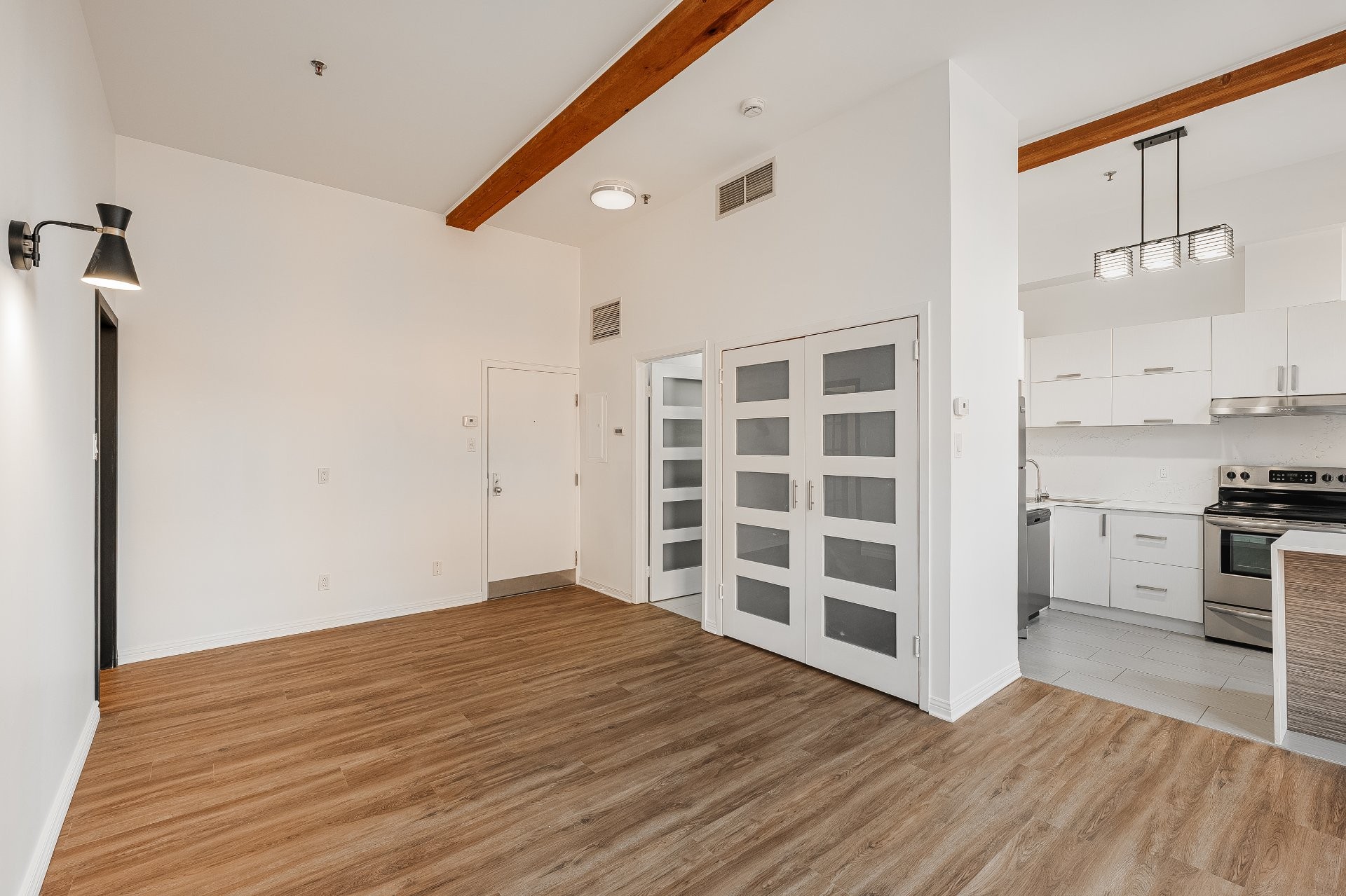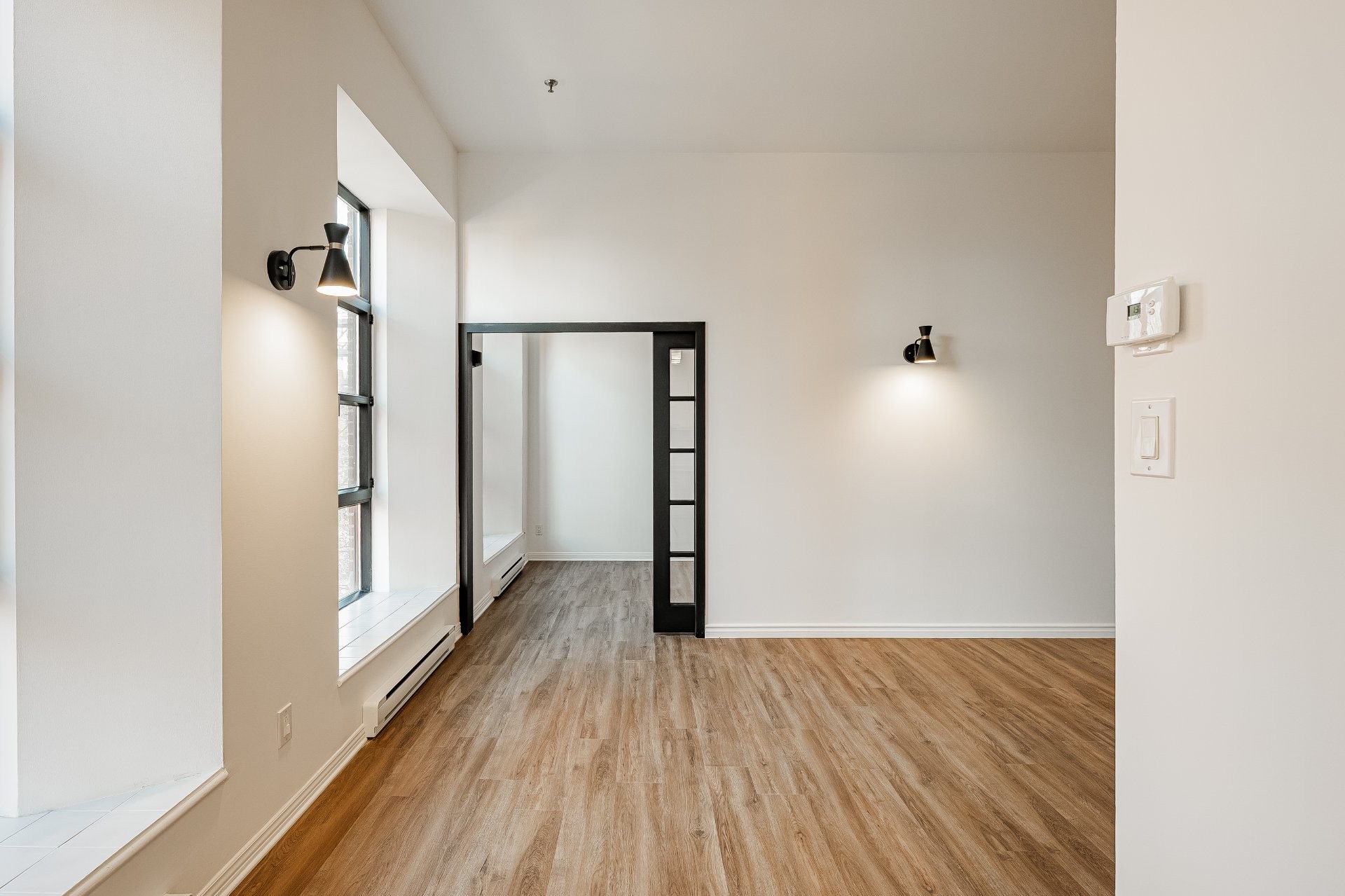Stunning 3rd floor condo at the Corticelli Lofts! Located in the vibrant community of Pointe-Saint-Charles. A condo complex perched along the Lachine canal with integrated waterways flowing amongst the buildings - unlike anything in Montreal! One bedroom condo with separate office. New flooring, quartz kitchen counters and A/C system. Wood beams & over 10 feet high ceilings accented with tall black windows - a hallmark esthetic of this historic building's origin. Enjoy views from the 3rd floor of the trees & peaceful waterway below. Storage locker and parking tag for the complex's communal parking lot included! Available immediately.