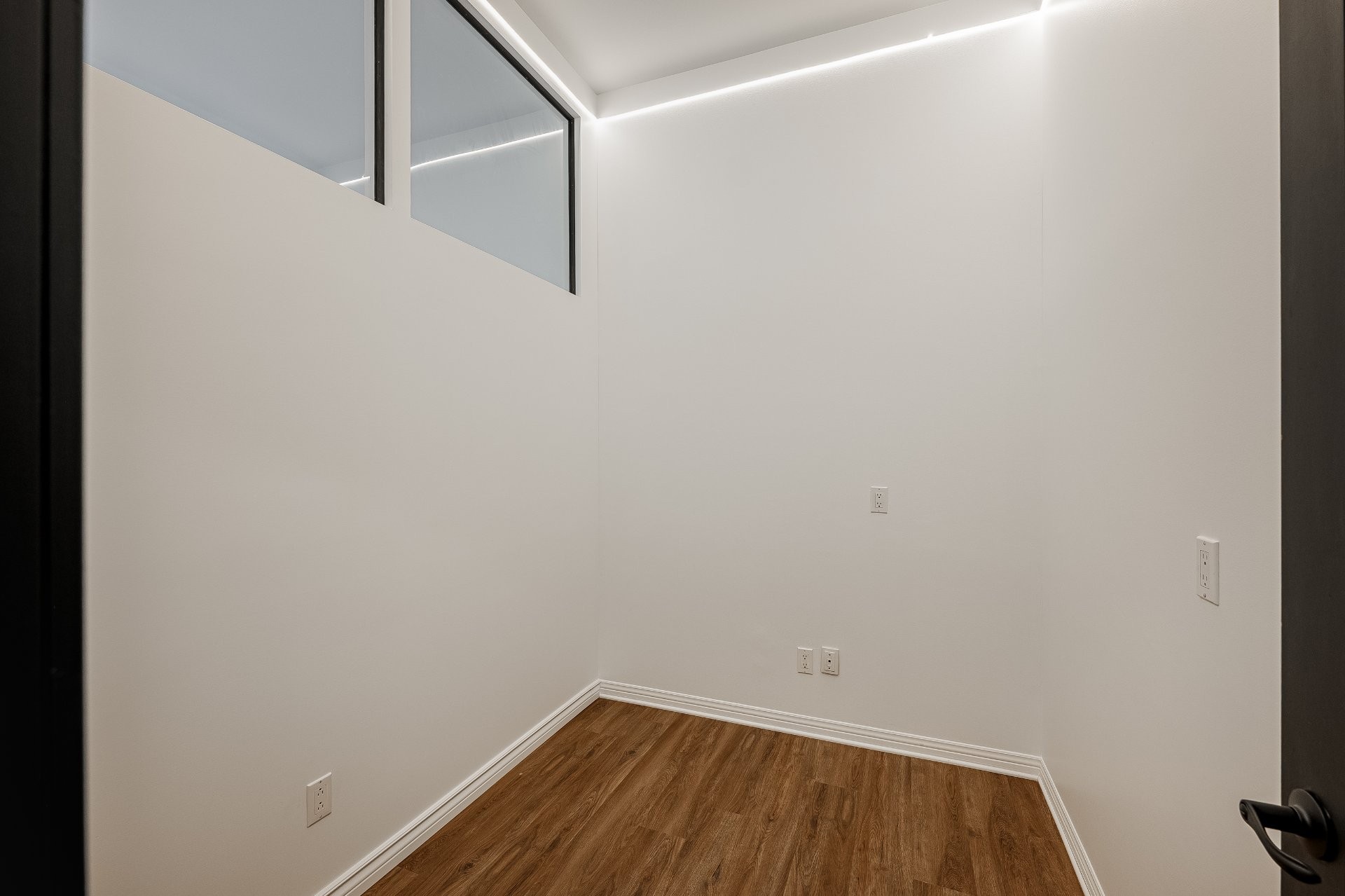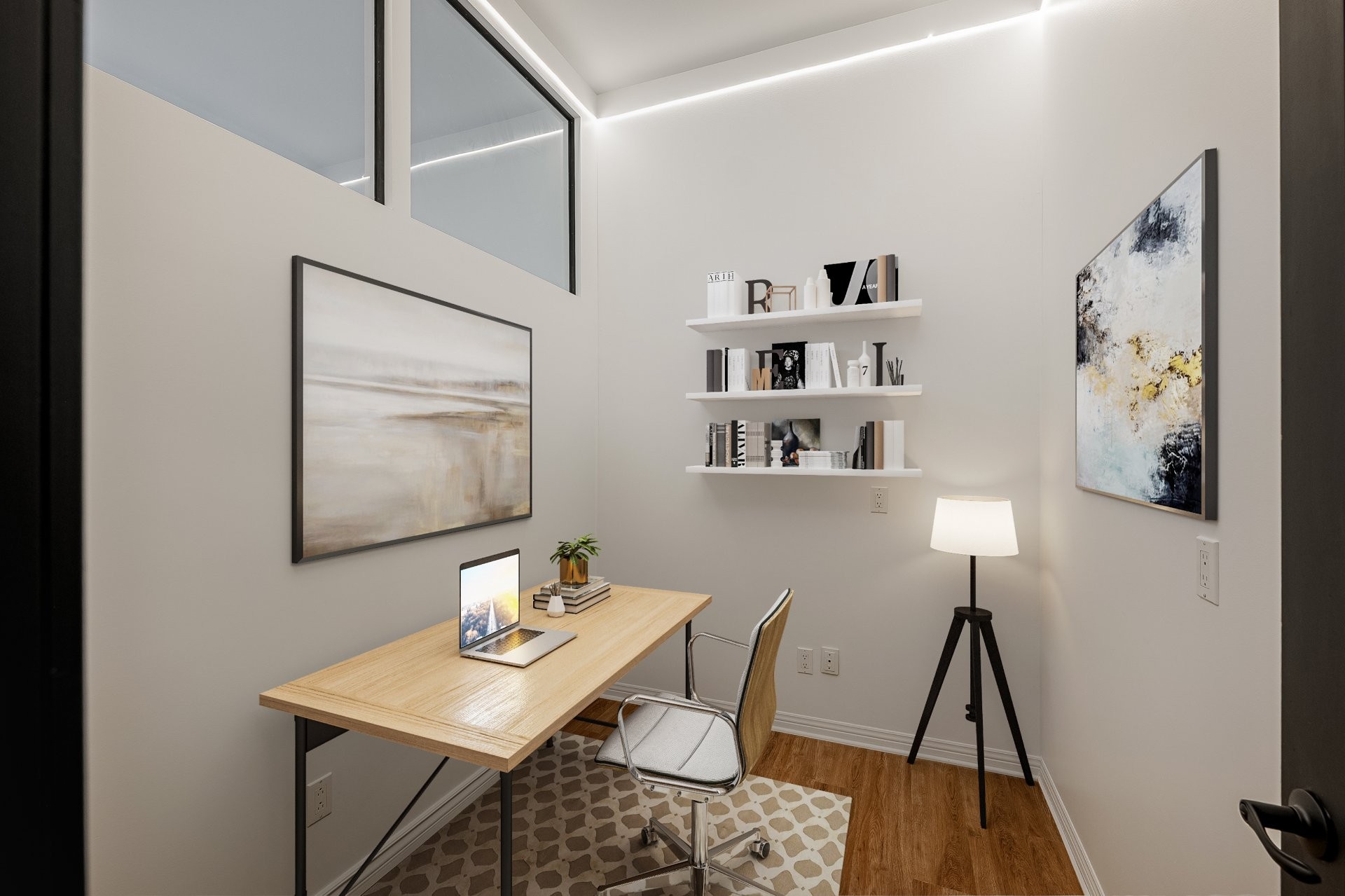 A renovated space of 547 sq. ft. with one closed bedroom and a separate office space.