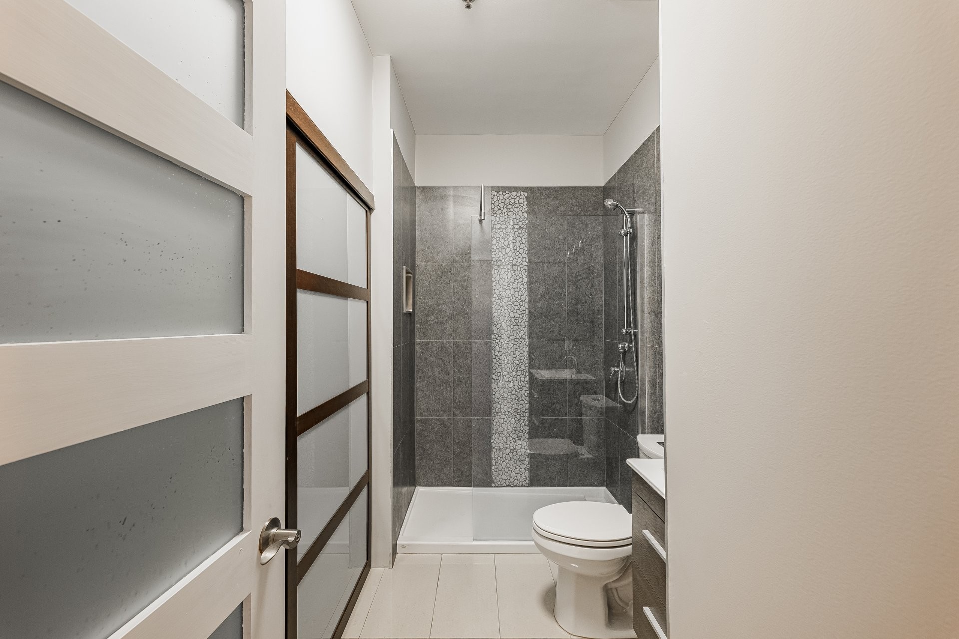 The sleek bathroom with ceramic and glass panel shower houses the washer & dryer laundry closet.