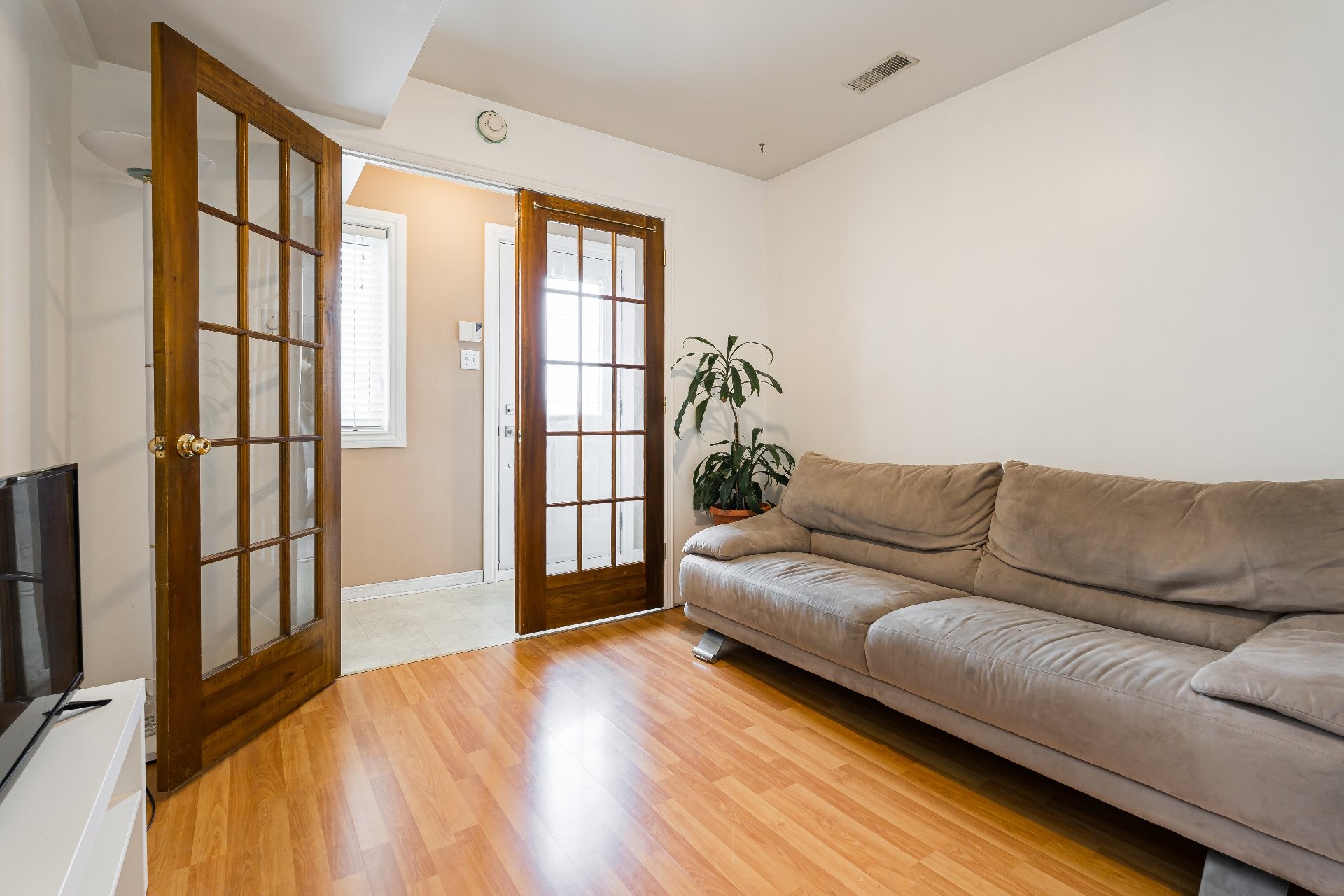 Back at the entrance level, to the right, you'll find the fully integrated family suite along with access to the single-car garage. The suite is perfect for extended family or guests, and includes a bright living room, a well-equipped kitchen, a bedroom, a full bathroom, and direct patio access to the backyard for added independence and convenience.