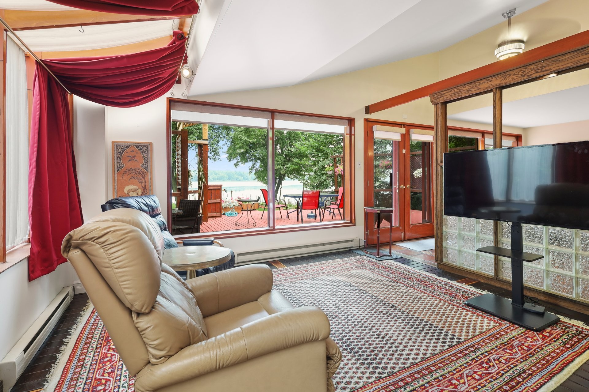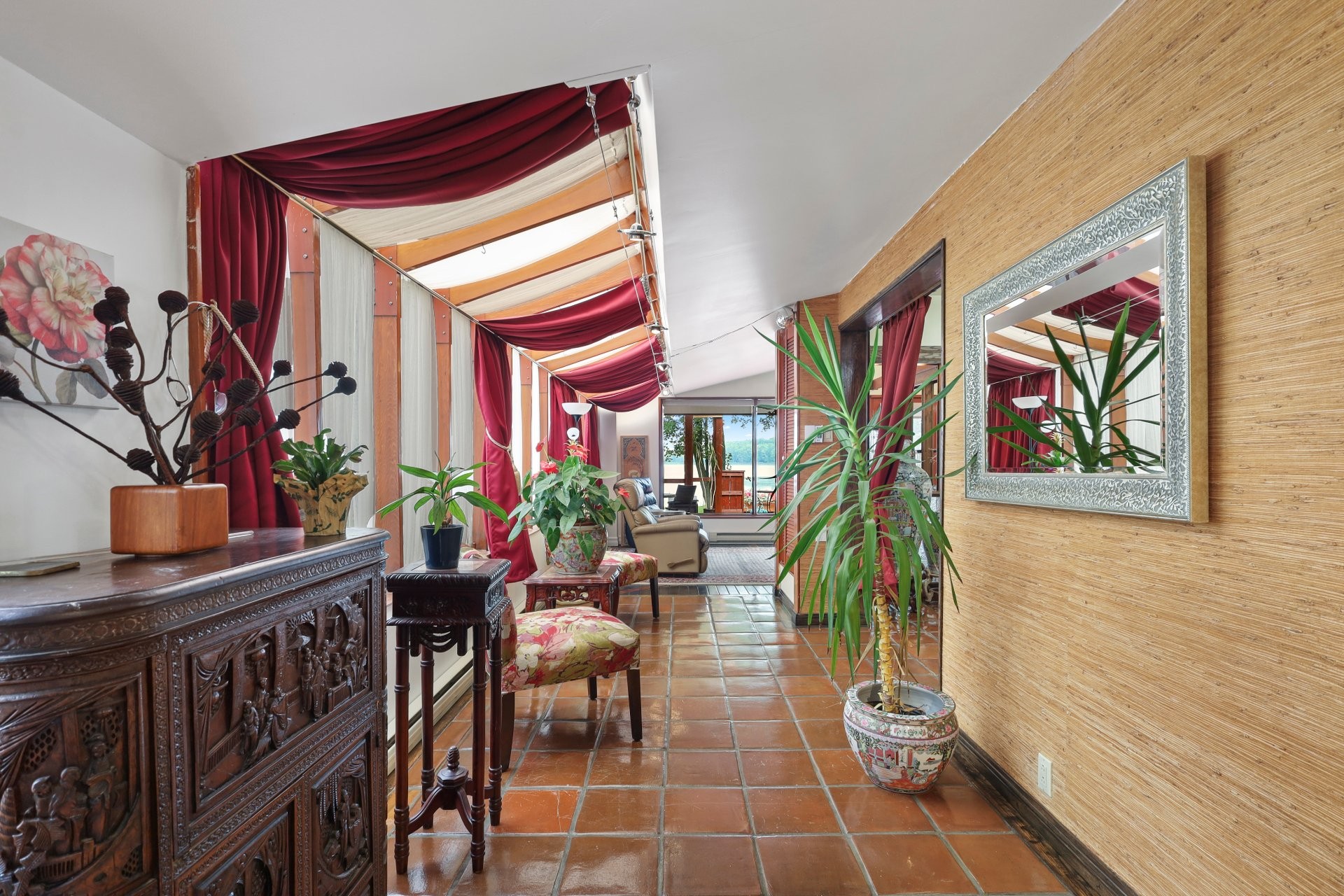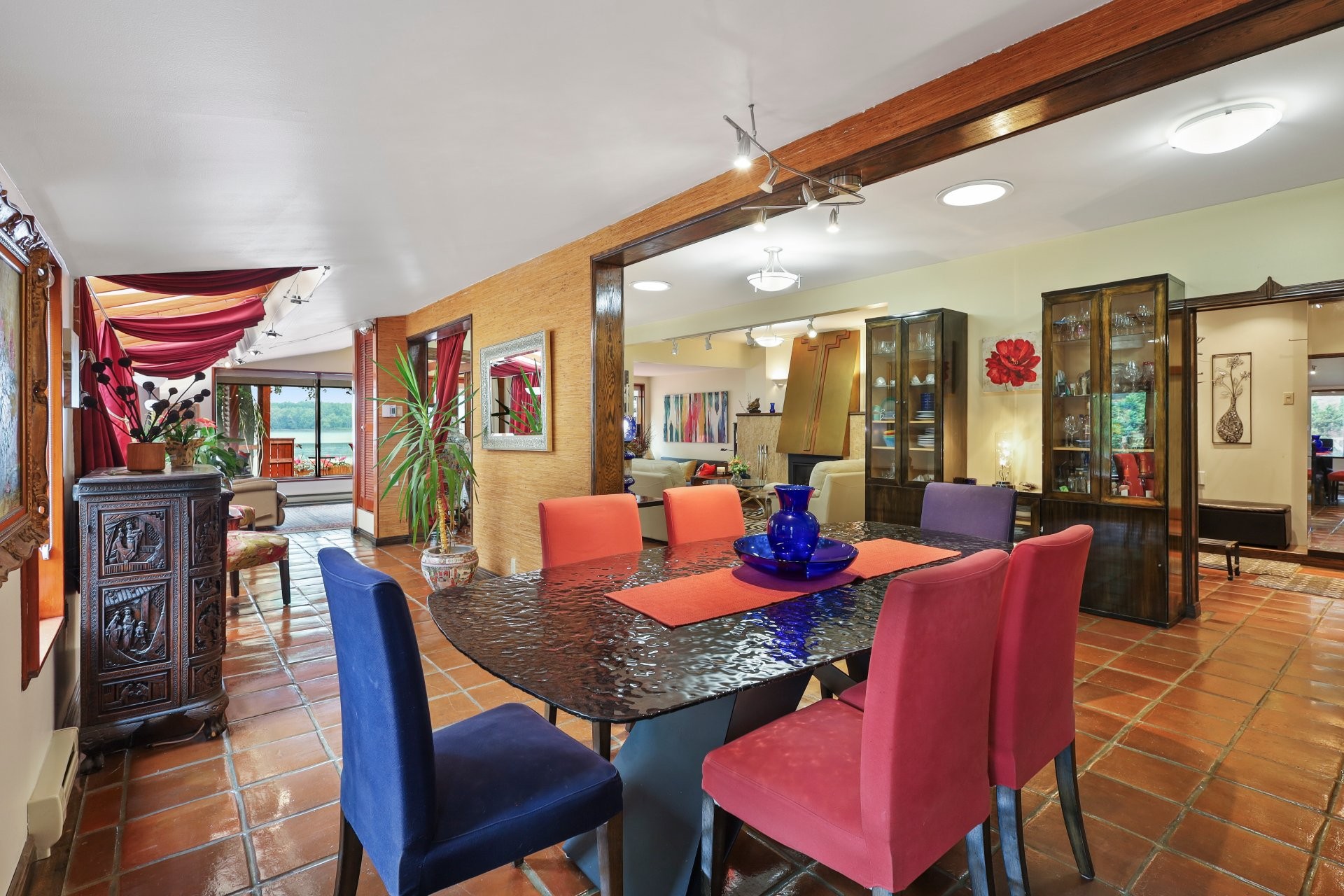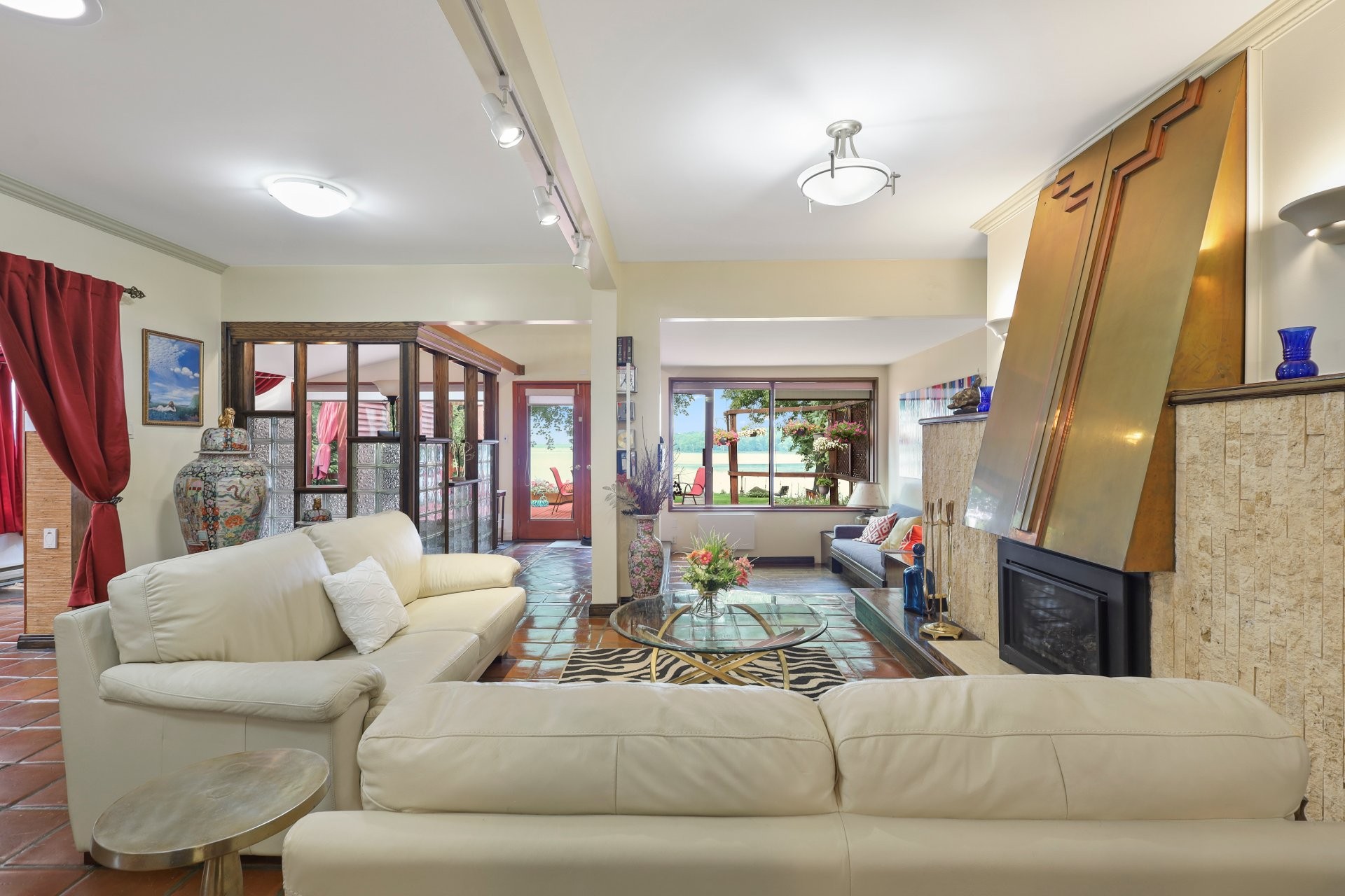 The main floor showcases terracotta floors, custom wooden doors with etched glass, and an open-concept layout with sweeping water views. The spacious living room is enhanced by a gas fireplace and a sunken sitting area (8'11 x 9'10) with hardwood floors. The dining room flows into a solarium, and a cozy den with glass brick walls offers serene views of the outdoors.