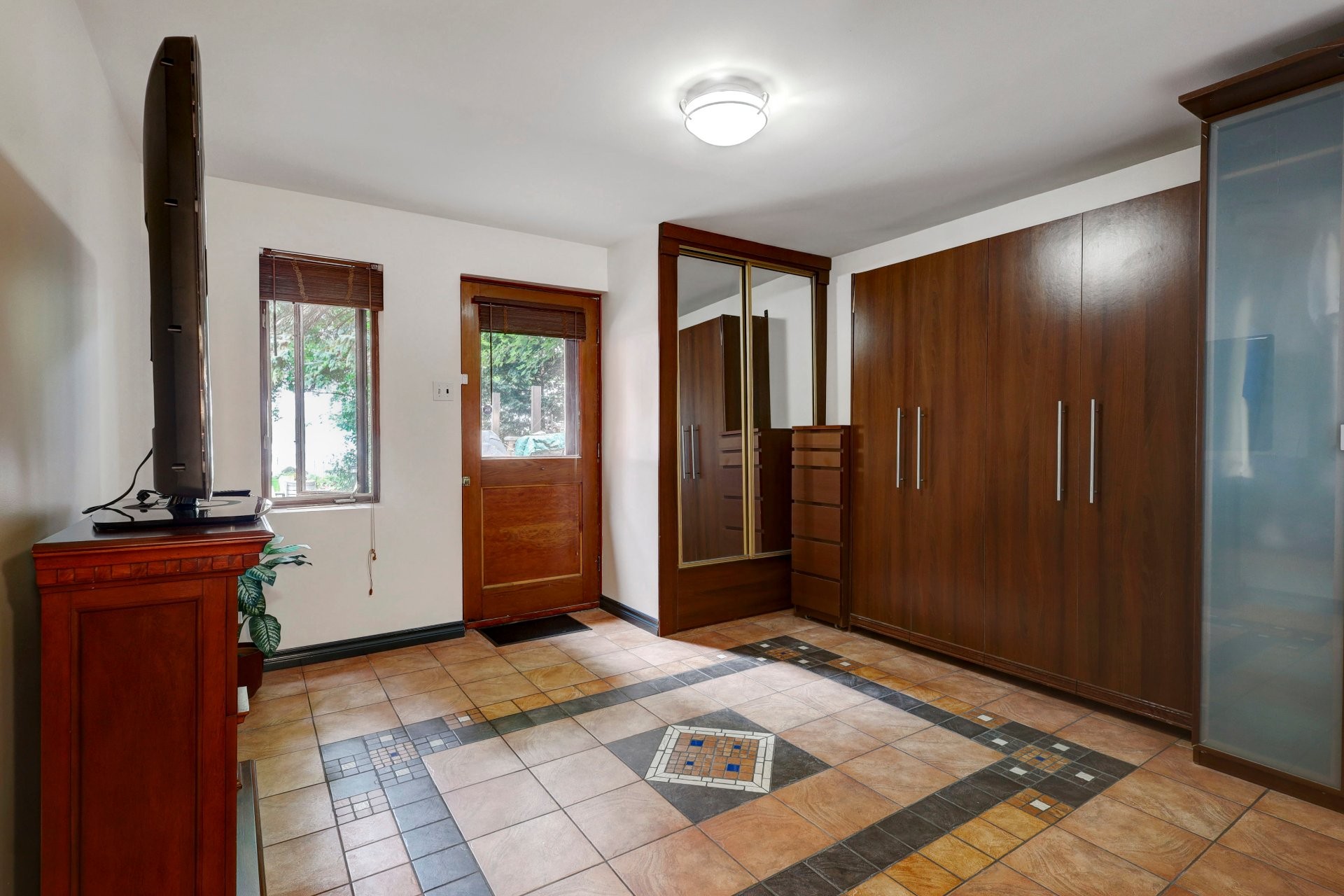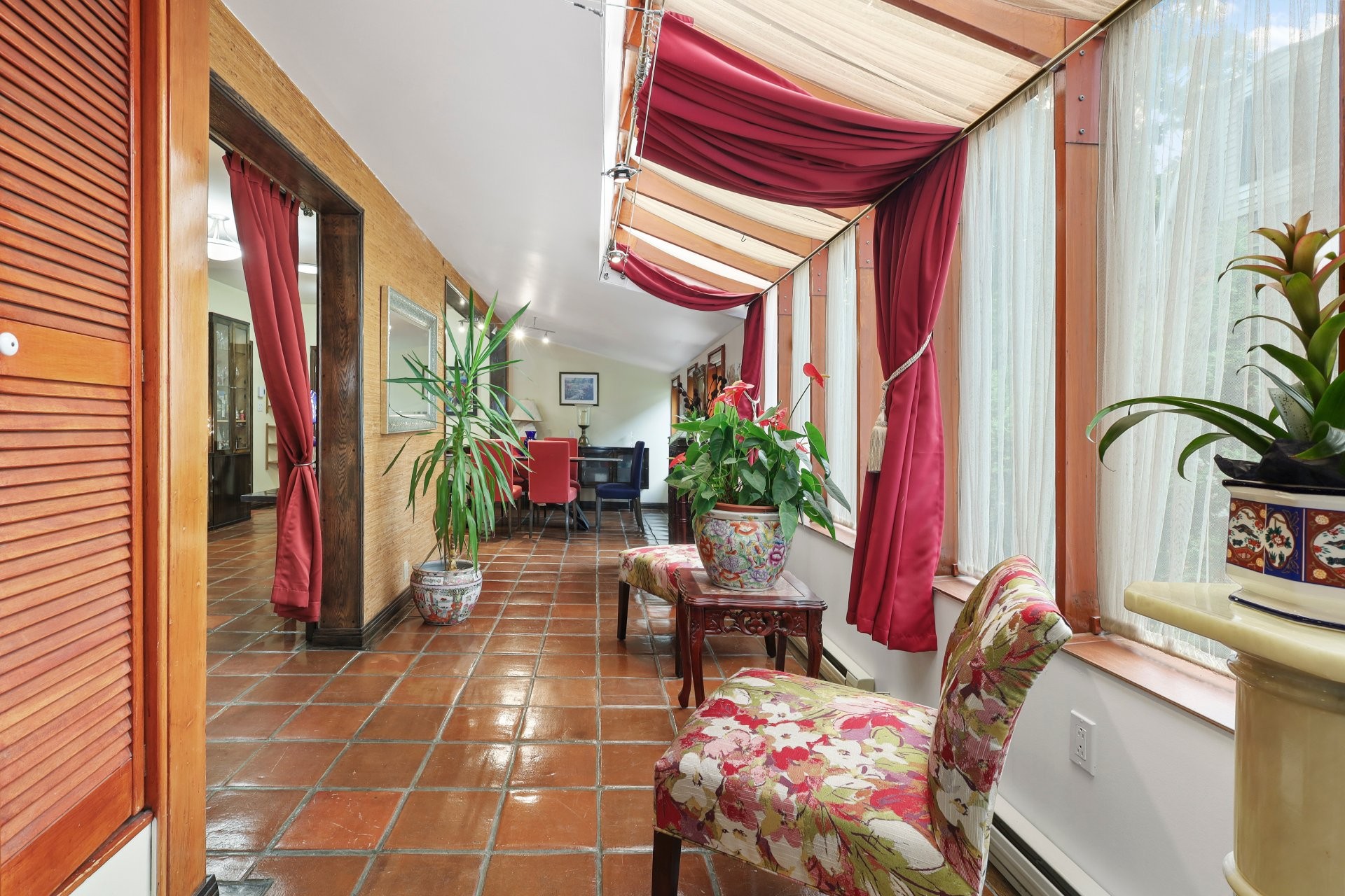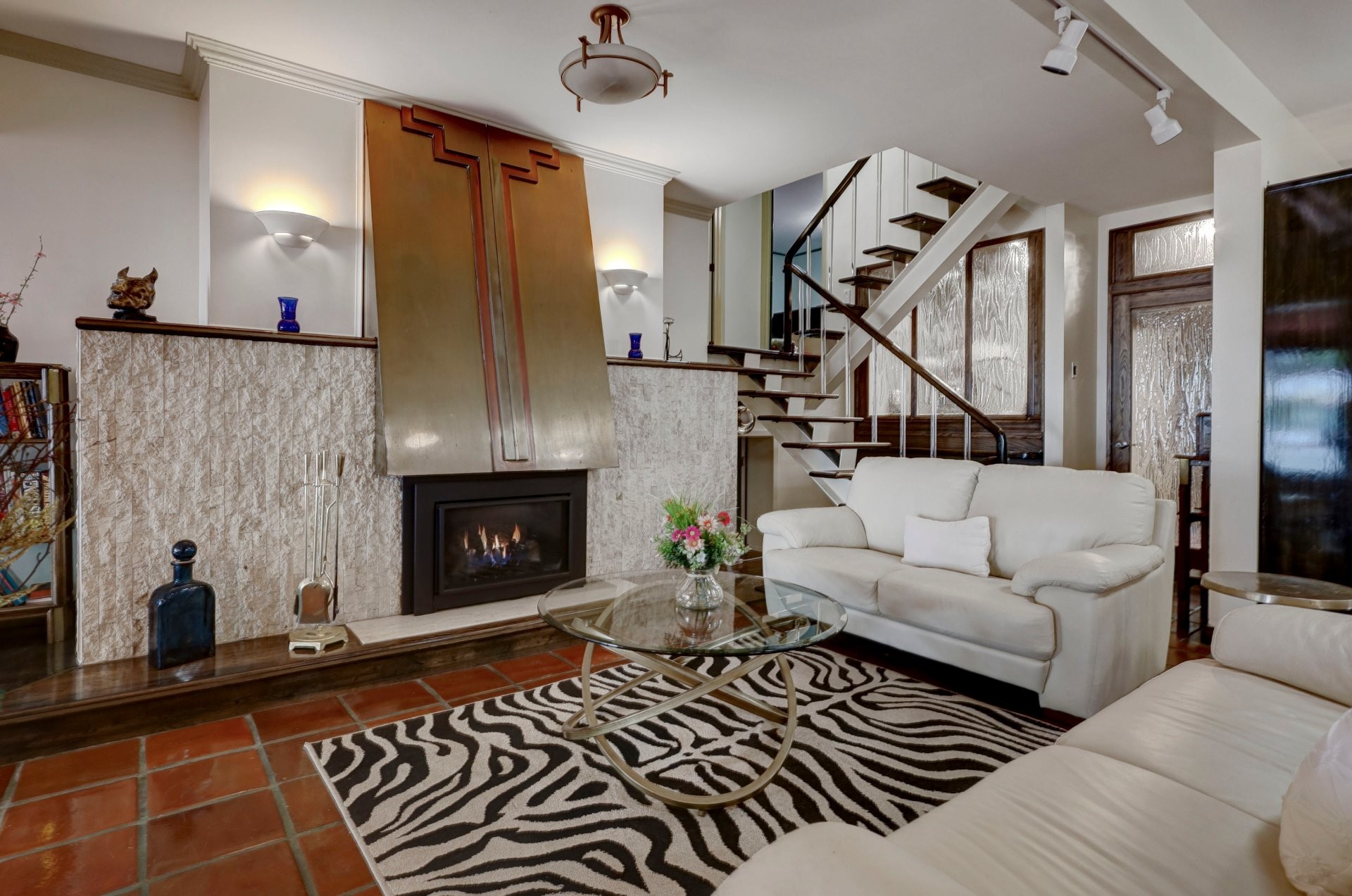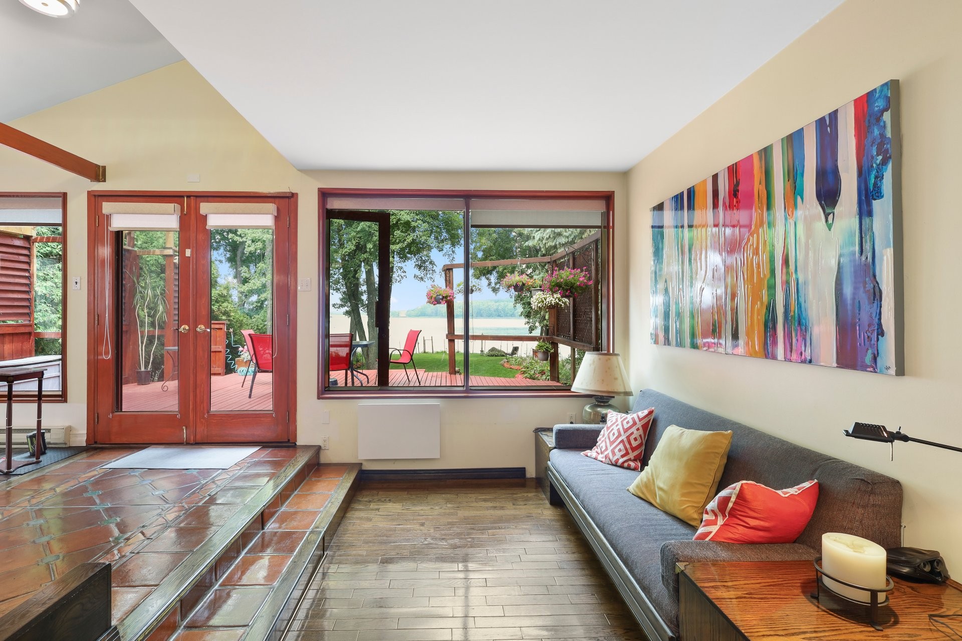 The main floor showcases terracotta floors, custom wooden doors with etched glass, and an open-concept layout with sweeping water views. The spacious living room is enhanced by a gas fireplace and a sunken sitting area (8'11 x 9'10) with hardwood floors. The dining room flows into a solarium, and a cozy den with glass brick walls offers serene views of the outdoors.