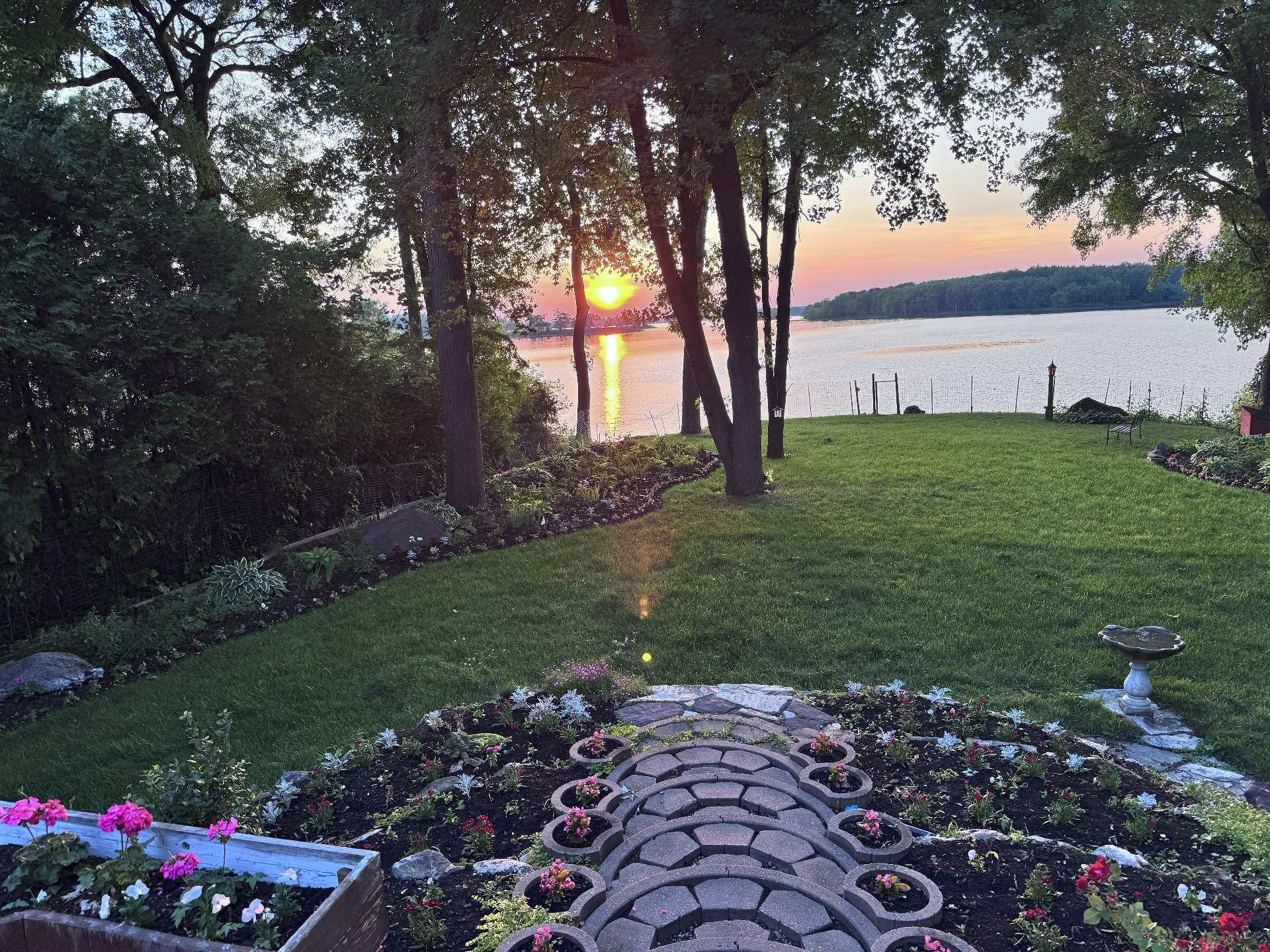 E Avenue, this charming brick and cedar home is set in a serene location, offering 65 linear feet of waterfront with panoramic views. A pavi-uni driveway leads to the property, which features front and rear balconies, ideal for enjoying the peaceful surroundings.