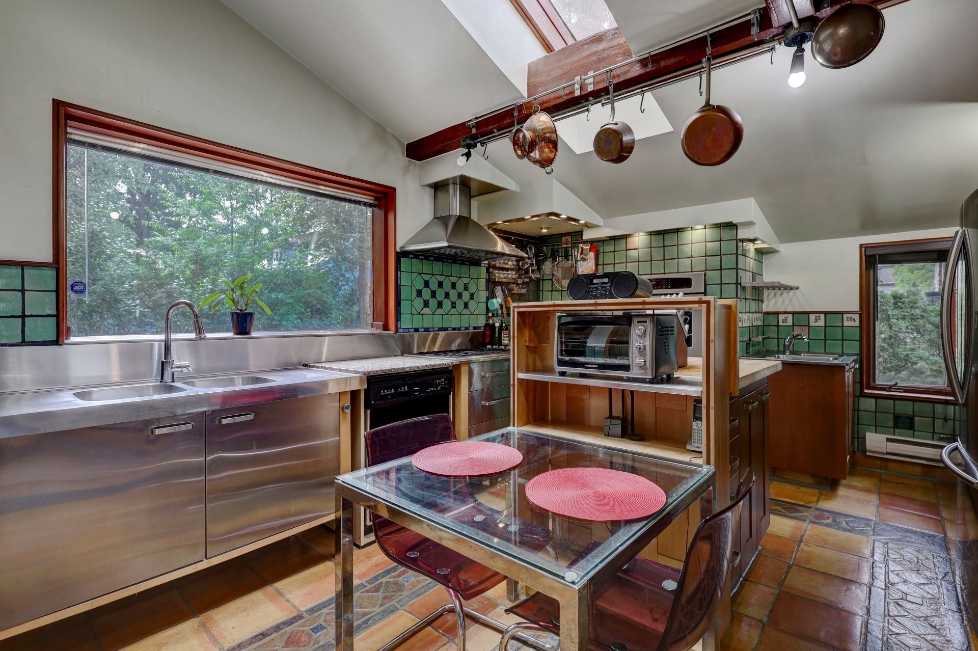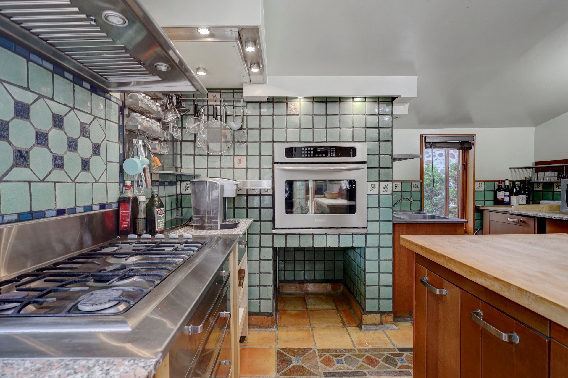 The functional kitchen features vaulted ceilings, granite countertops, a gas stove, a center island with seating, and built-in butcher block.