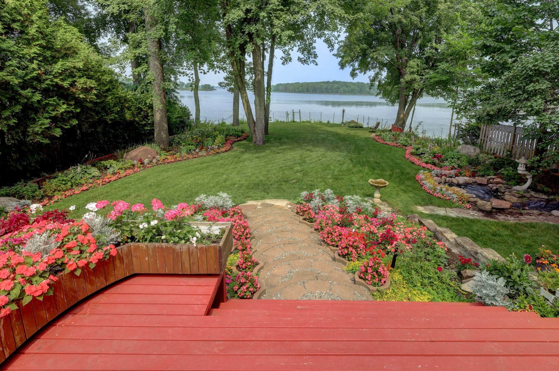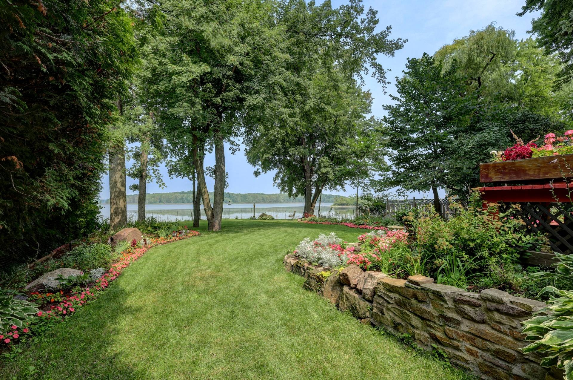Double doors off the living room and den open to a meticulously landscaped yard with a 27'x16' wooden deck and a lower-level river rock patio. The property also includes a unique irrigation system that draws water from the lake.