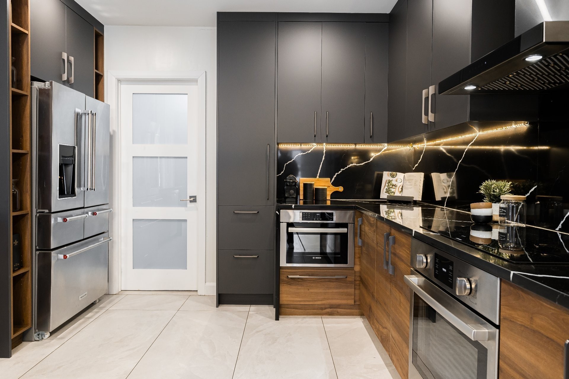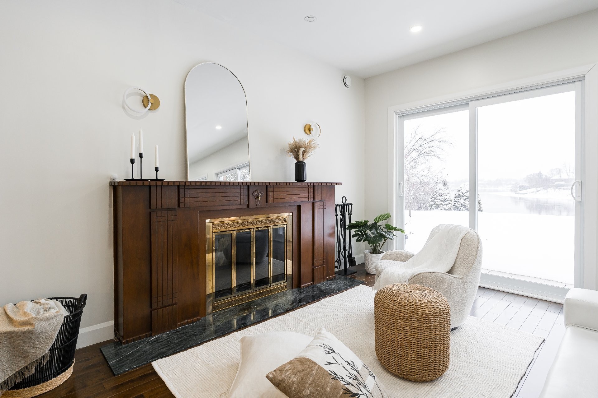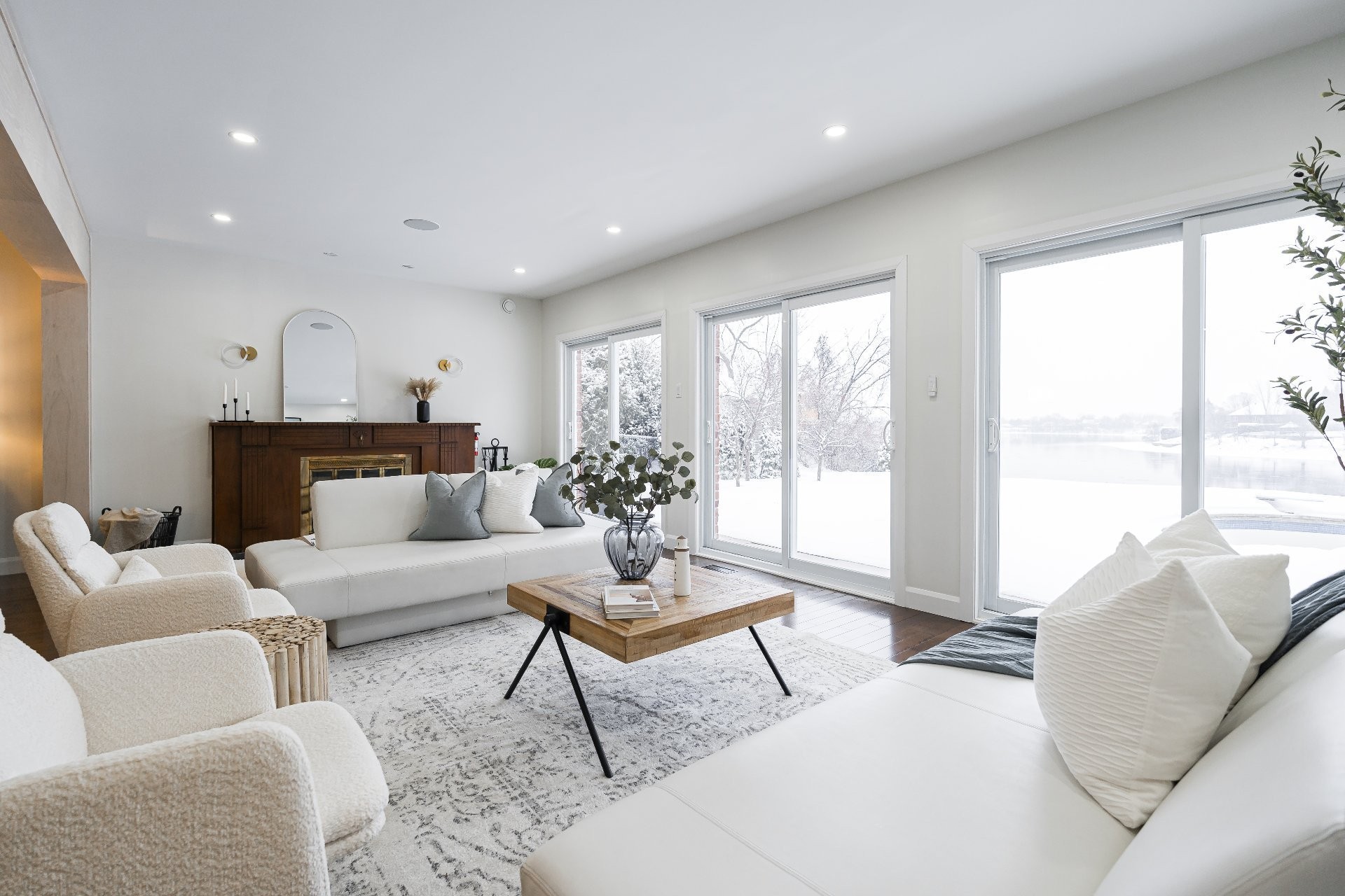 The main floor is anchored by sweeping vistas of the backyard and waterfront, framed by three grand patio doors that grace the formal living and dining rooms. The living room also features a charming wood-burning fireplace, adding warmth and character to the space. The chef's kitchen is a true masterpiece, complemented by a convenient mudroom/laundry room with direct access to the garage.