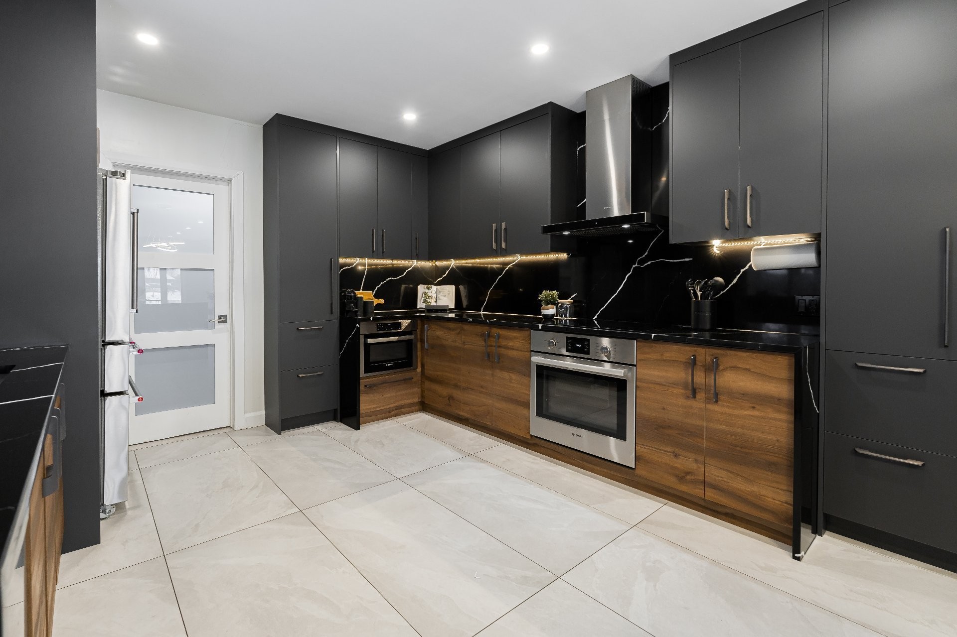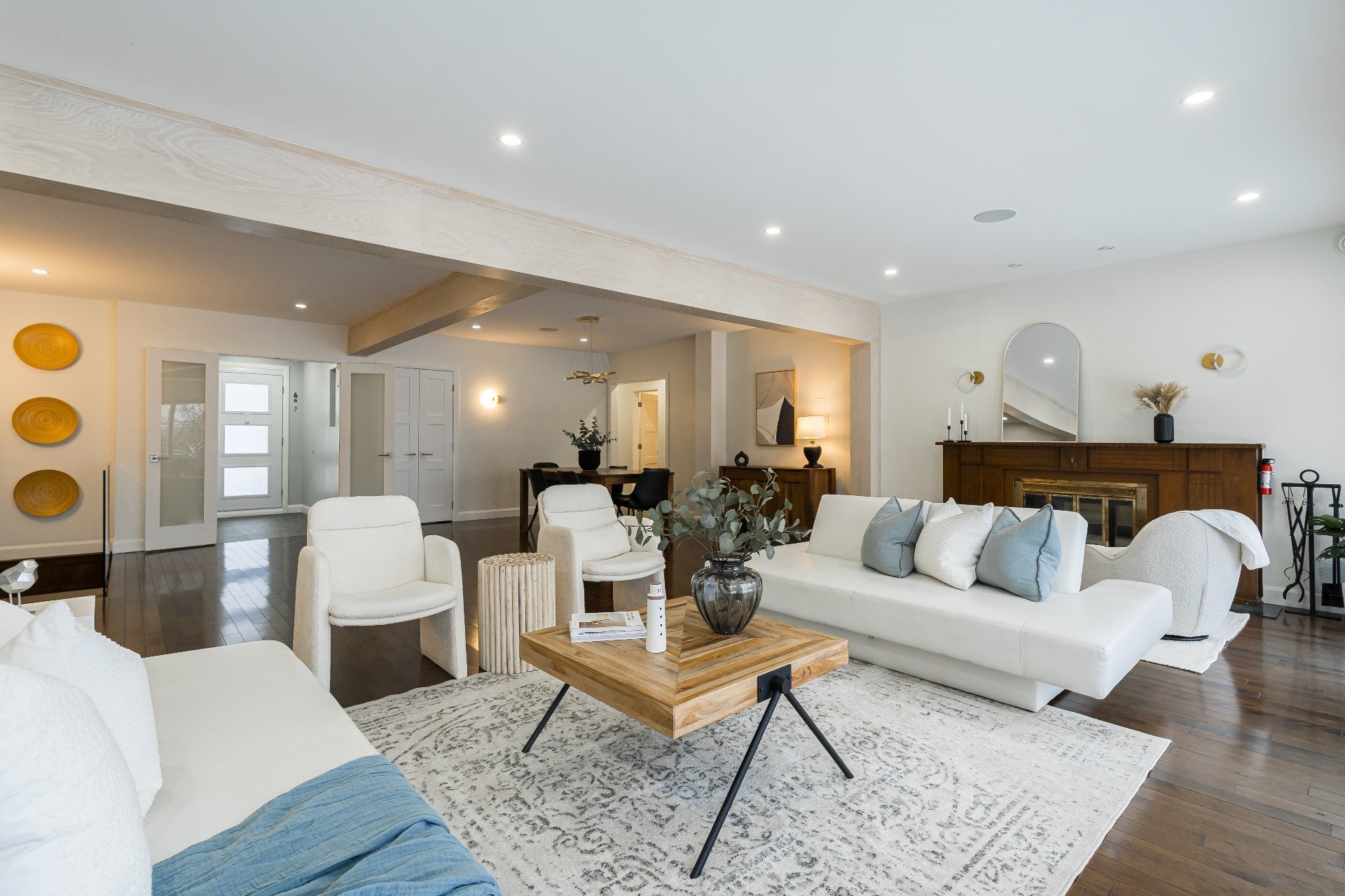 The lower level is equally impressive, offering a second full kitchen with abundant storage, a dining area, a family room featuring a second wood-burning fireplace, a home gym/TV room, a large office, an additional three bedrooms and a full bathroom with a sauna.