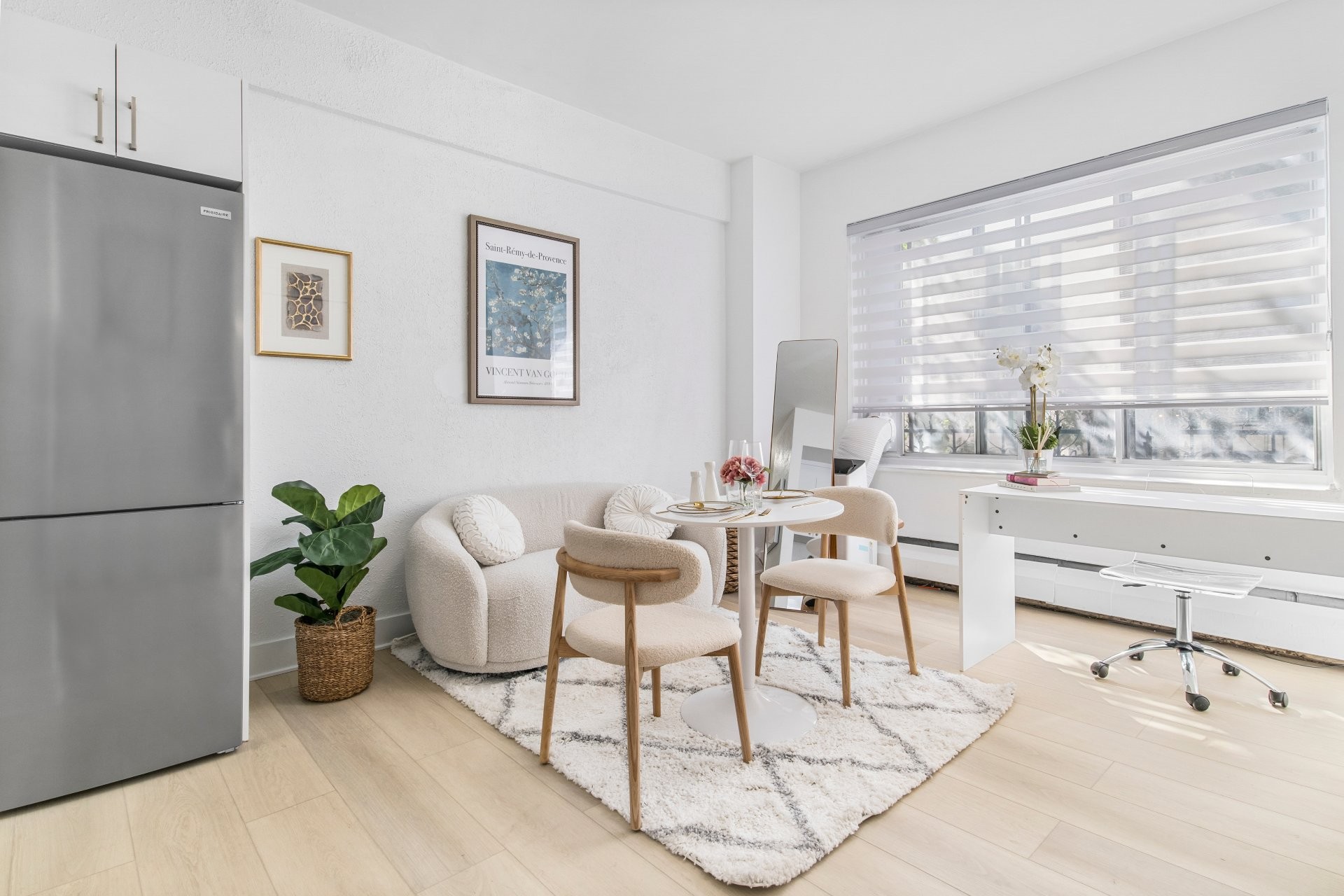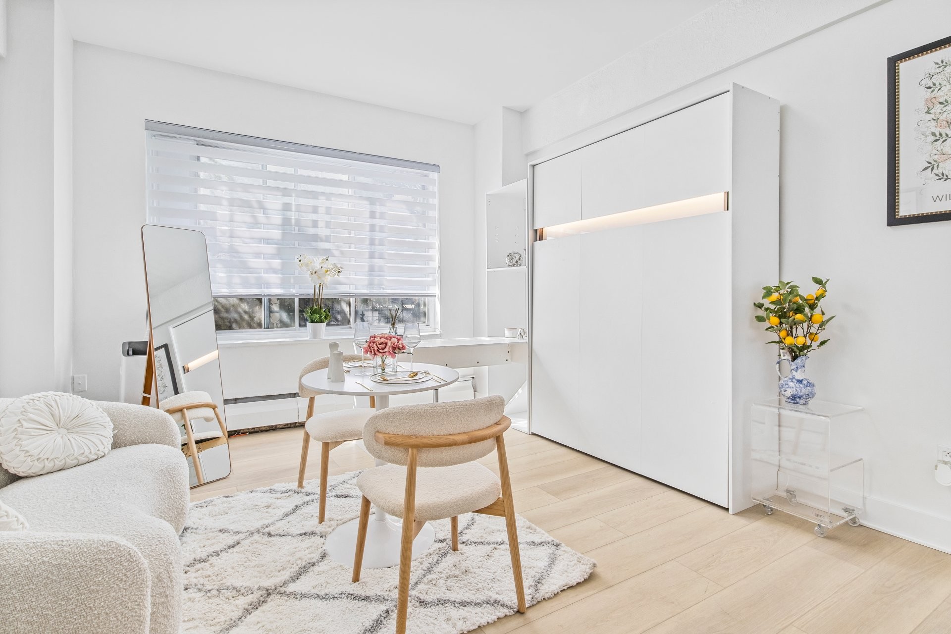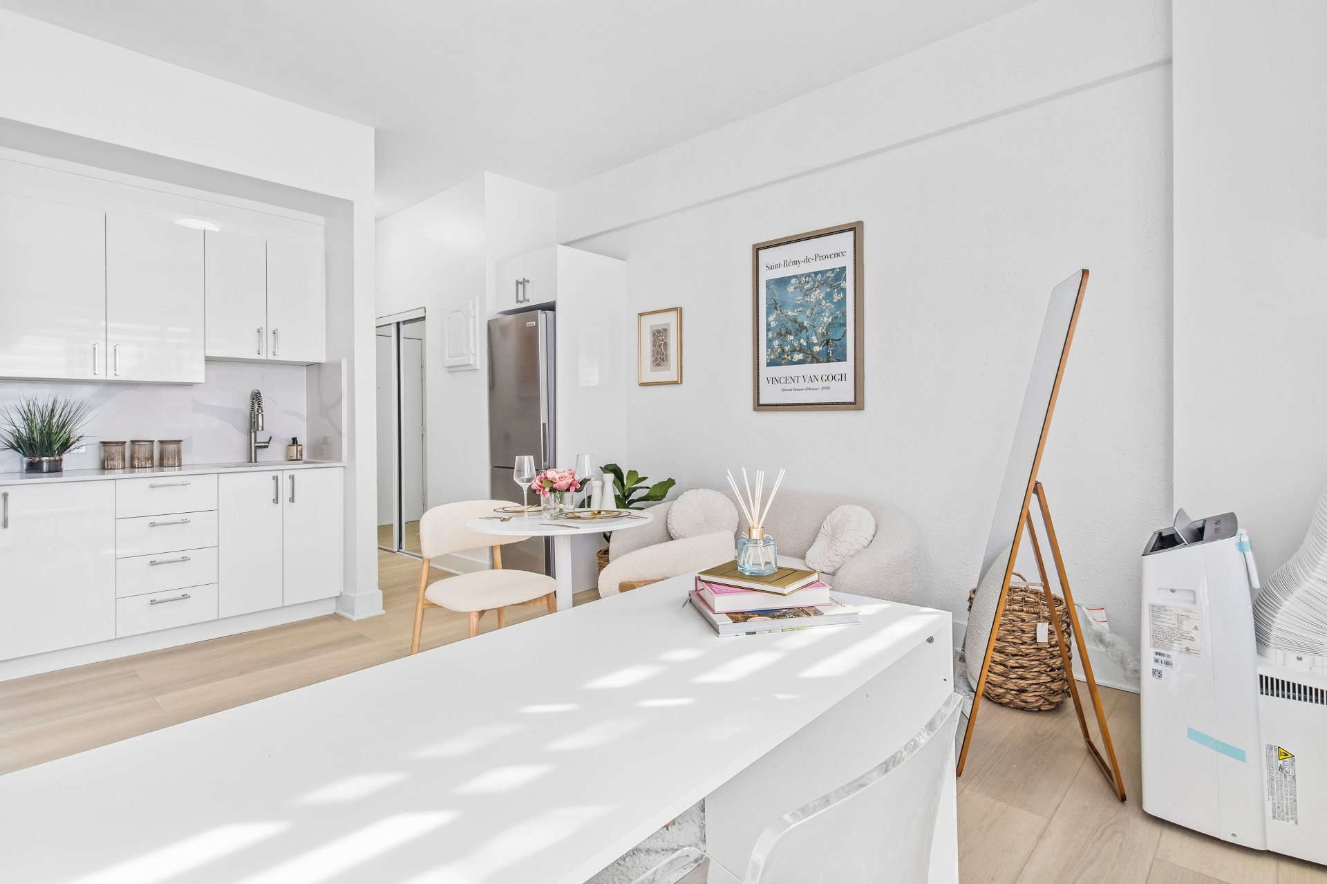 Unité de coin partiellement meublé moderne au YUL avec 2 chambres, 1 salle de bain et espace lumineux à aire ouverte. Fenêtres pleine hauteu...