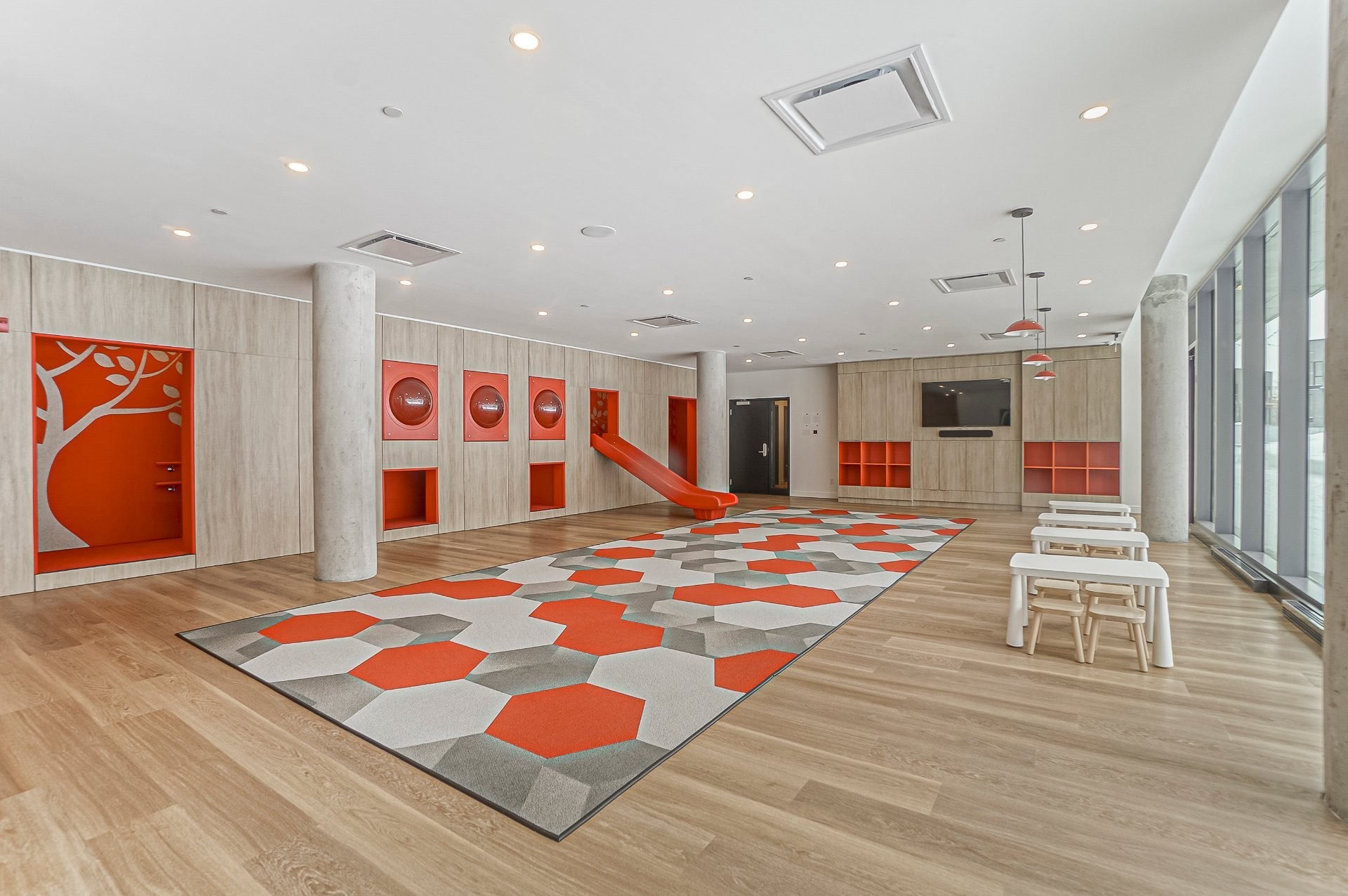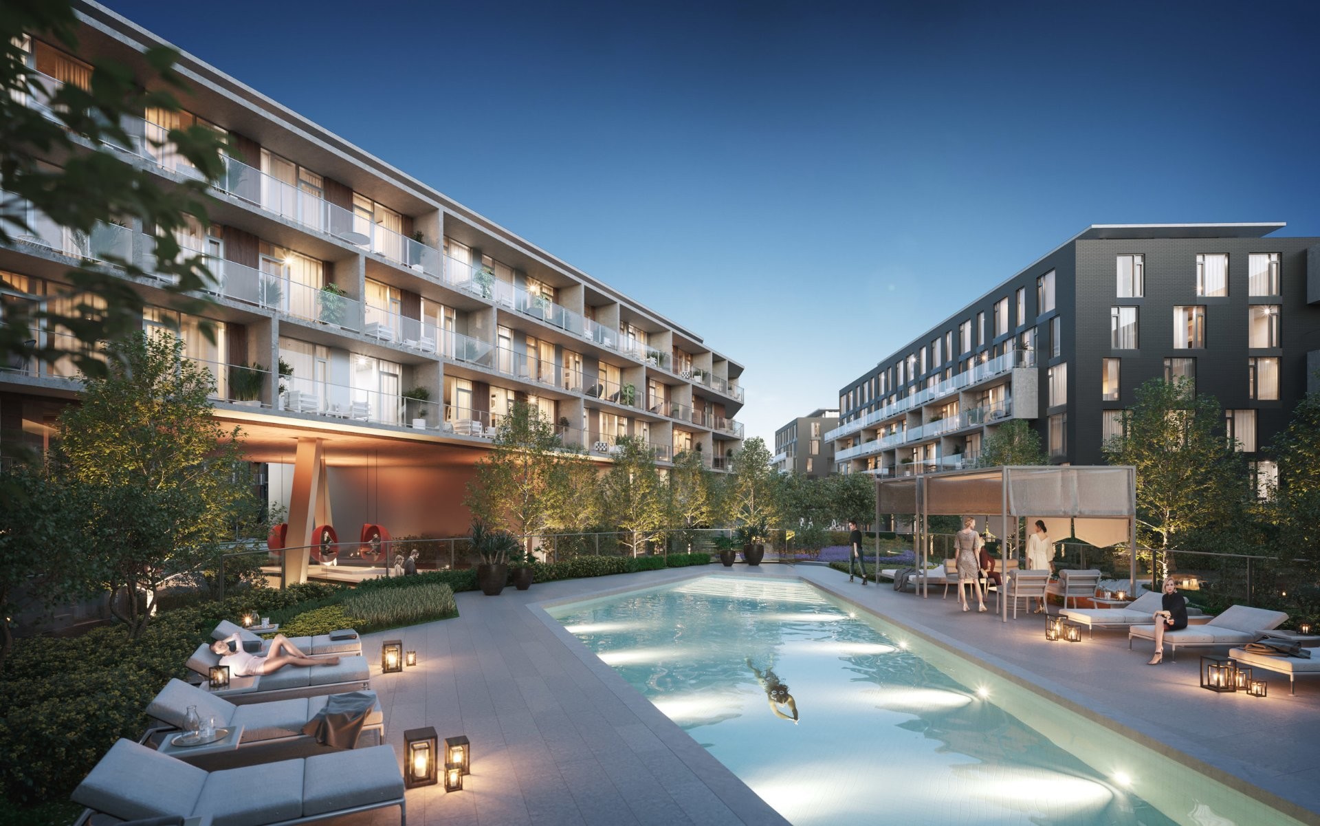 Lobby with conciergeFully equipped gym and yoga studiosCoworking spaces and meeting loungesGames room and indoor children's play areaOutdoor park and central plaza with seating and gardensSecure parcel storage and high-speed elevatorsIn-ground heated saltwater pool (Phase 3 -