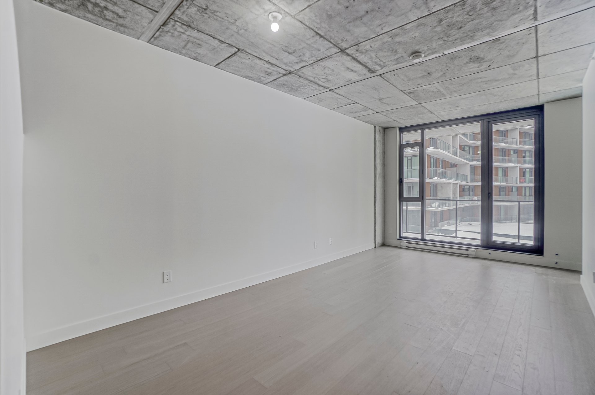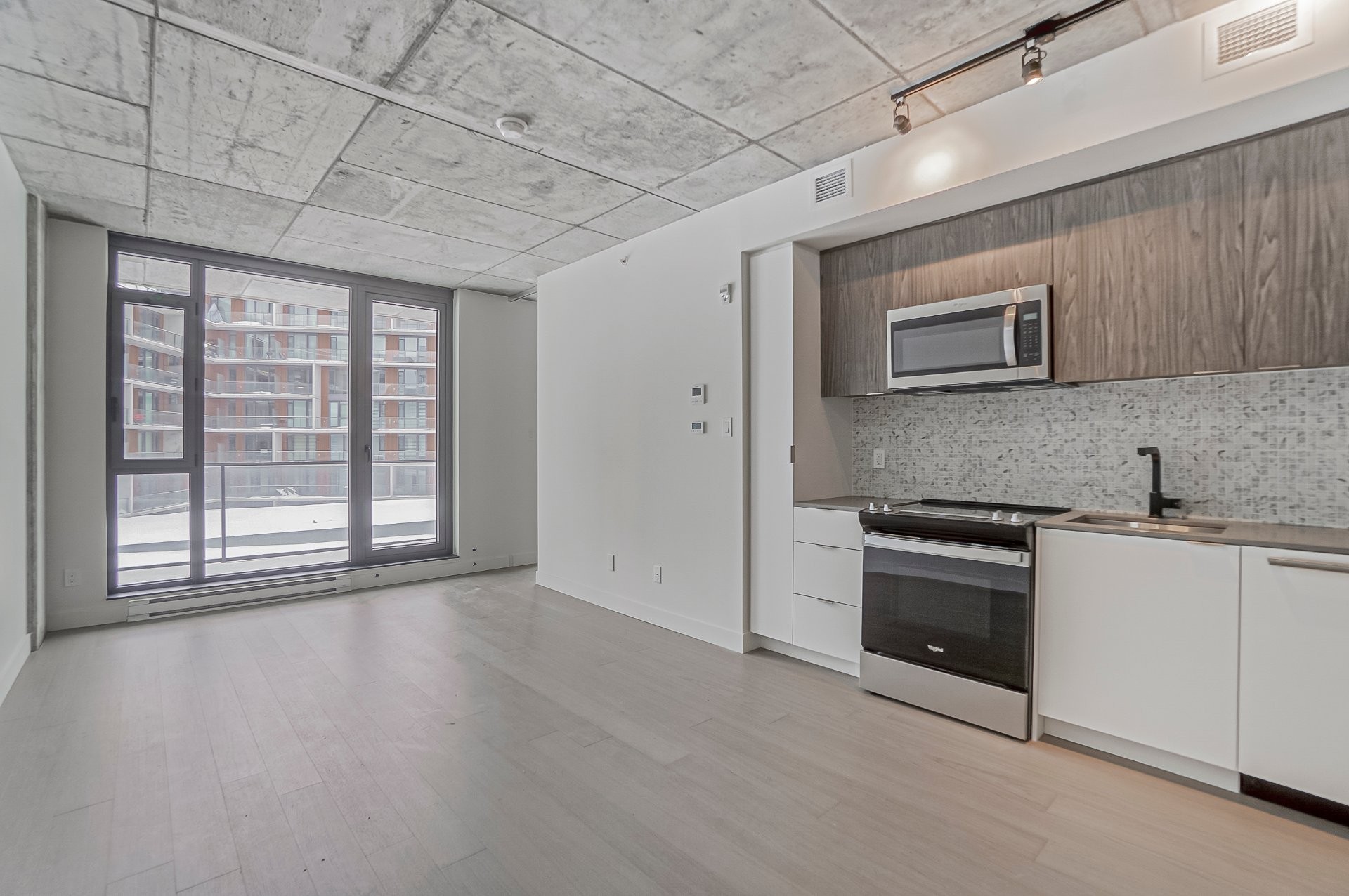 One-bedroom condo with a versatile den ideal as an office or second bedroom. Features beautiful finishes, abundant natural light, 9-foot ceilings, engineered hardwood floors, and a modern kitchen with quartz countertop. The primary bedroom offers a spacious walk-in closet and ensuite bathroom. Includes a private balcony, indoor garage parking, and a storage locker. Ideally located near Royalmount, within walking distance to Du Collège metro, 15 minutes from the airport, and with quick access to Highways 15 & 40. Project amenities include gym, yoga studio, coworking spaces, common areas, playground, and future pool.