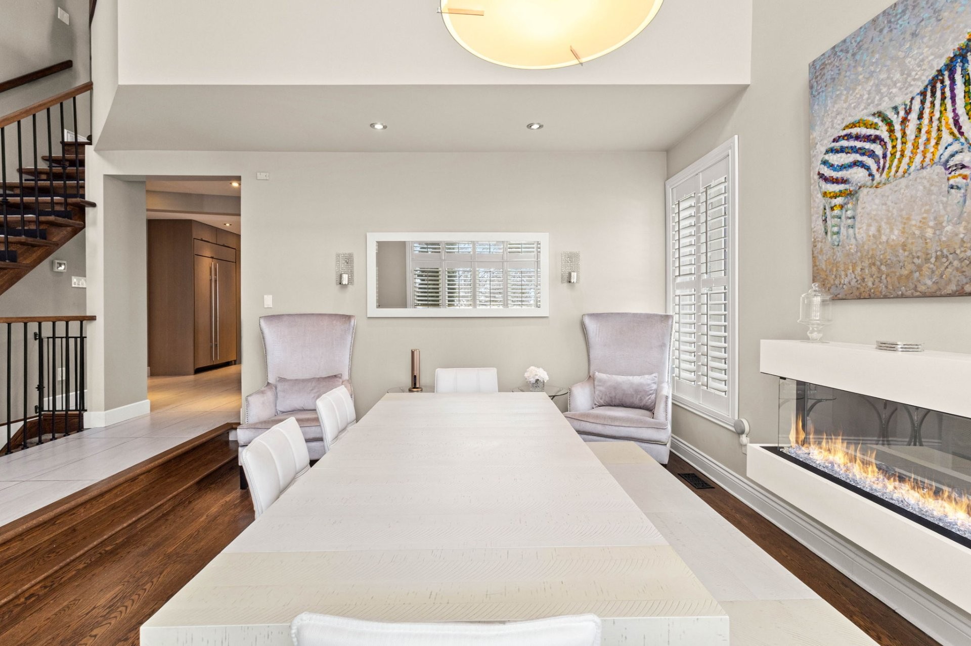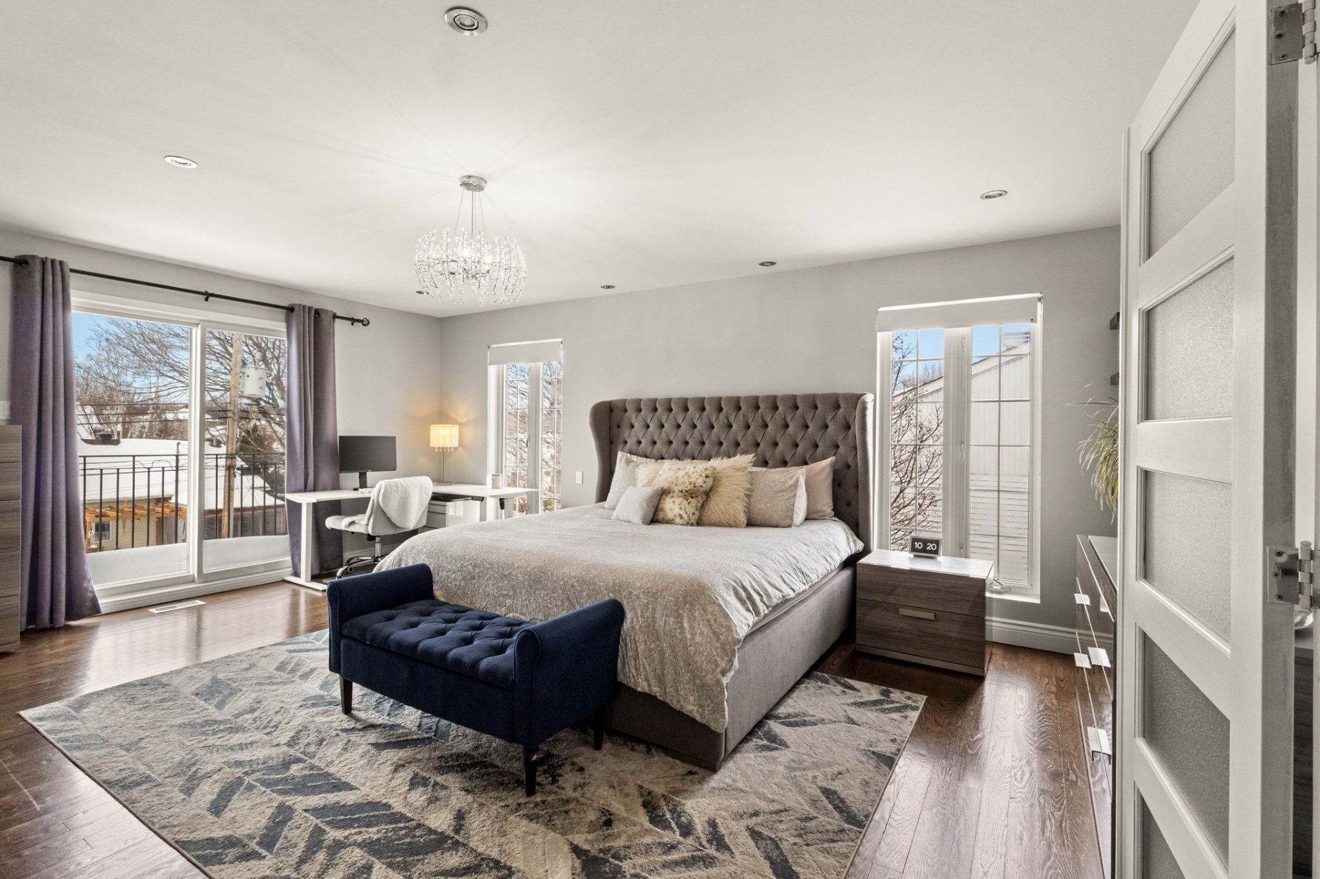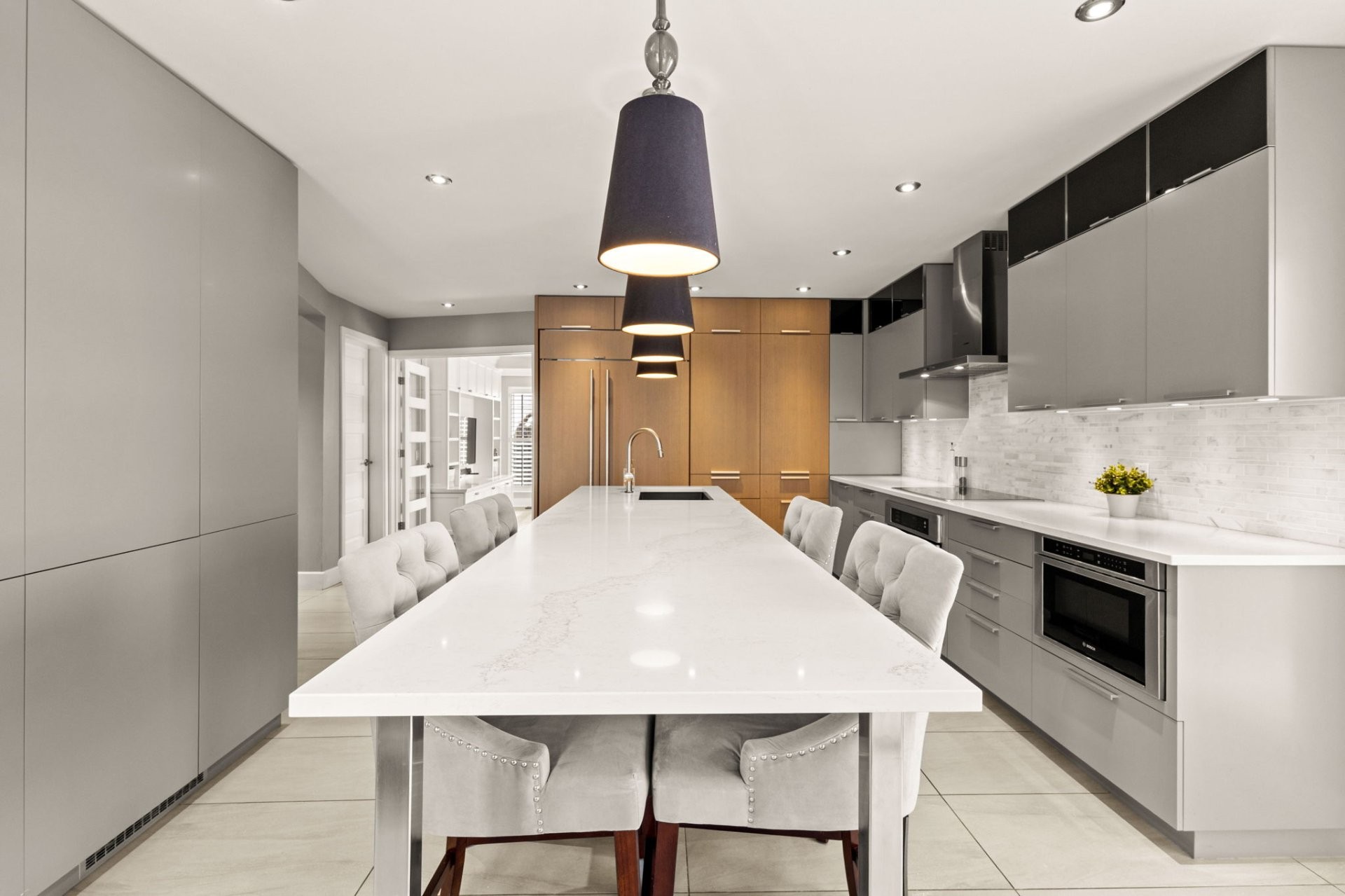 Upstairs, a mezzanine provides the perfect space for a home office or reading nook. The generous primary suite includes a custom walk-in closet and a refined ensuite bathroom with heated floors and a large glass shower. Two additional well-sized bedrooms, each with a walk-in closet, share a spacious family bathroom.