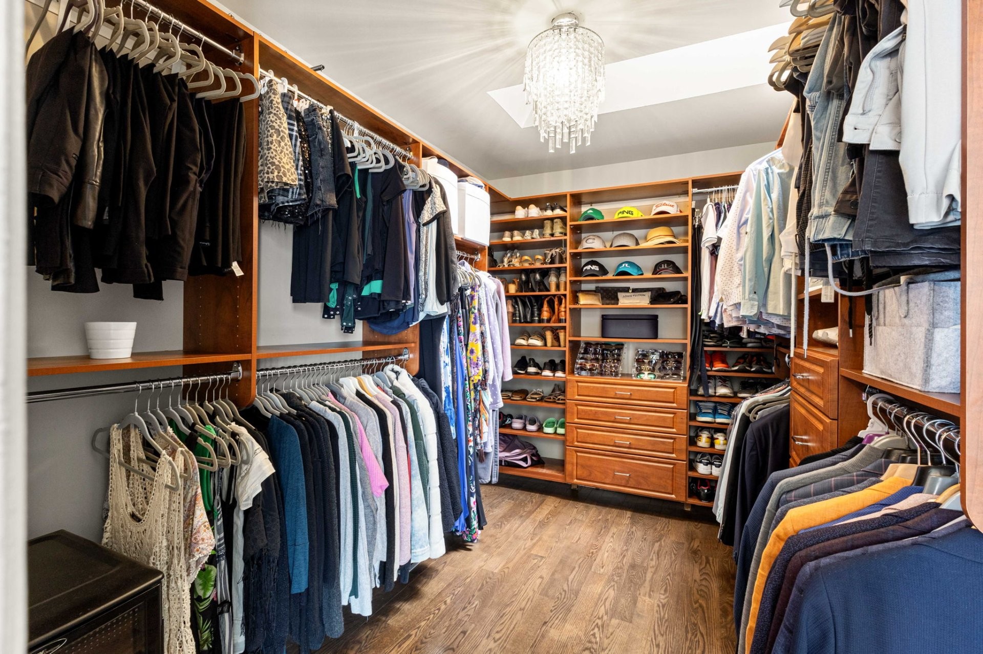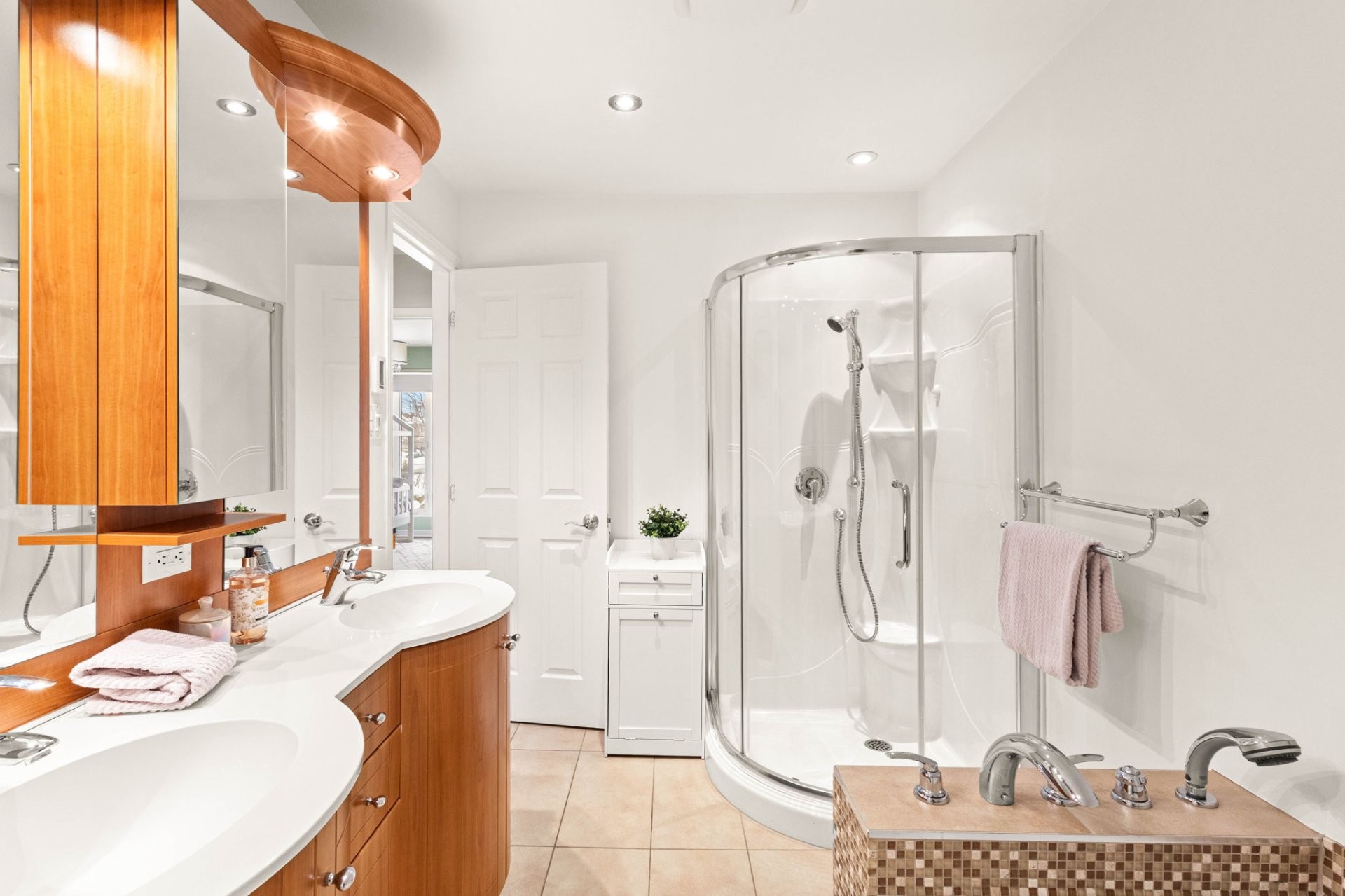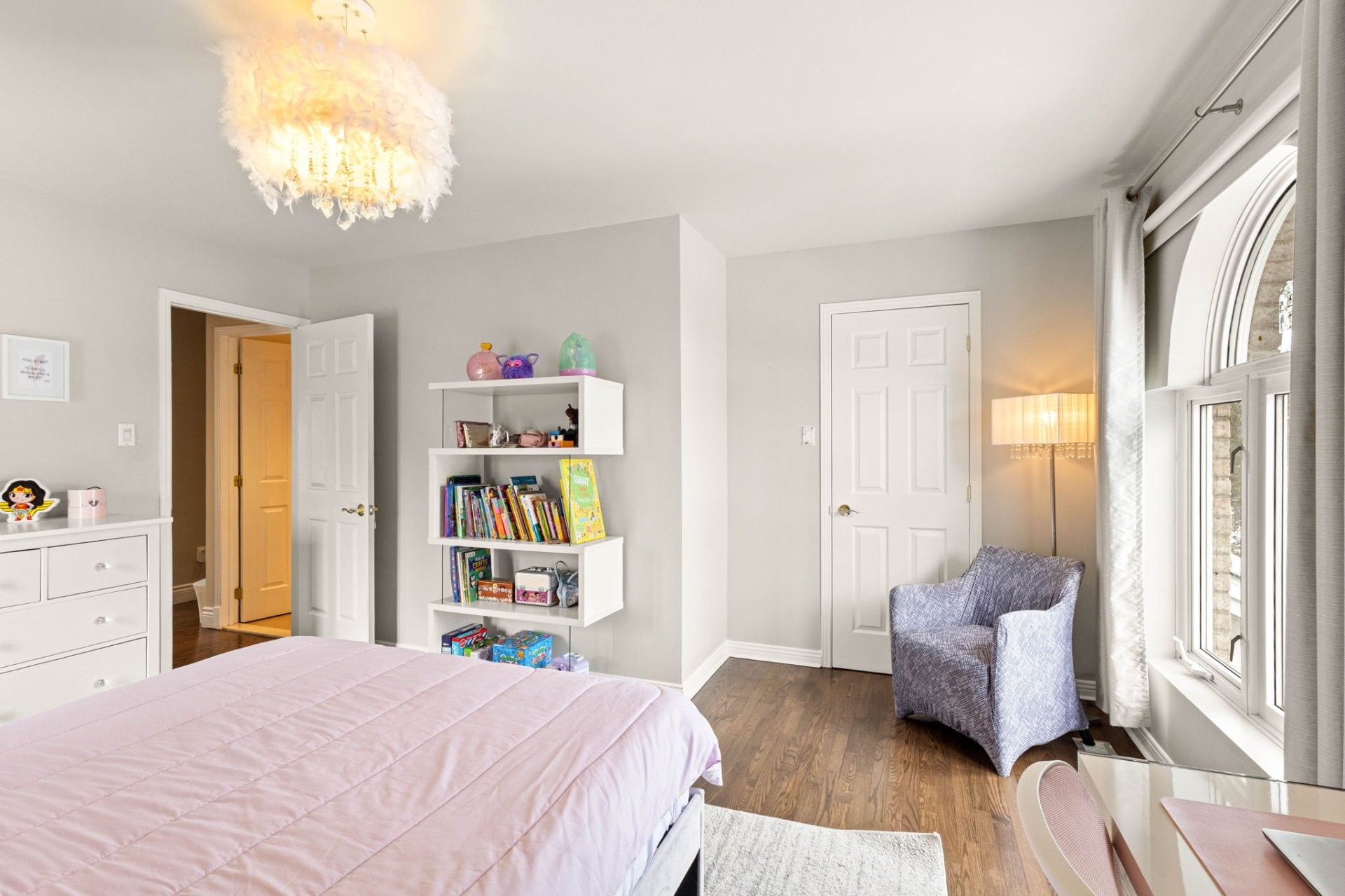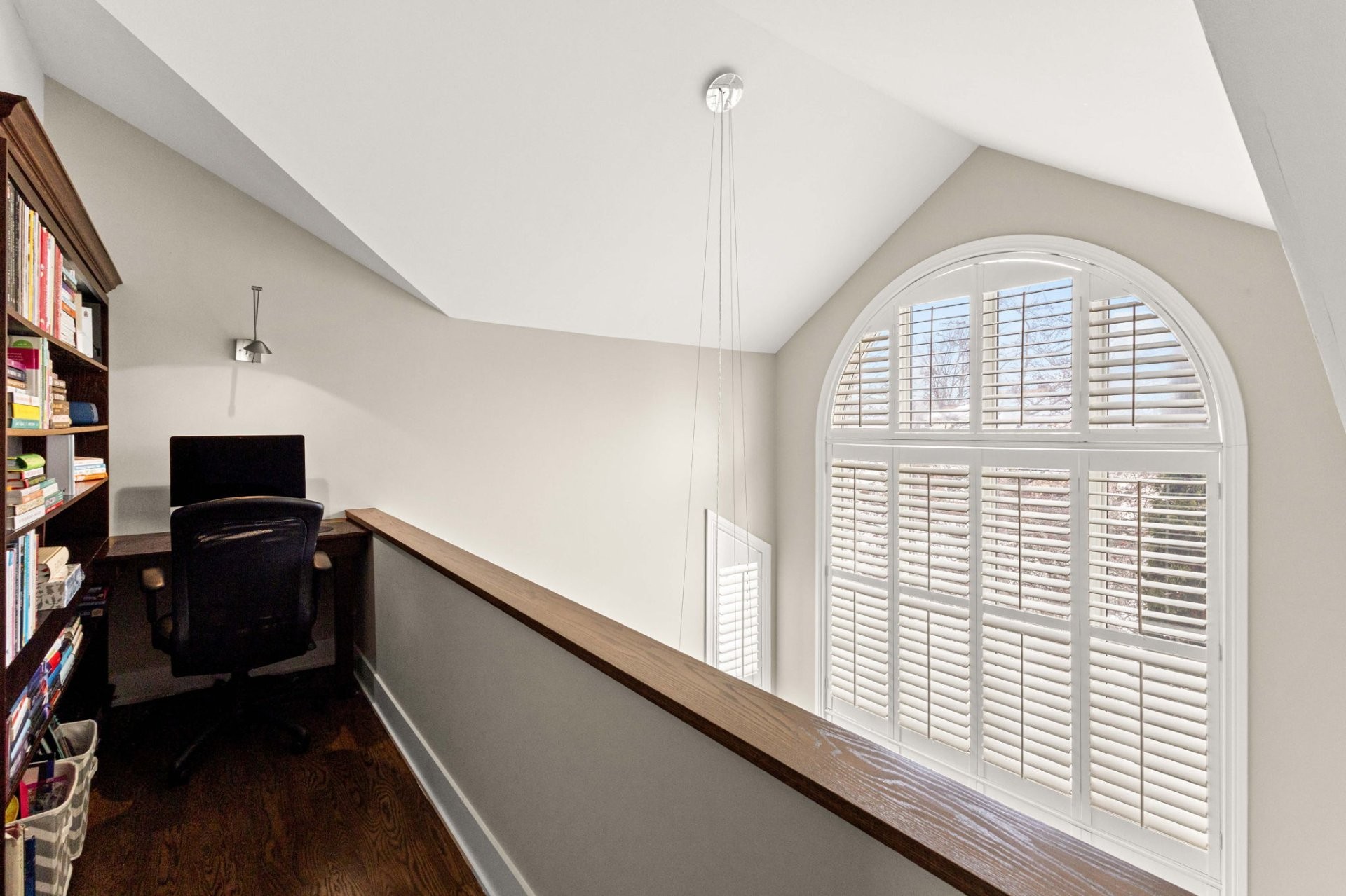 Upstairs, a mezzanine provides the perfect space for a home office or reading nook. The generous primary suite includes a custom walk-in closet and a refined ensuite bathroom with heated floors and a large glass shower. Two additional well-sized bedrooms, each with a walk-in closet, share a spacious family bathroom.