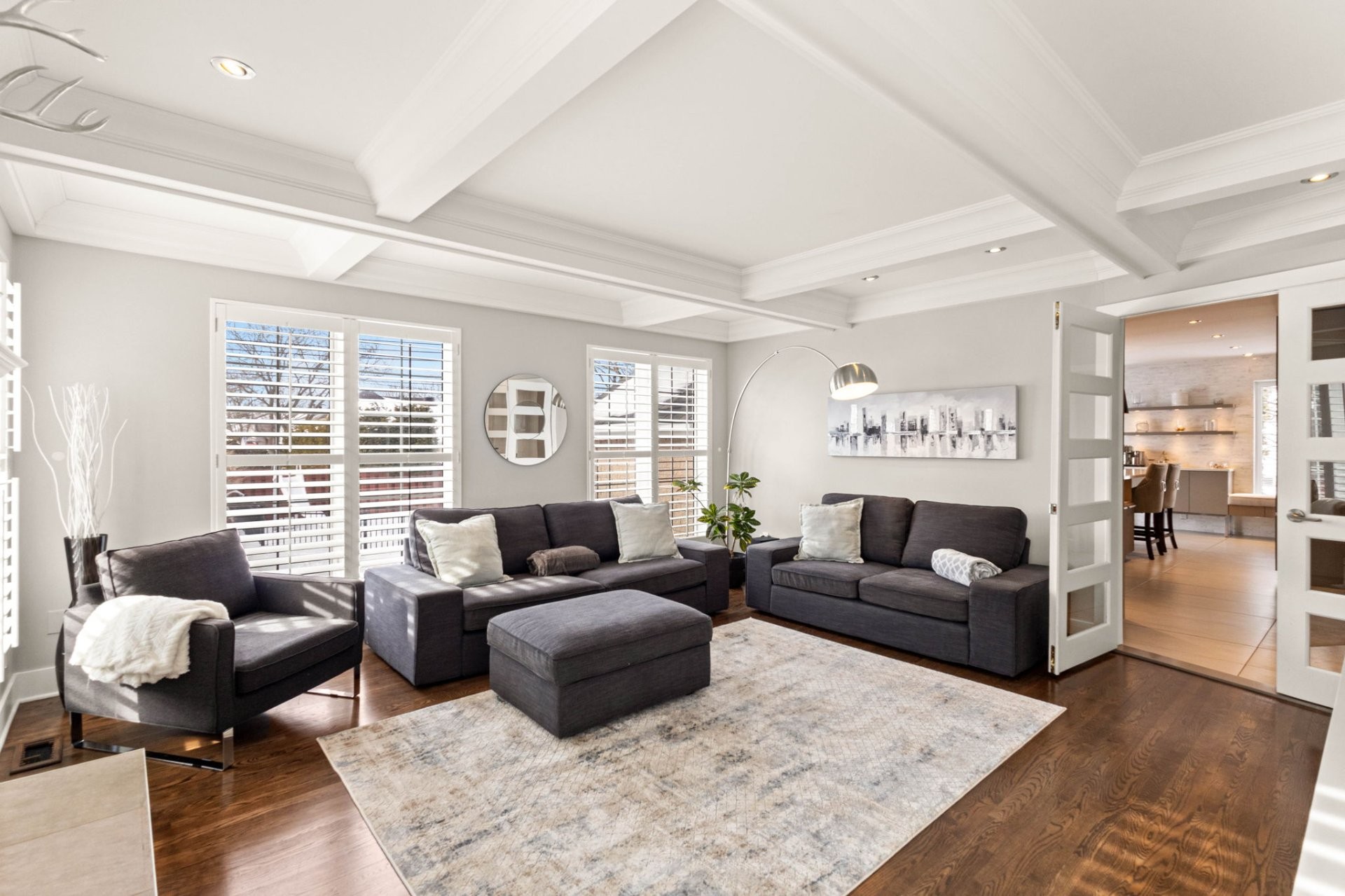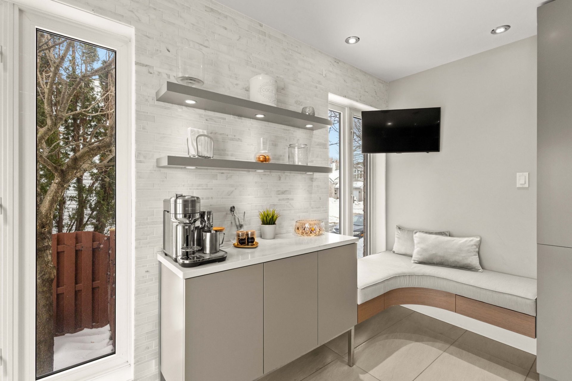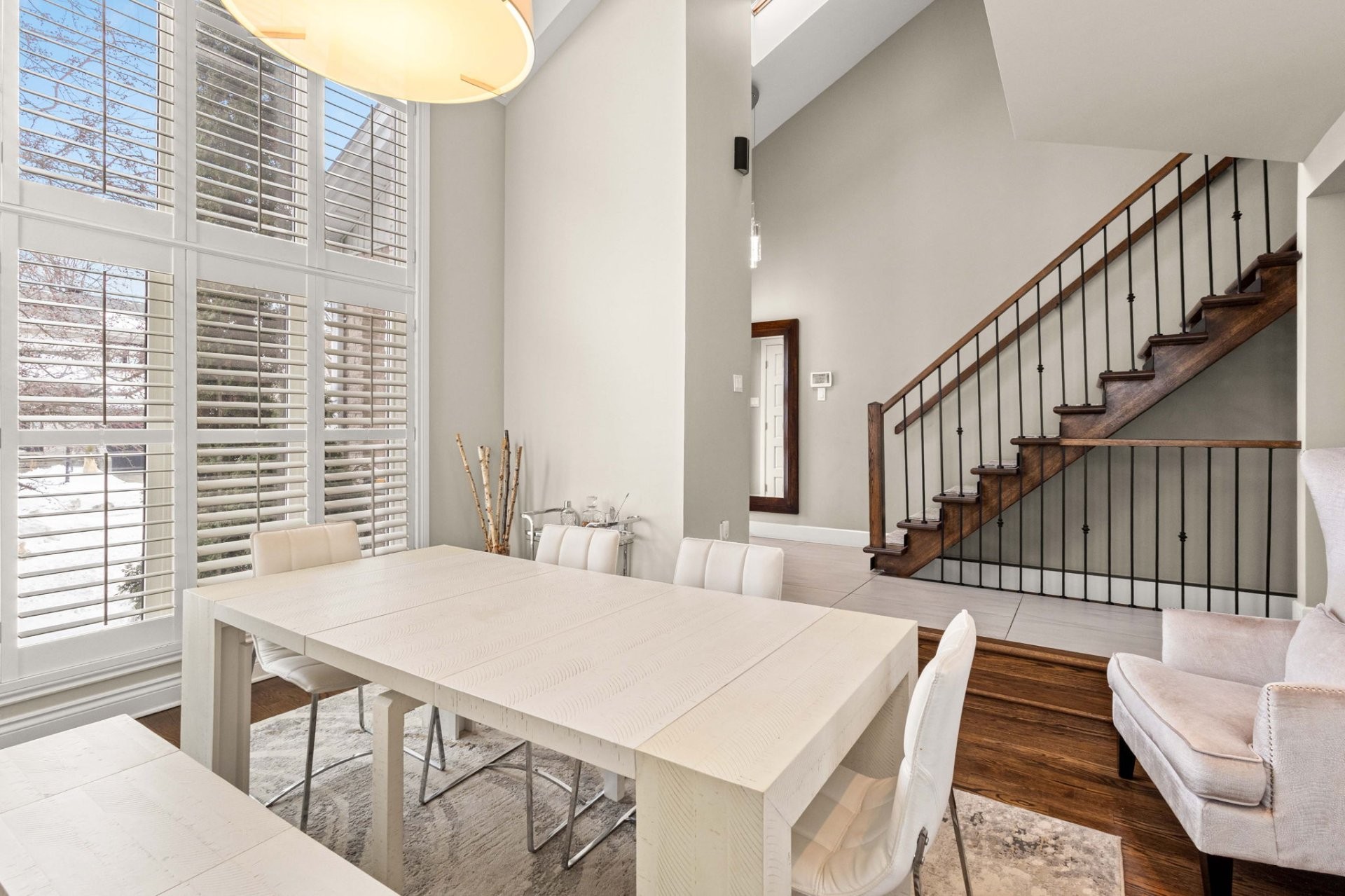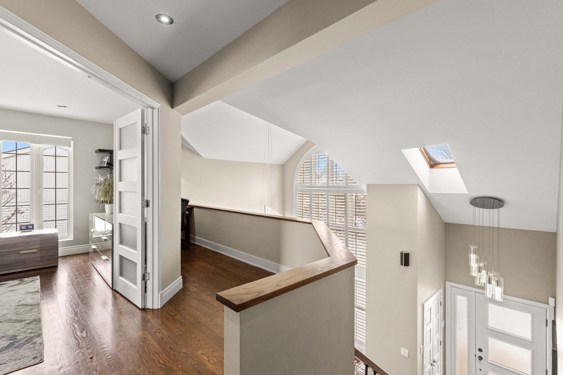 The bright, well-planned layout creates a natural flow between the main living spaces. The main floor features a spacious renovated kitchen with a large island, quartz countertops, a dedicated coffee station, and a charming window bench. The inviting family room offers vaulted ceilings, a cozy gas fireplace, and custom built-in shelving. A stunning sunken dining room with cathedral ceilings, skylights, and oversized windows brings in exceptional natural light. A powder room and laundry room complete this level.