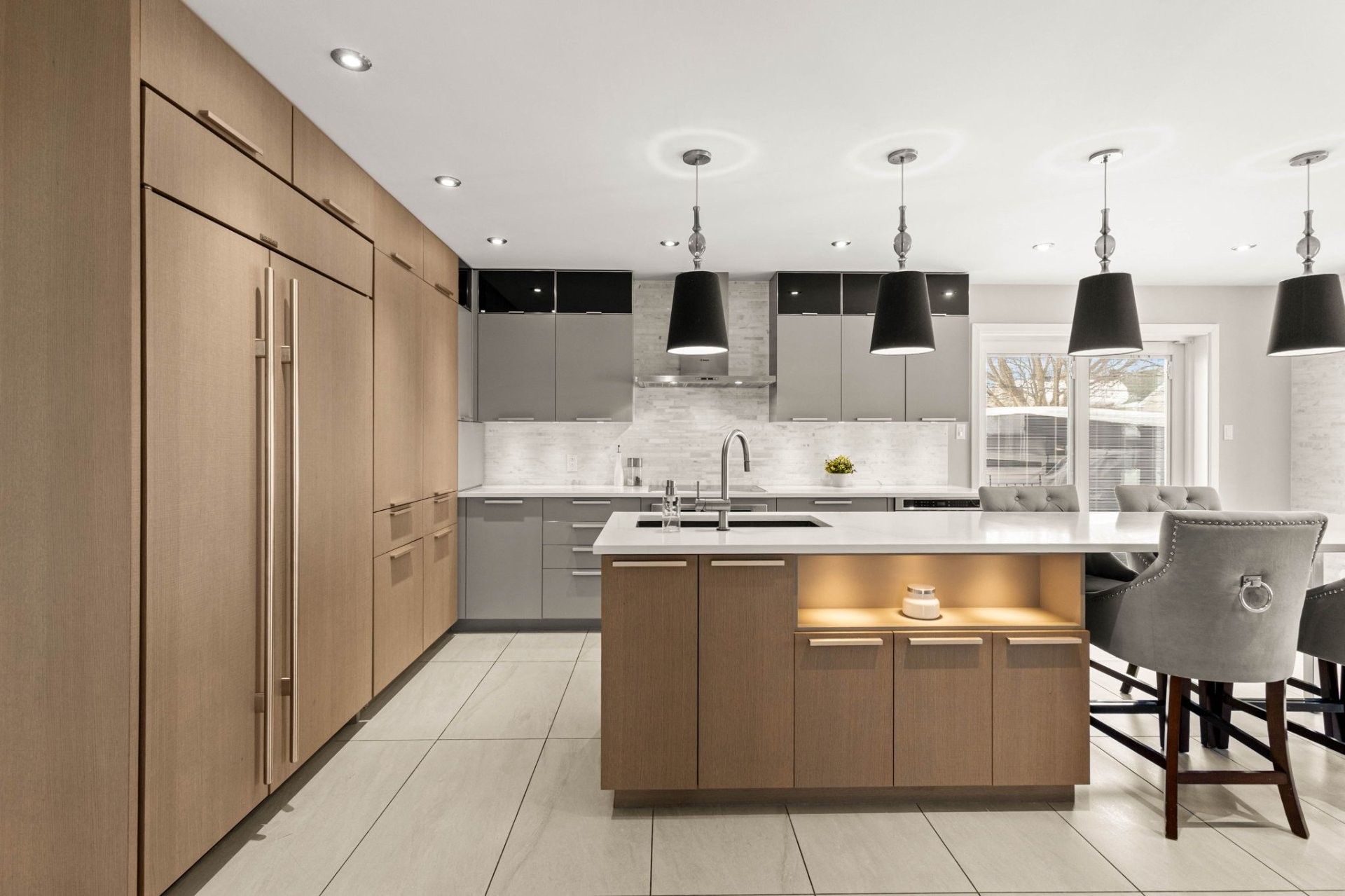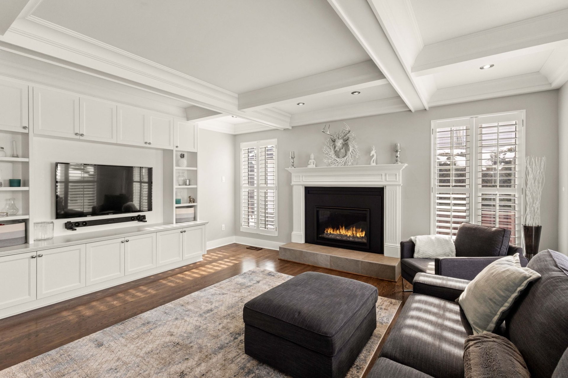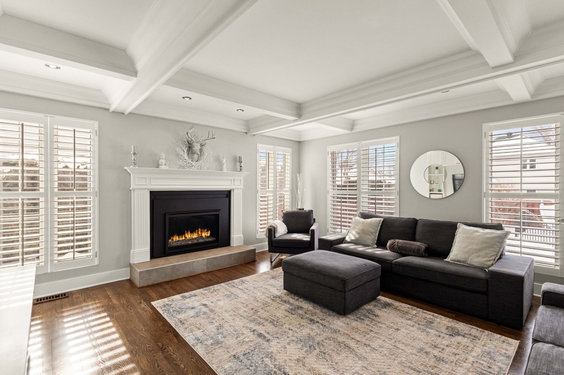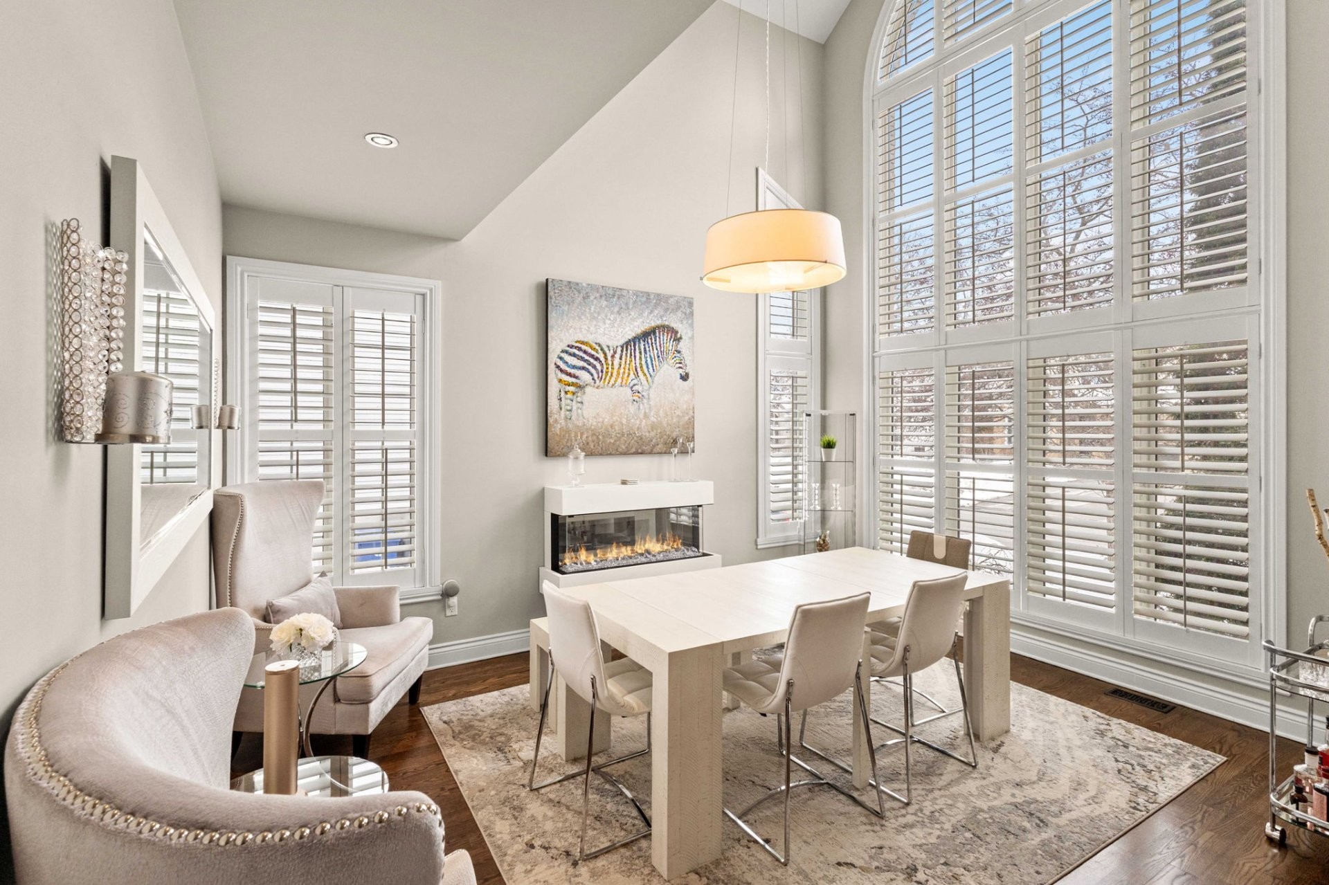 The bright, well-planned layout creates a natural flow between the main living spaces. The main floor features a spacious renovated kitchen with a large island, quartz countertops, a dedicated coffee station, and a charming window bench. The inviting family room offers vaulted ceilings, a cozy gas fireplace, and custom built-in shelving. A stunning sunken dining room with cathedral ceilings, skylights, and oversized windows brings in exceptional natural light. A powder room and laundry room complete this level.