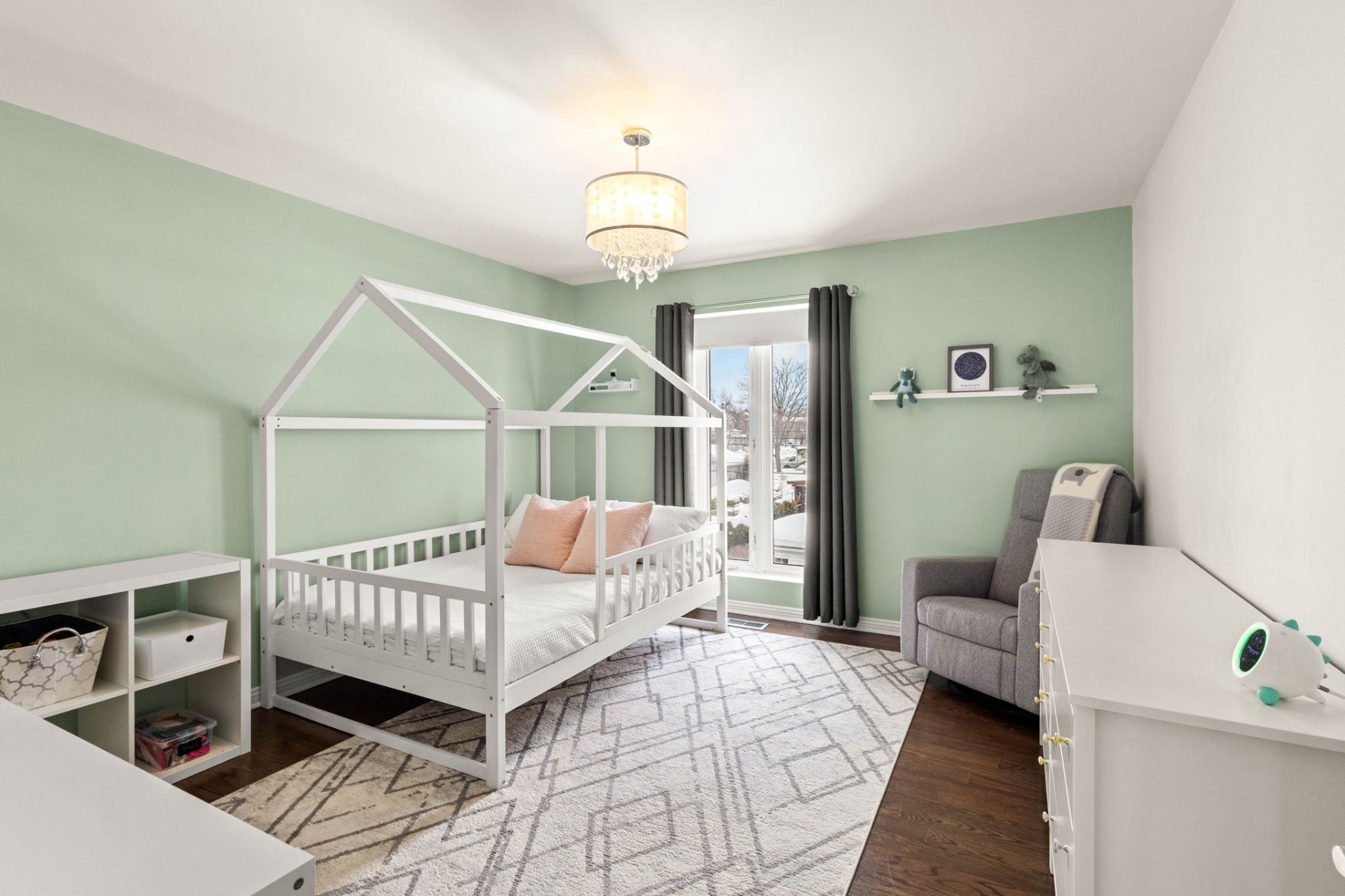 The fully finished basement extends the living space with a large playroom featuring built-in cabinetry, an additional bedroom, a full bathroom, and a spacious storage room with closets -- ideal for use as a pantry. Heated tile floors add comfort throughout this level.