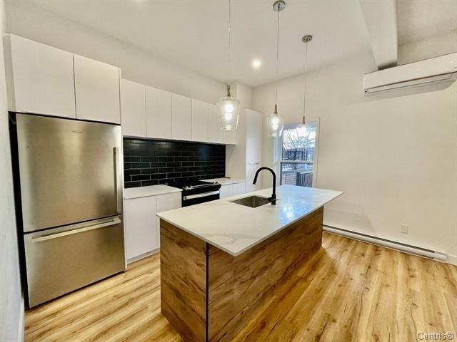 Amazing 2-bedroom modern unit in the heart of Pointe-Saint-Charles! This spacious, sun-filled apartment blends contemporary design with classic Montreal charm. Featuring high ceilings, hardwood floors, large windows, and an open-concept living area perfect for entertaining. The sleek kitchen offers quartz countertops and stainless steel appliances. Two generous bedrooms with ample storage and a stylish bathroom complete the space. Enjoy in-unit laundry, air conditioning, and private outdoor space. Located steps from cafes, parks, the Lachine Canal, and public transit. Easy access to downtown and Griffintown.