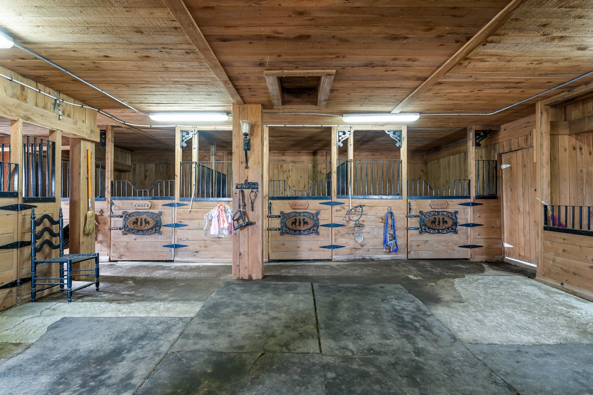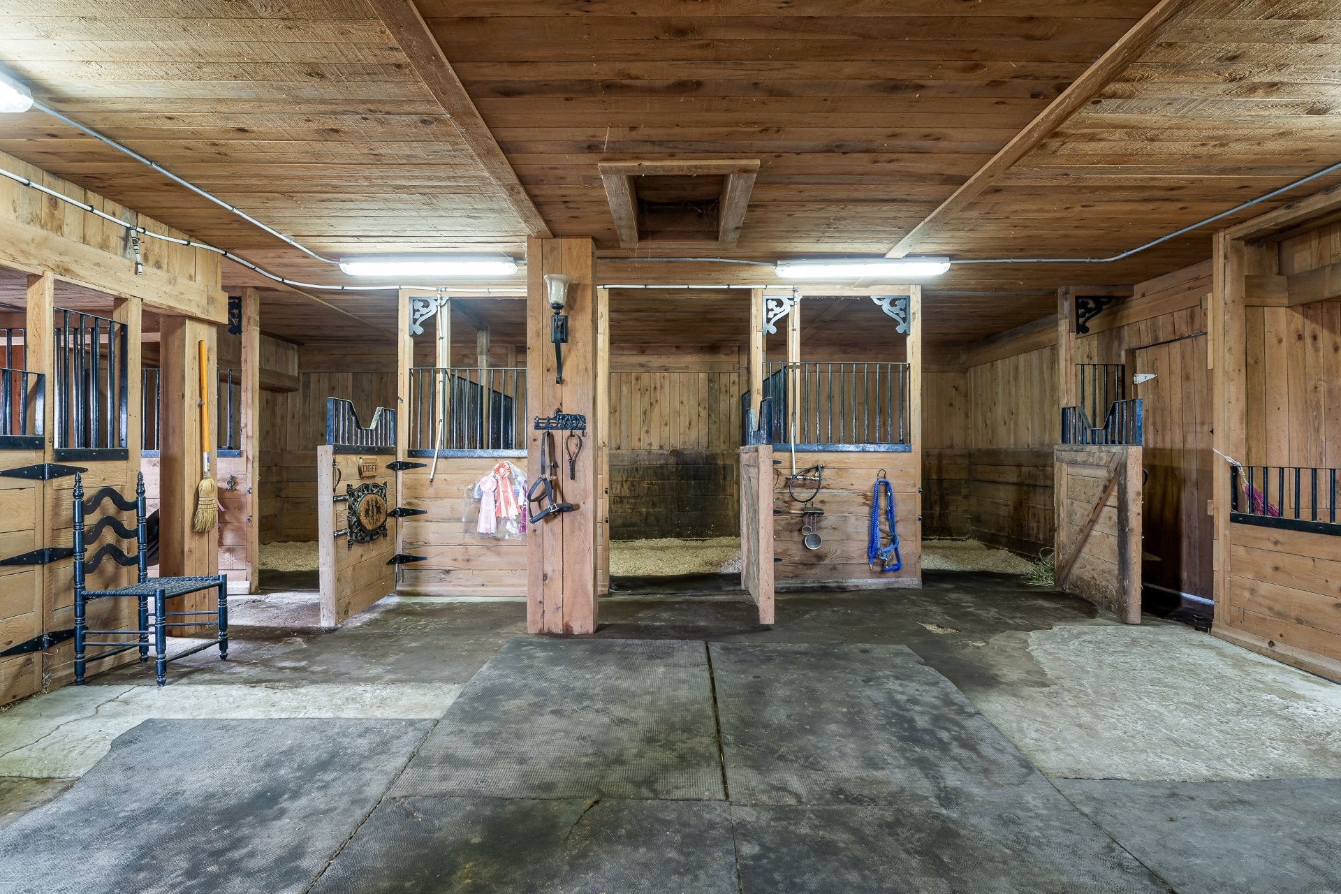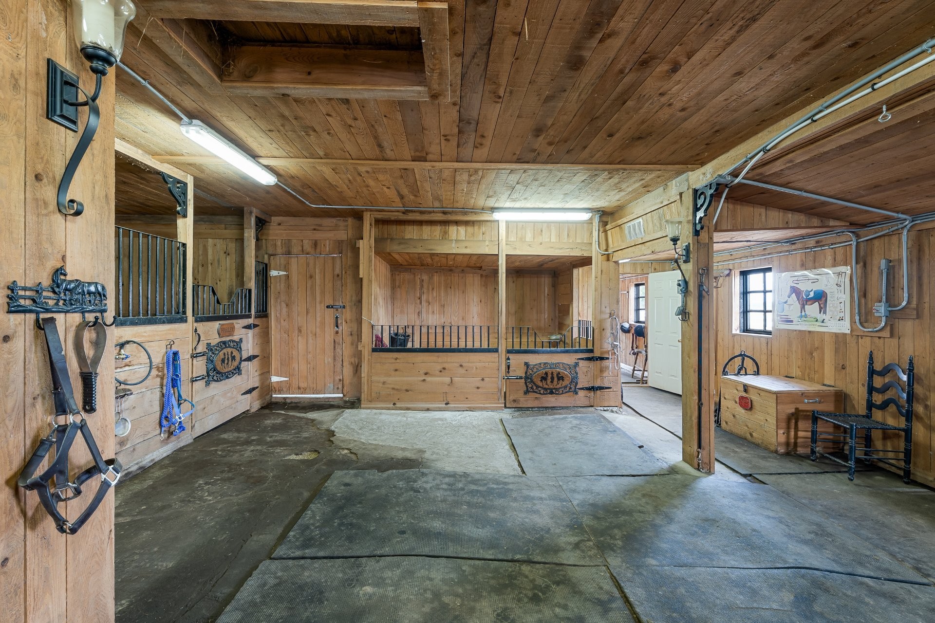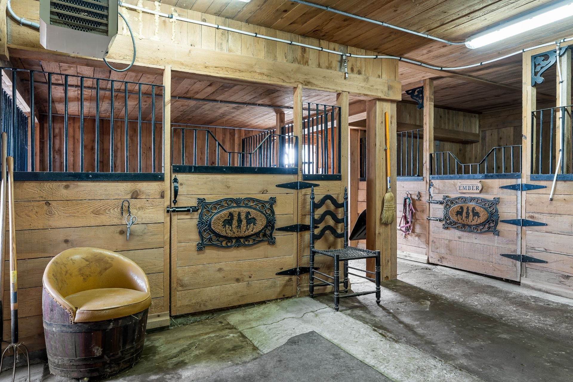 Equestrian facilities are thoughtfully laid out for year-round use. The beautifully maintained barn includes five stalls--four with automatic waterers, a fifth larger stall with low walls, and a sixth area that can be reconverted into a pony-sized stall or used as storage. The barn is heated, ventilated, and equipped with electricity and running water all year long. A spacious second-floor hayloft can accommodate up to 250 square bales and can be loaded directly from the exterior. Additional outdoor storage is available for round bales, and a large tack room adds convenience and functionality.