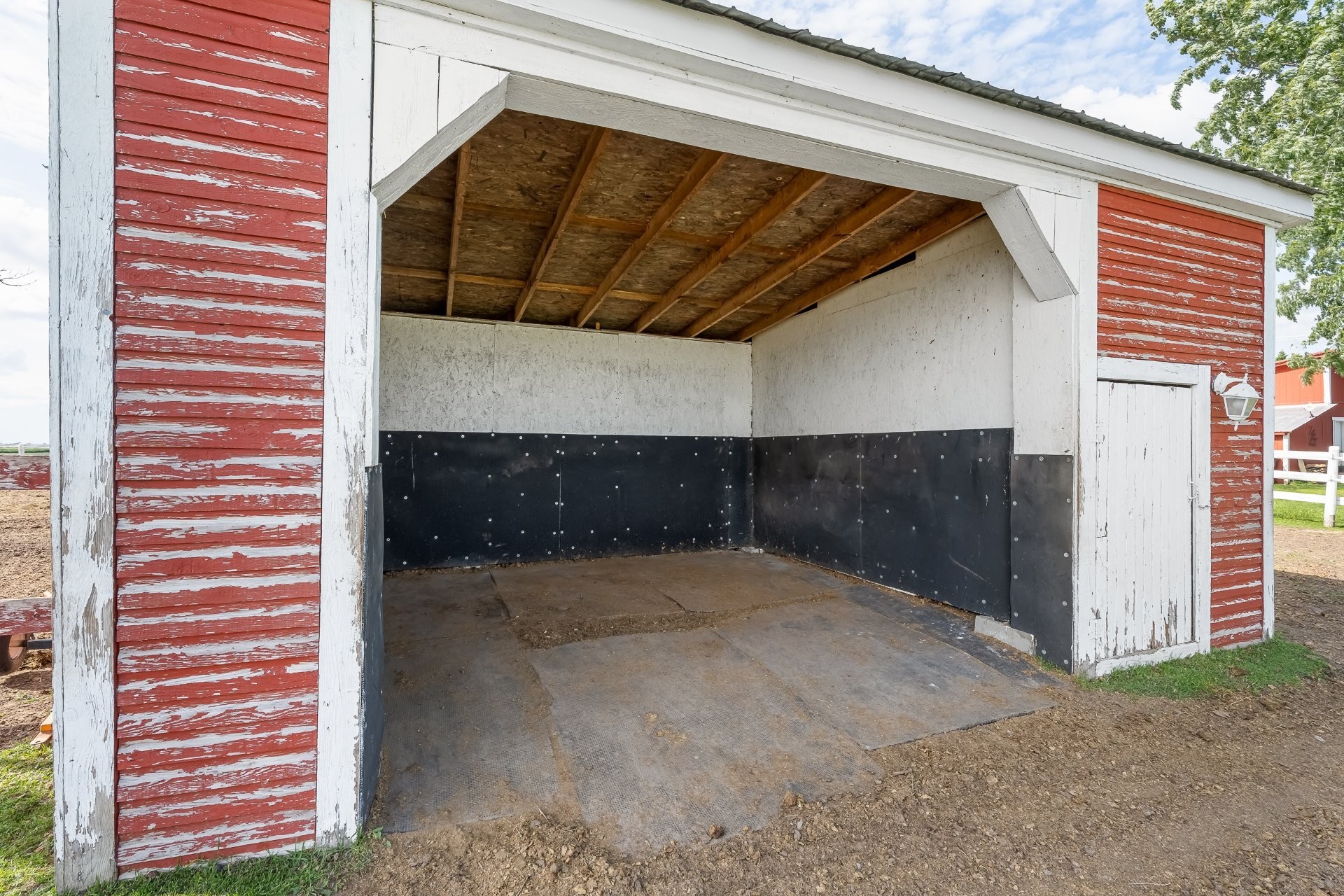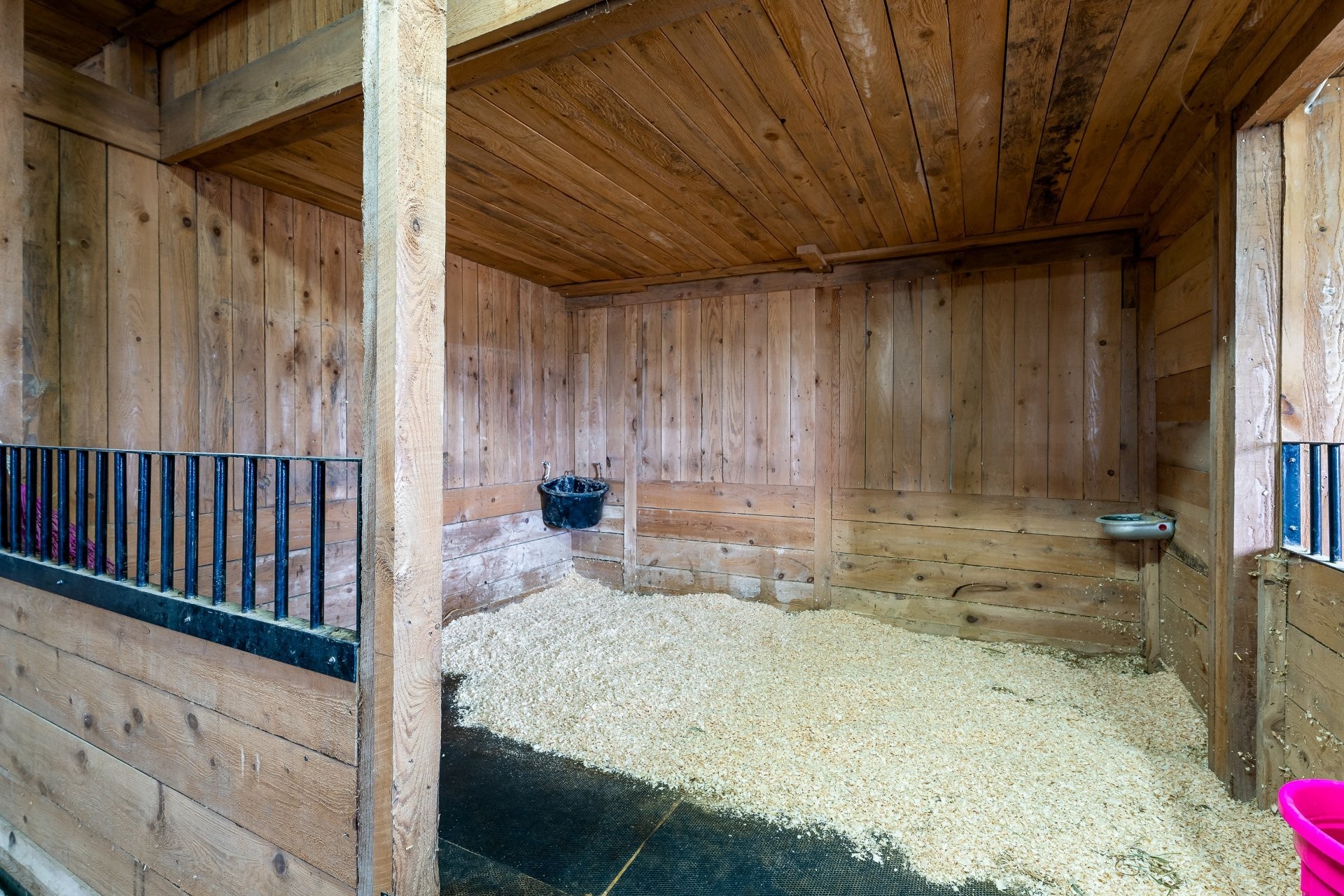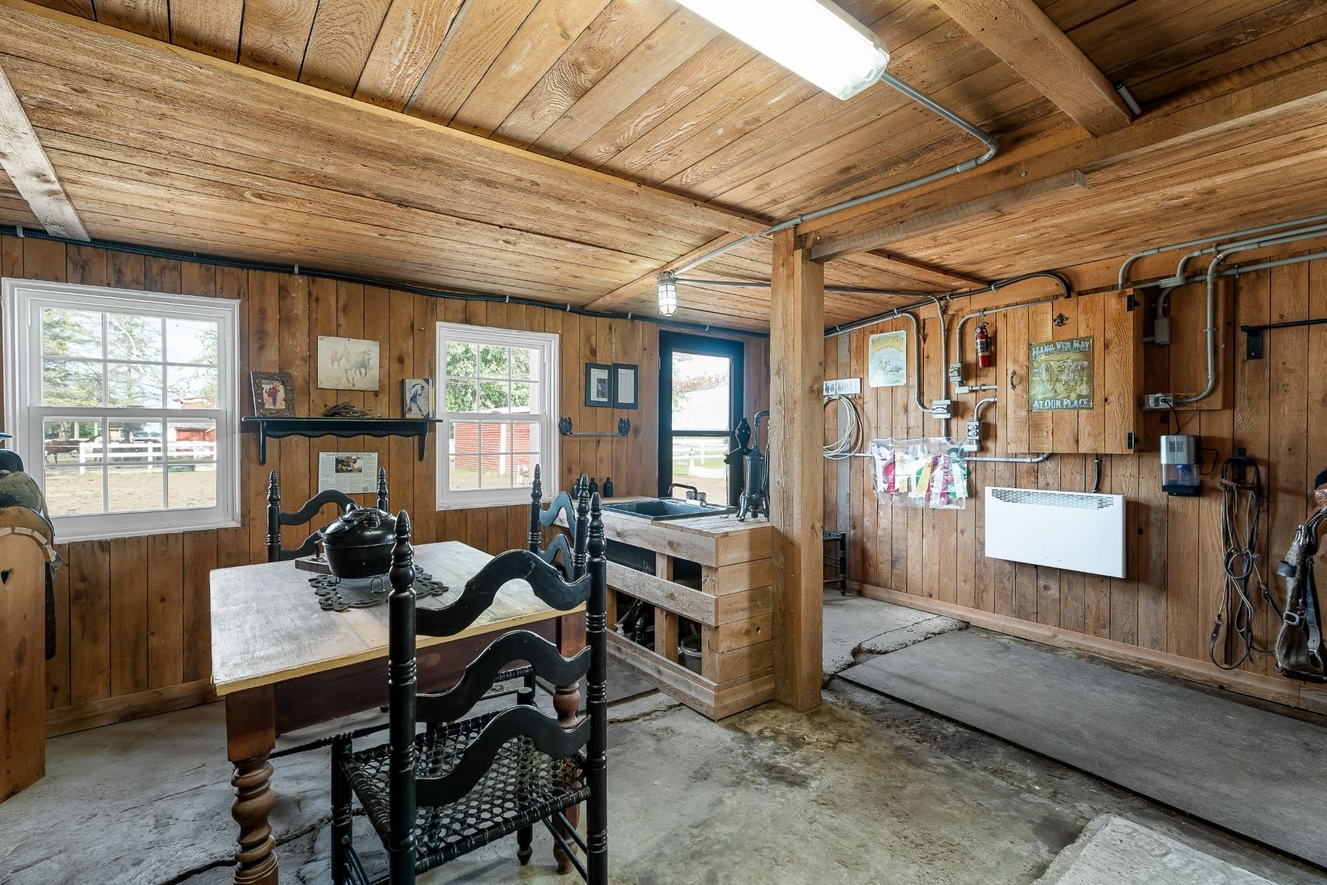 Equestrian facilities are thoughtfully laid out for year-round use. The beautifully maintained barn includes five stalls--four with automatic waterers, a fifth larger stall with low walls, and a sixth area that can be reconverted into a pony-sized stall or used as storage. The barn is heated, ventilated, and equipped with electricity and running water all year long. A spacious second-floor hayloft can accommodate up to 250 square bales and can be loaded directly from the exterior. Additional outdoor storage is available for round bales, and a large tack room adds convenience and functionality.