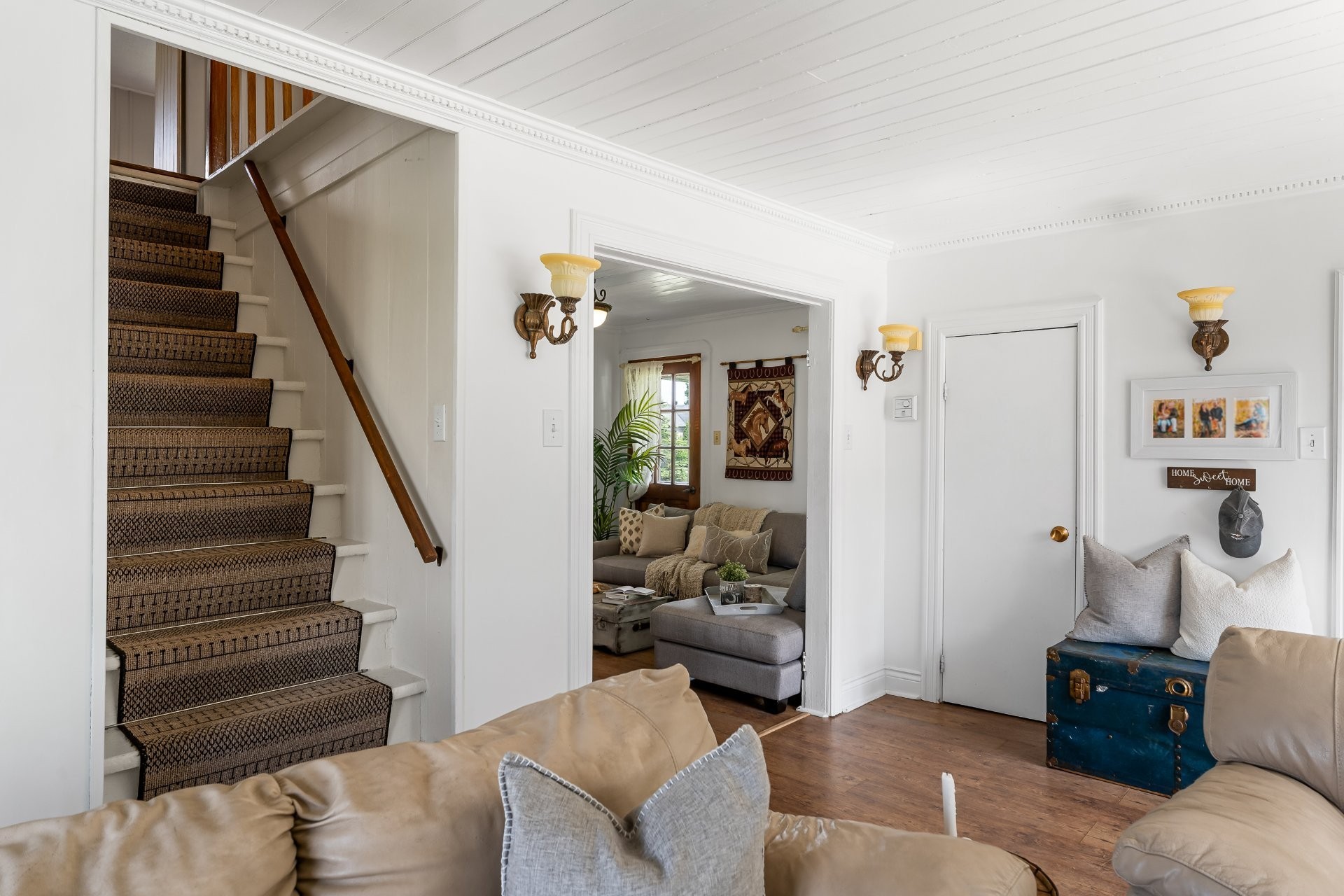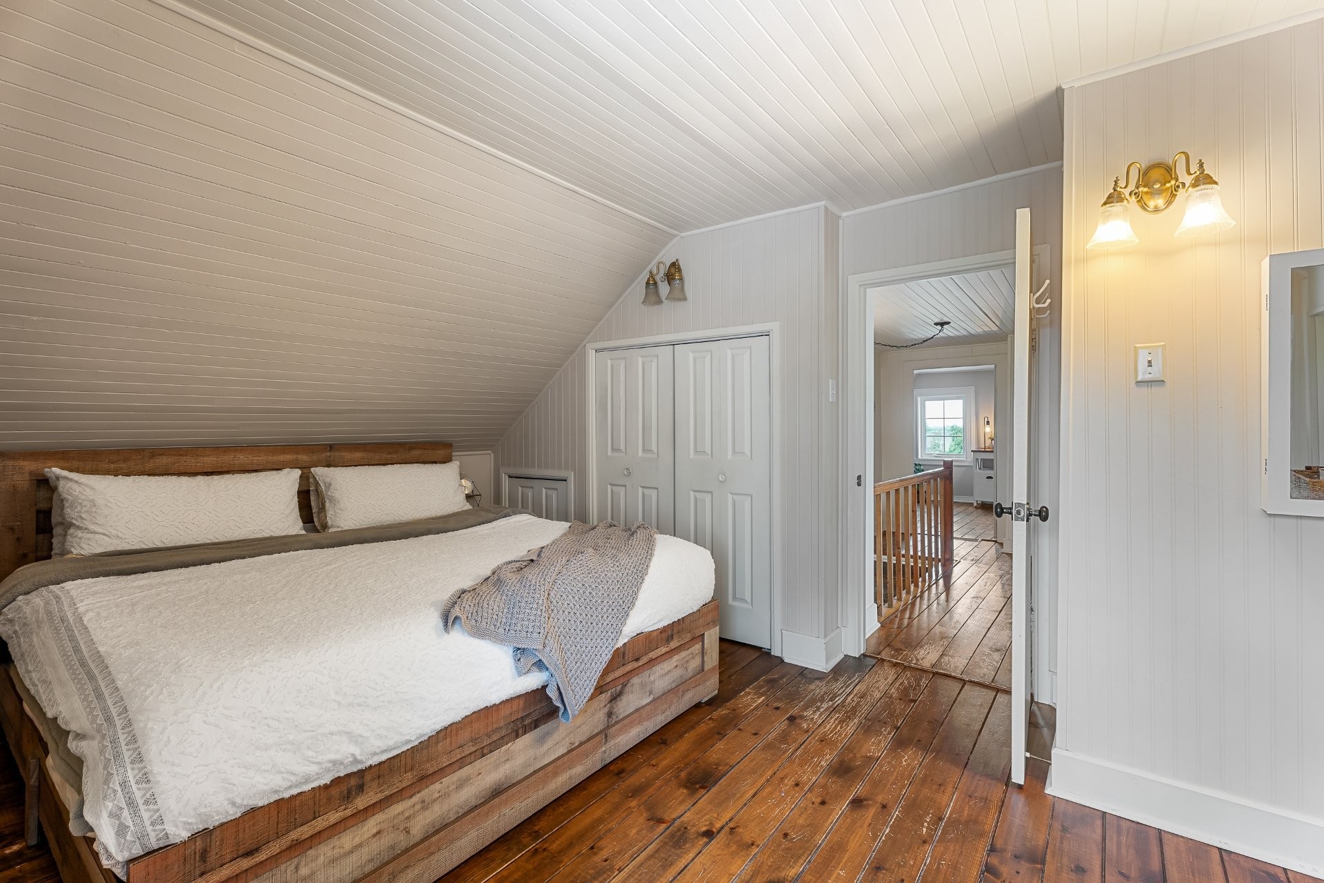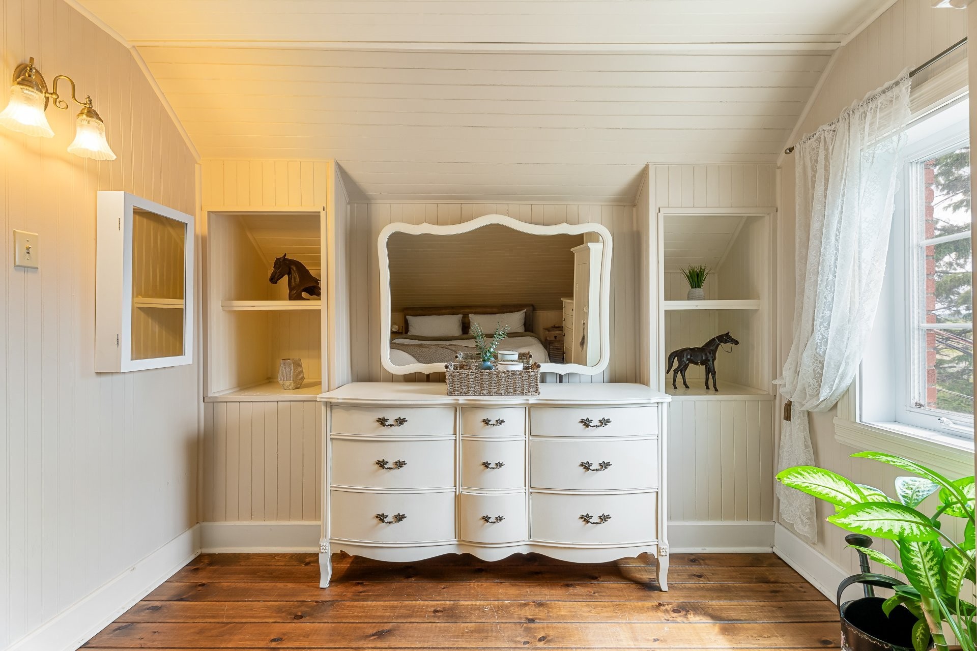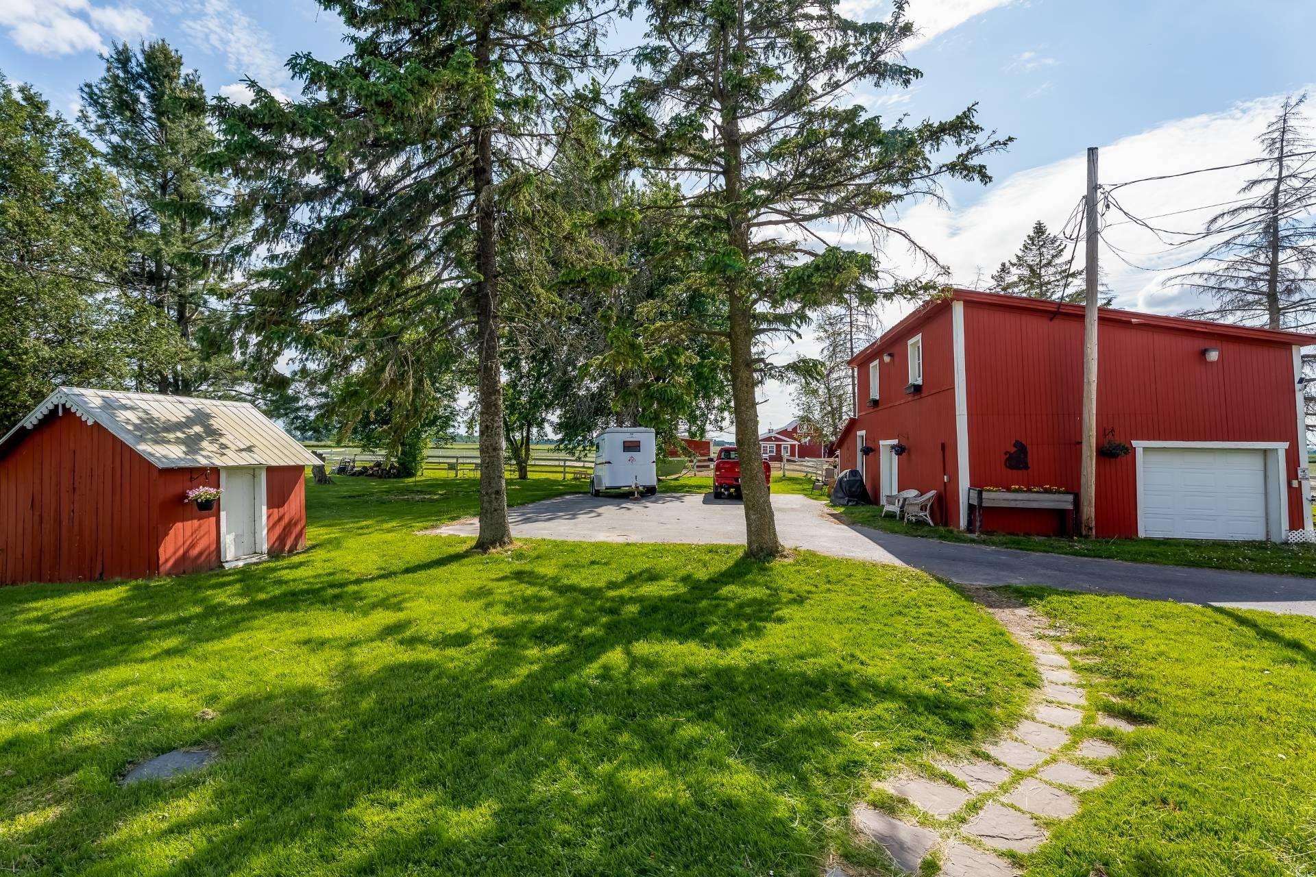 Equestrian facilities are thoughtfully laid out for year-round use. The beautifully maintained barn includes five stalls--four with automatic waterers, a fifth larger stall with low walls, and a sixth area that can be reconverted into a pony-sized stall or used as storage. The barn is heated, ventilated, and equipped with electricity and running water all year long. A spacious second-floor hayloft can accommodate up to 250 square bales and can be loaded directly from the exterior. Additional outdoor storage is available for round bales, and a large tack room adds convenience and functionality.