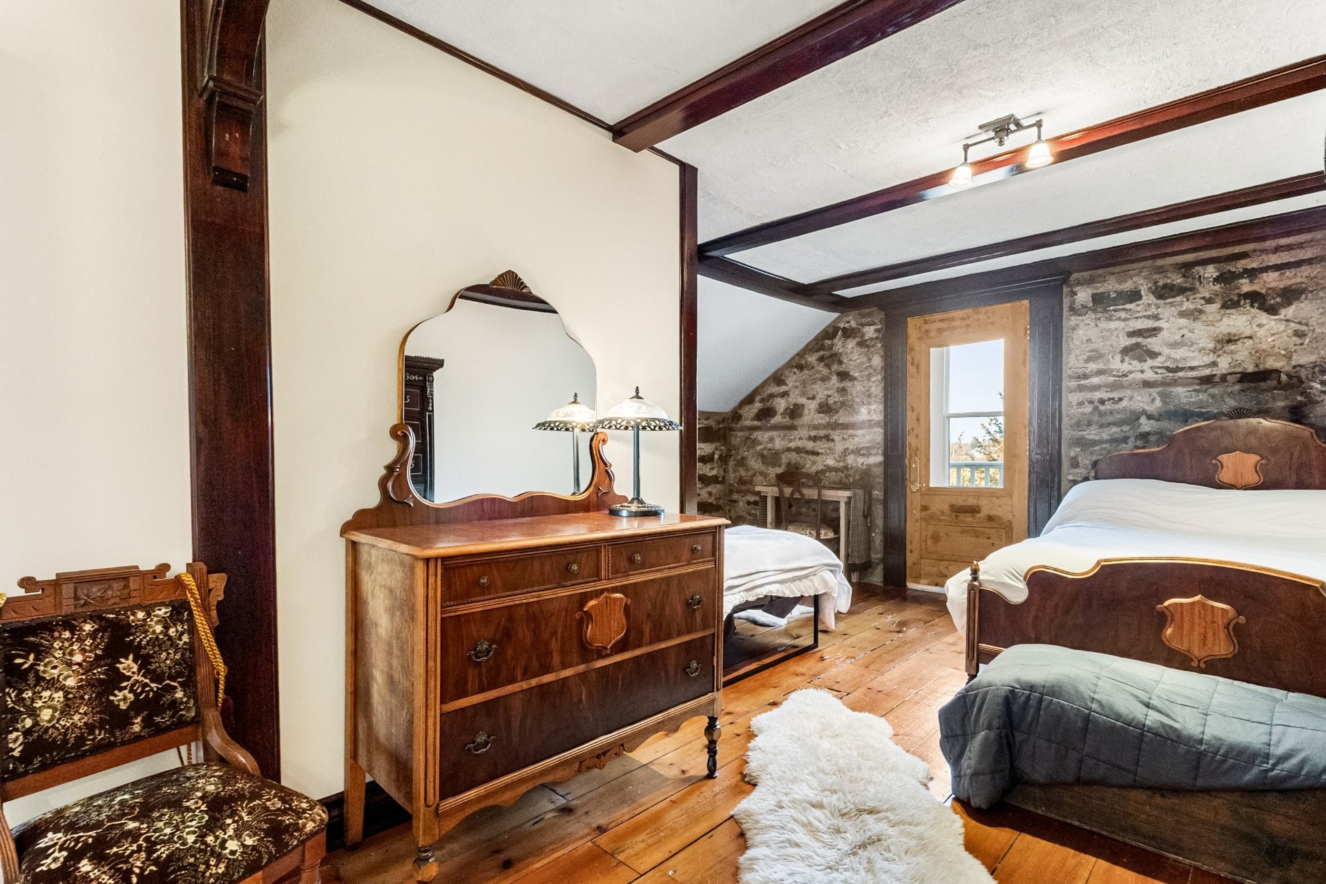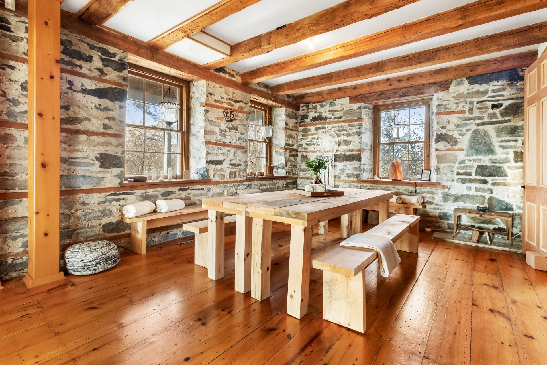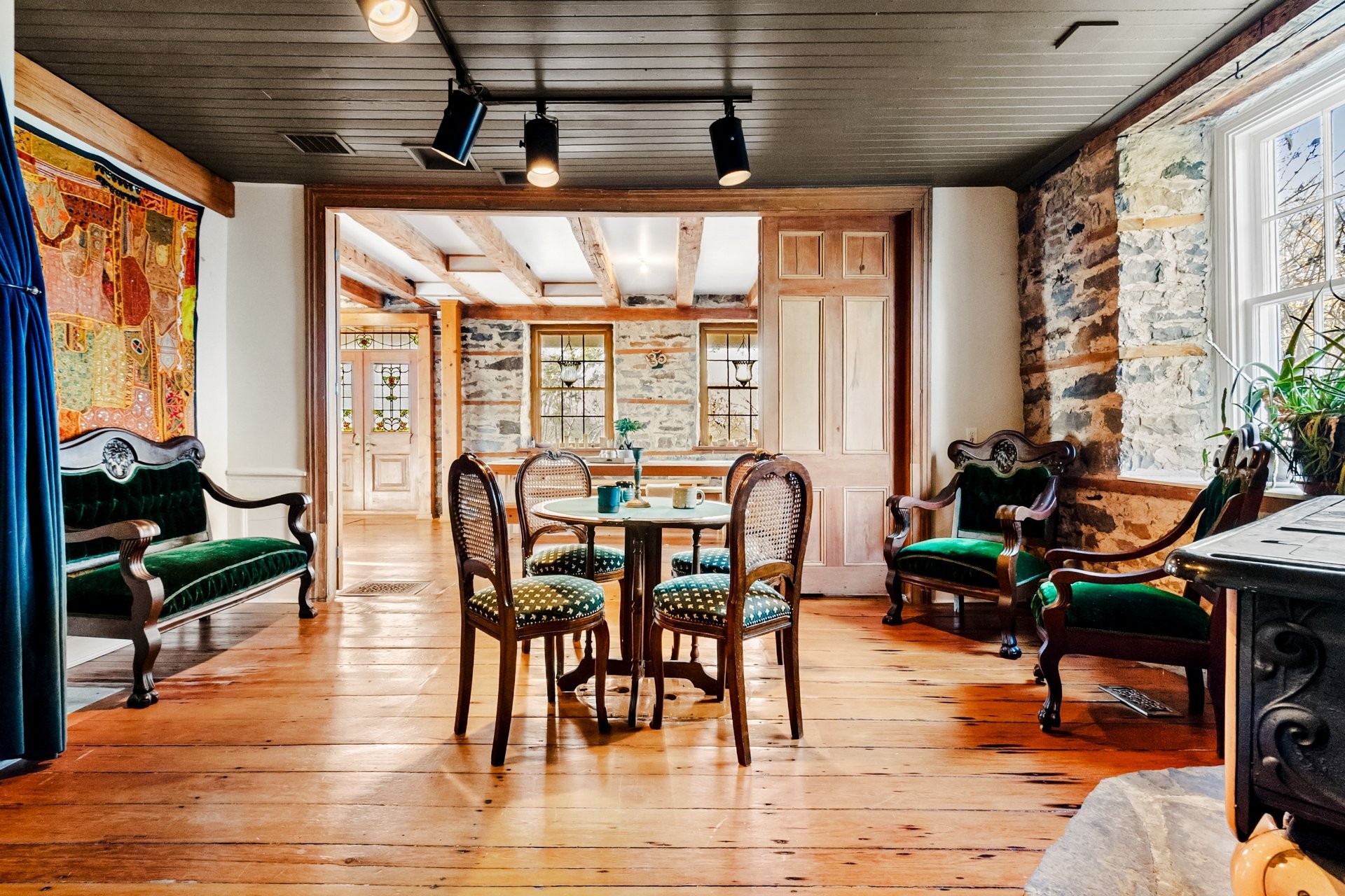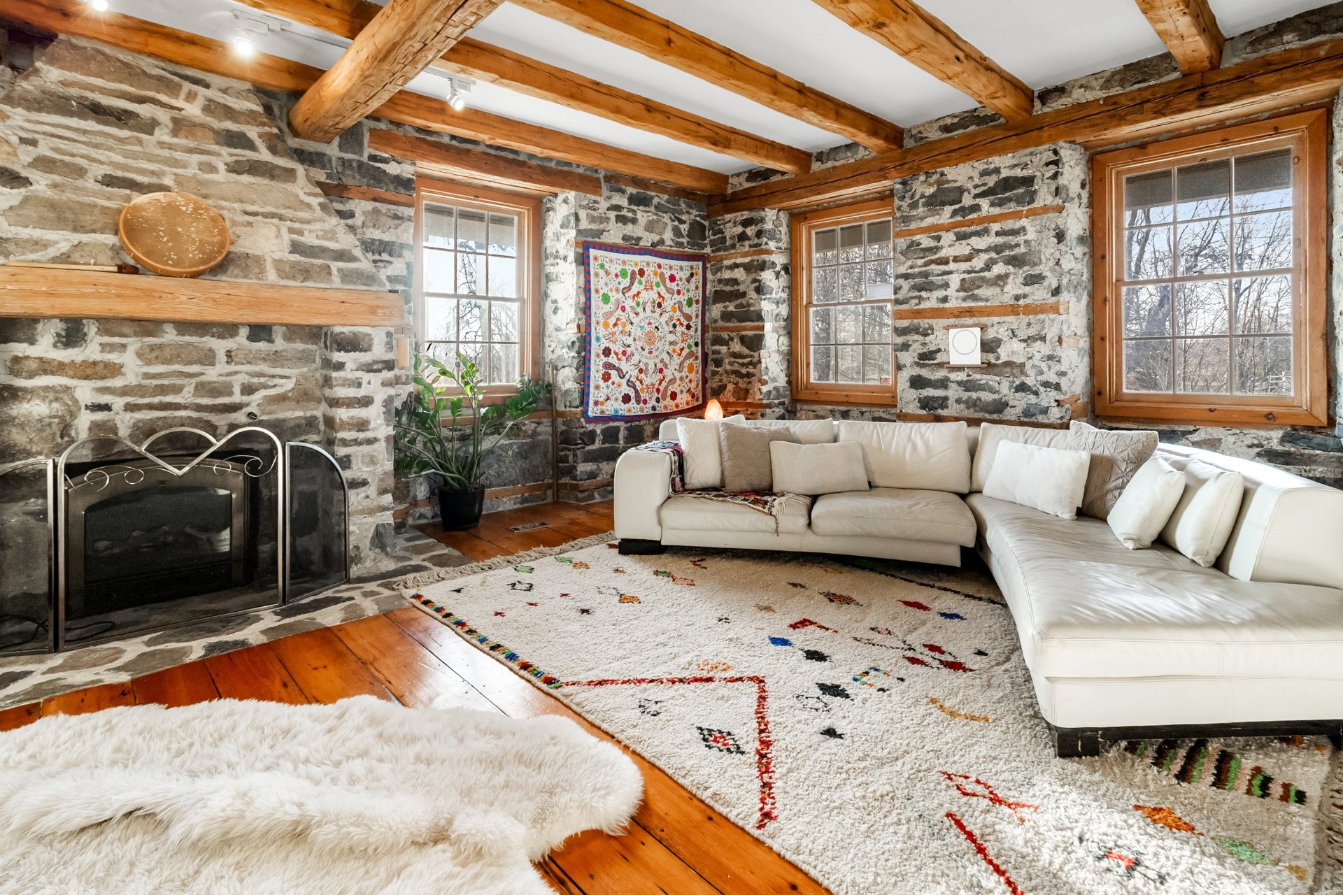 Set on a picturesque country lot in Hinchinbrooke, this exceptional stone residence offers a rare opportunity to combine heritage charm with established short-term rental and retreat use. Rich in character, the home features exposed stone walls, hand-hewn beams, wide plank wood floors, and multiple fireplaces, creating a warm and authentic atmosphere throughout.