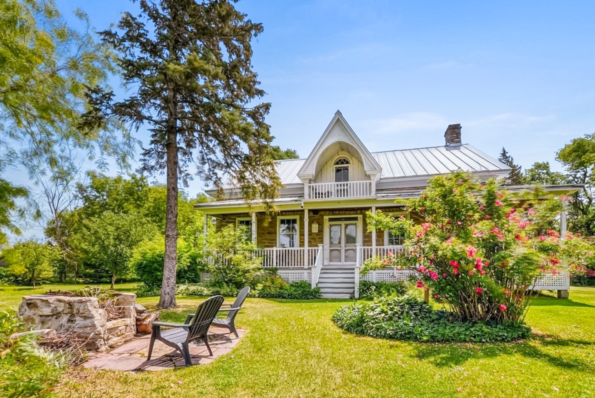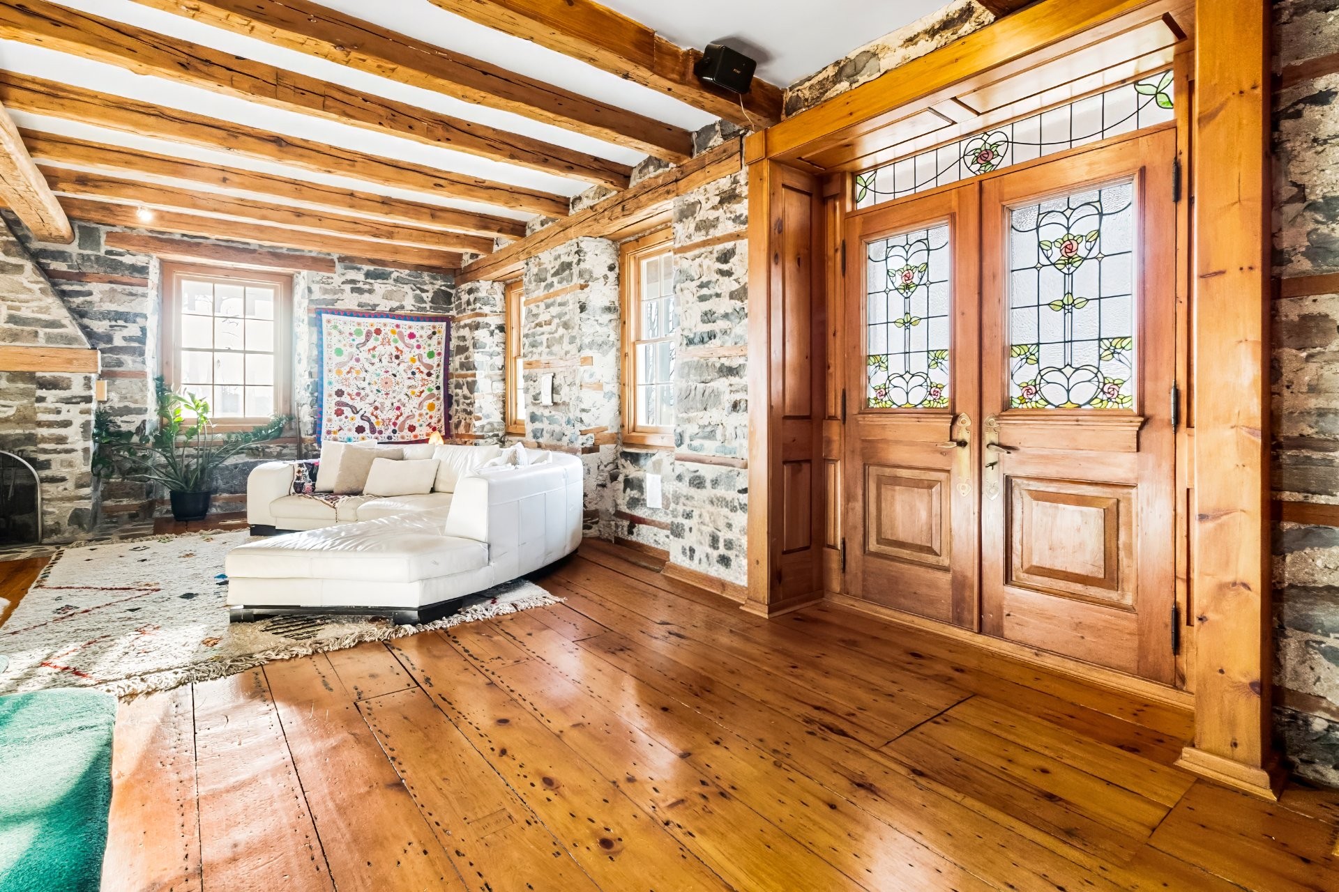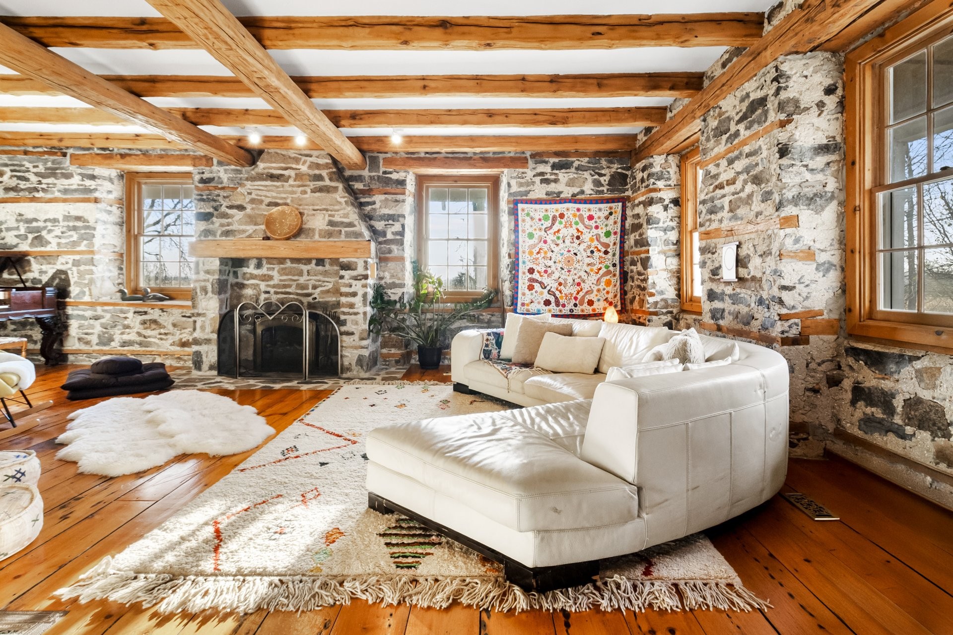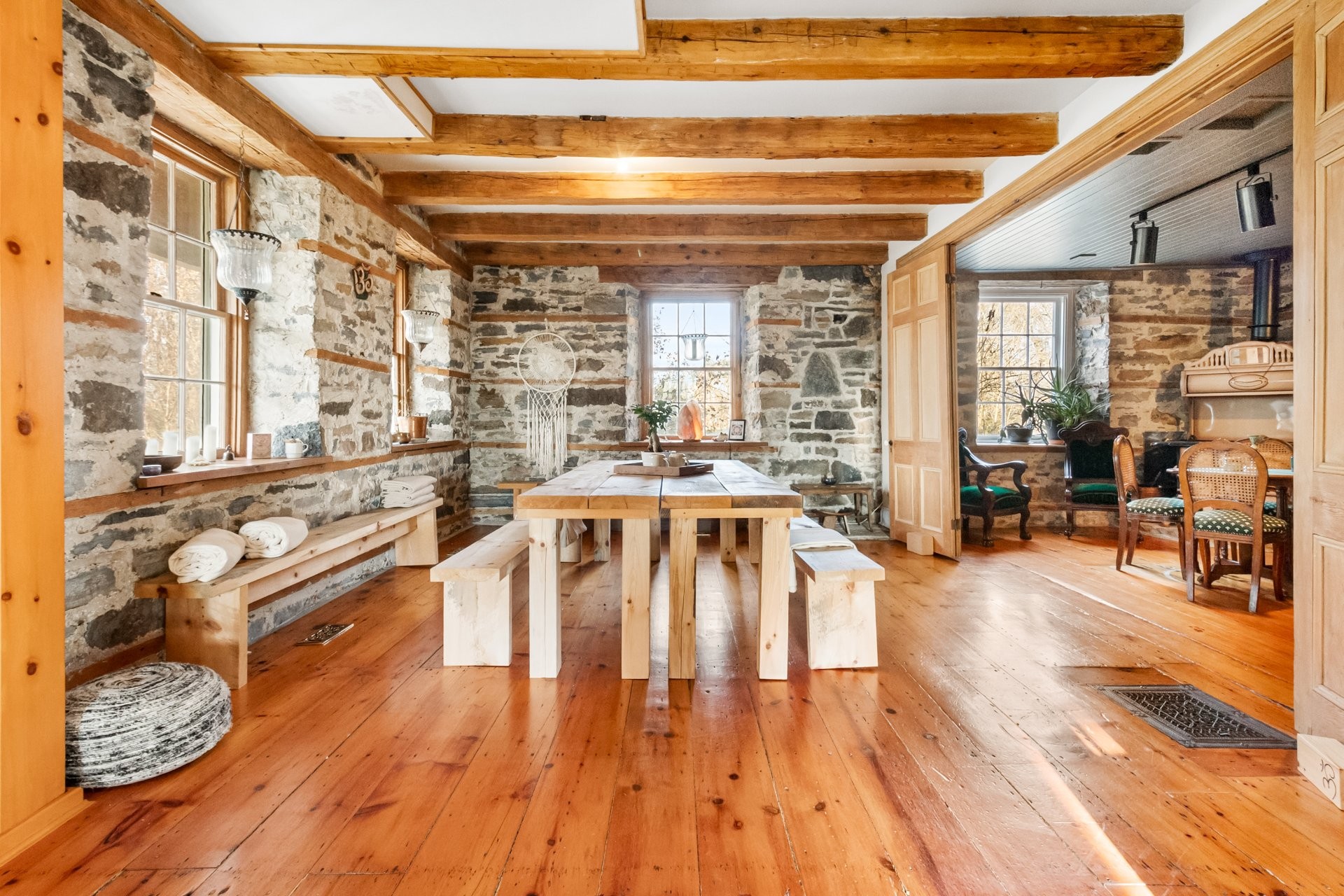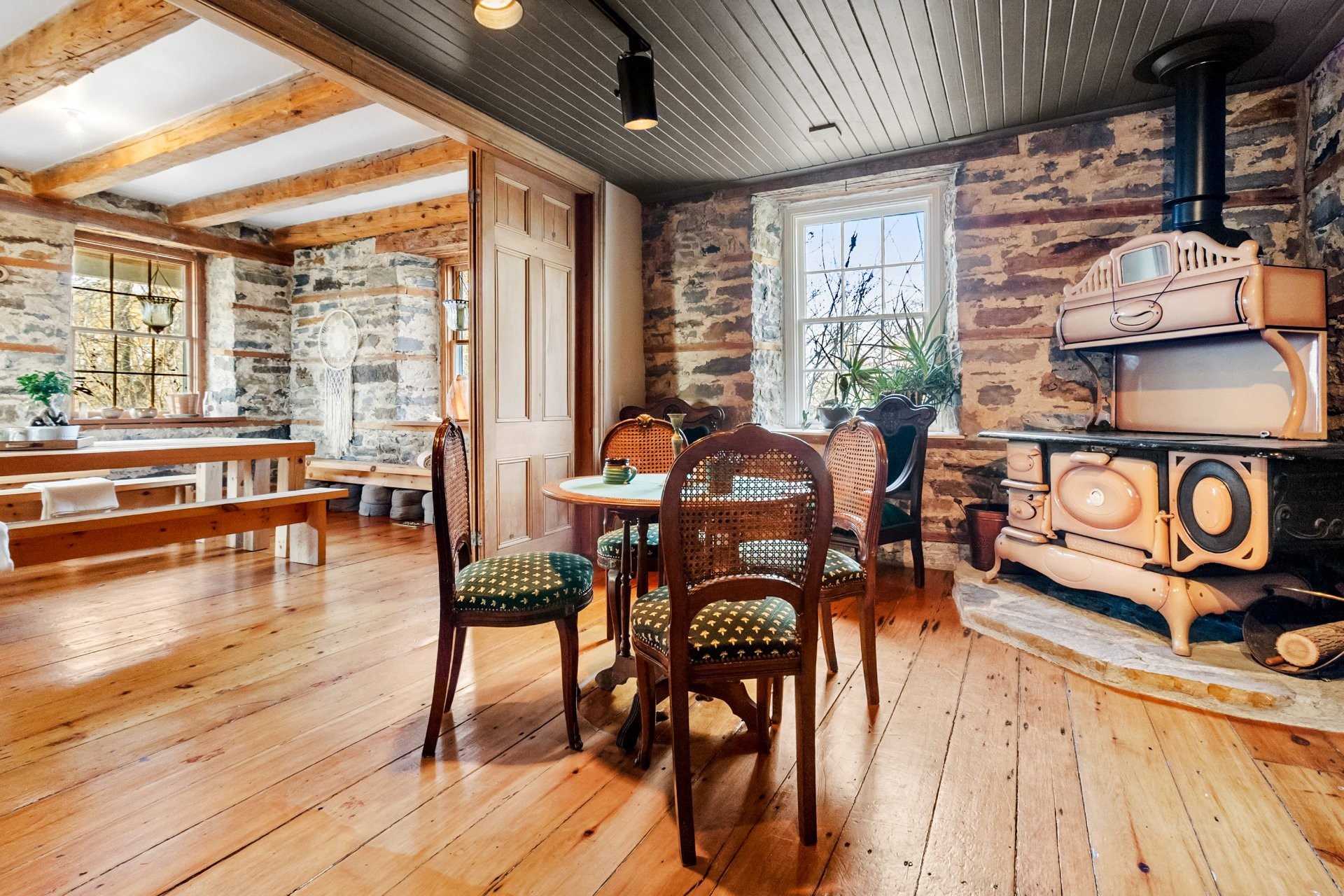 Set on a picturesque country lot in Hinchinbrooke, this exceptional stone residence offers a rare opportunity to combine heritage charm with established short-term rental and retreat use. Rich in character, the home features exposed stone walls, hand-hewn beams, wide plank wood floors, and multiple fireplaces, creating a warm and authentic atmosphere throughout.