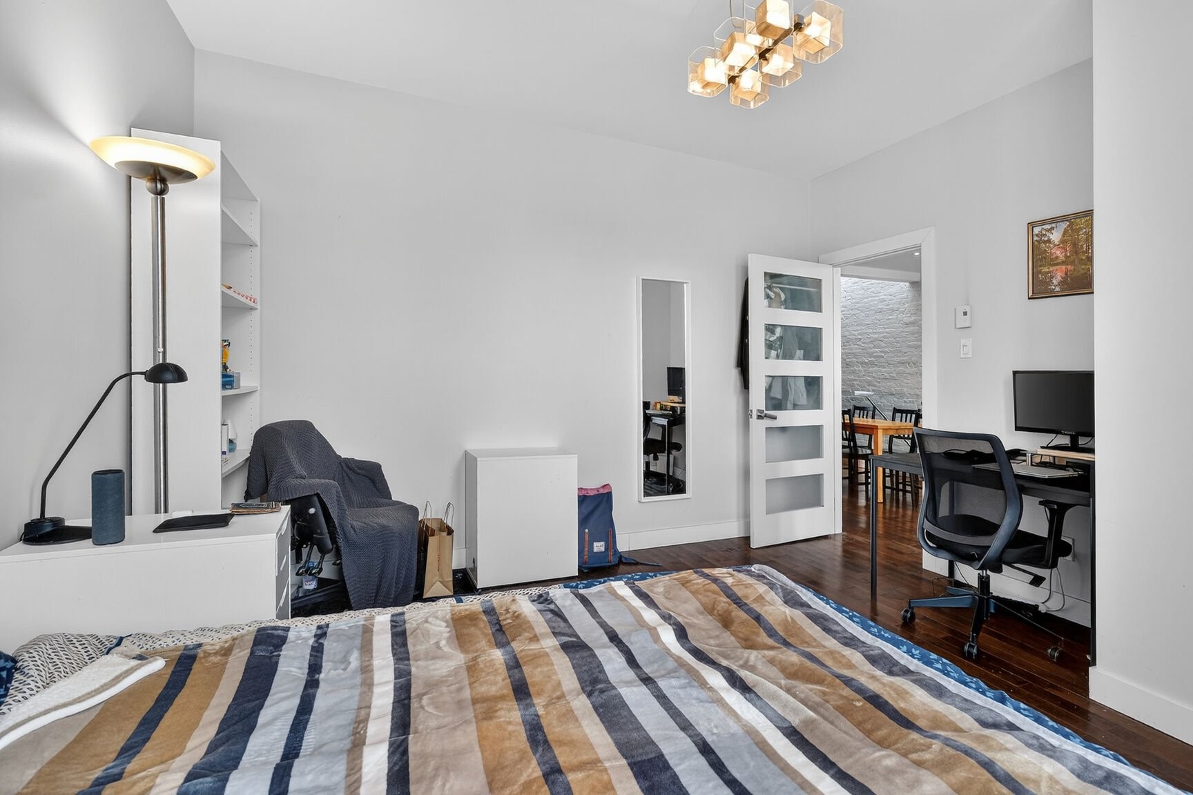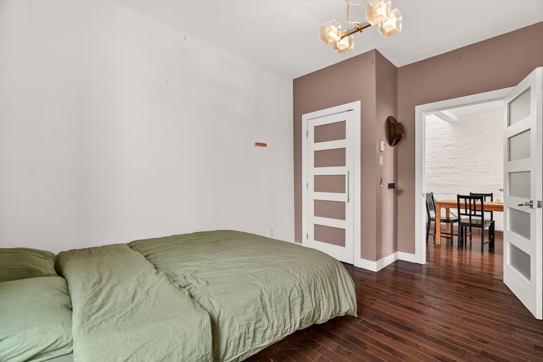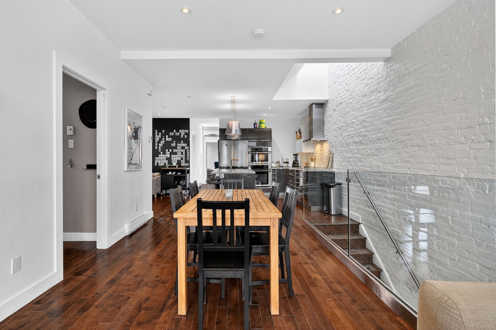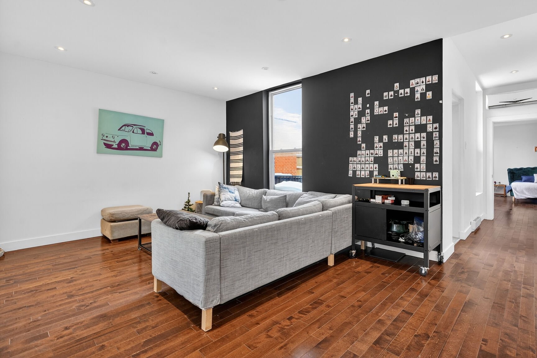 The living area impresses with its balanced volumes and abundant natural light, thanks to windows on two façades and a thoughtfully integrated skylight in the kitchen. The hardwood floors, quartz countertops, and overall quality of the finishes reflect a complete renovation carried out in 2012, designed with durability, elegance and functionality in mind.