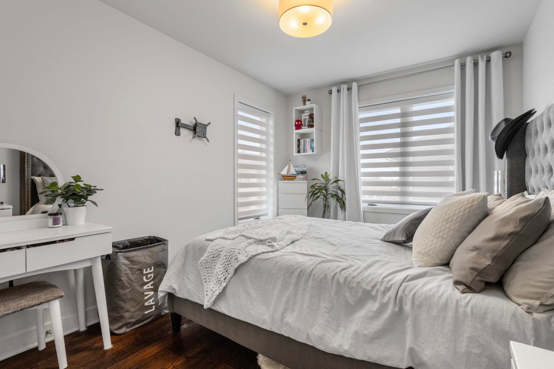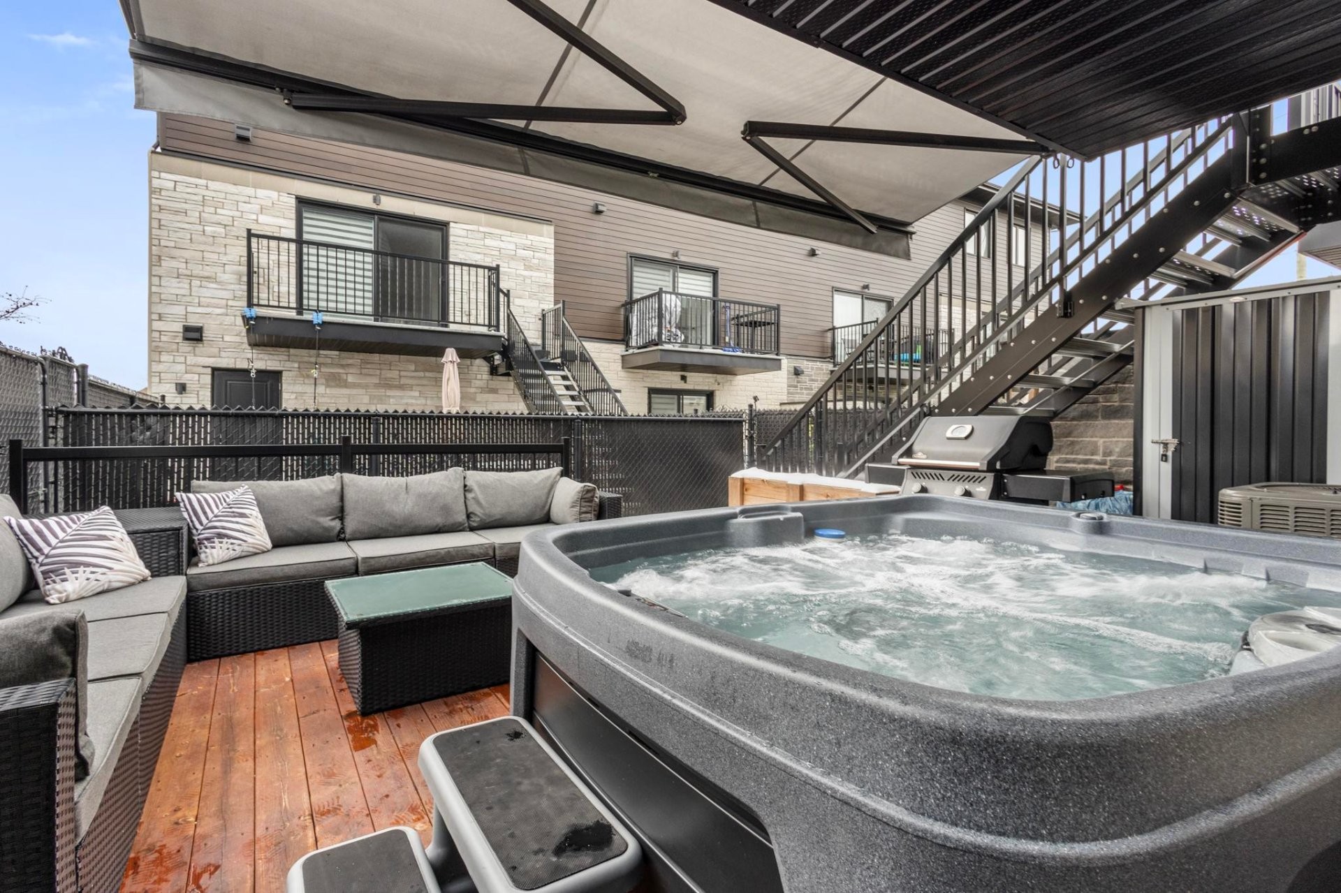 Spa Pole and blinds included Patio furniture (L-shaped sofa with cushions and table) Bistro set for upper balcony Napoleon natural gas BBQ (4 years old) Wall-mounted racks in the garage Laundry room storage Retractable awning Outdoor metal storage unit Central vacuum Organizers in all closets throughout the property