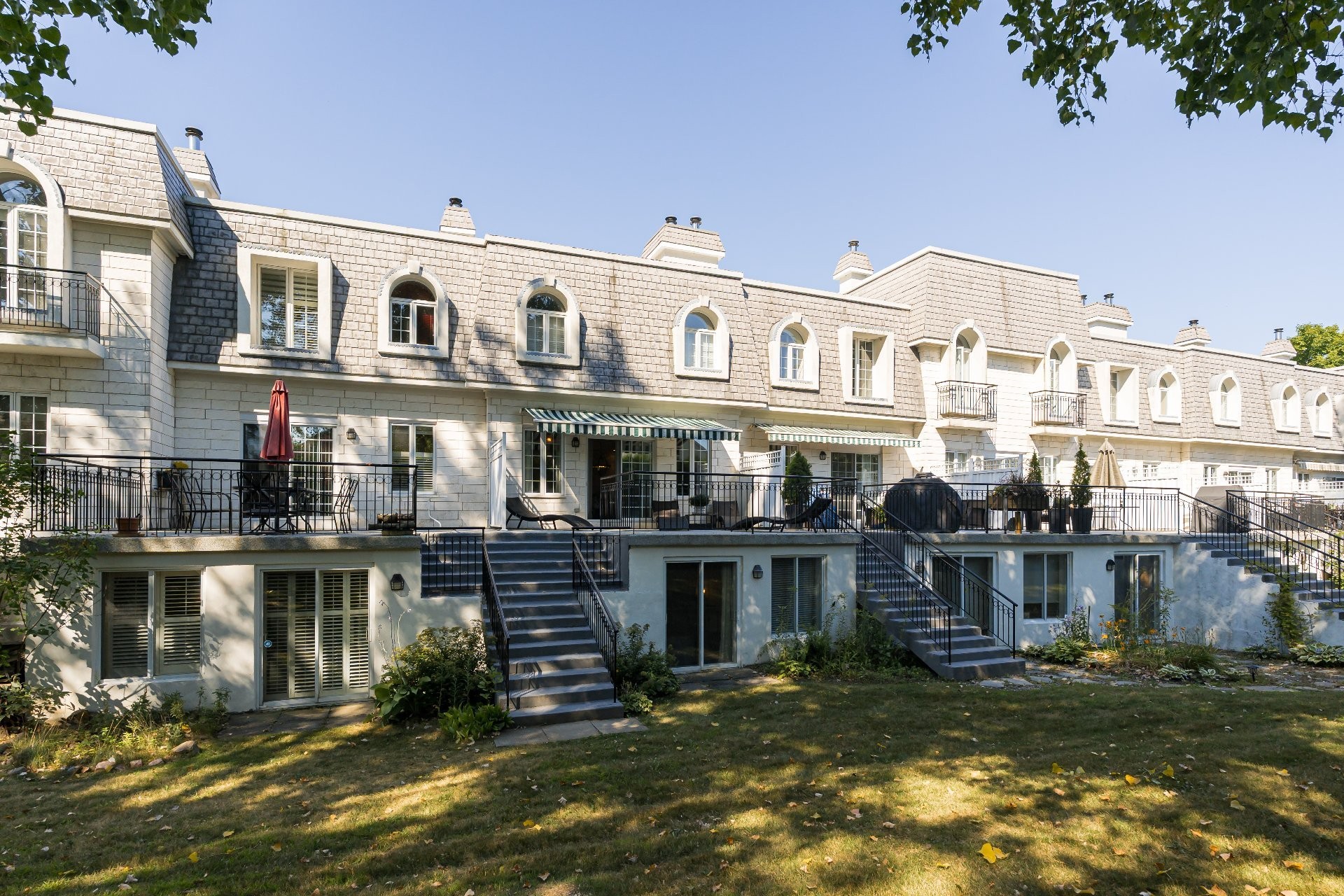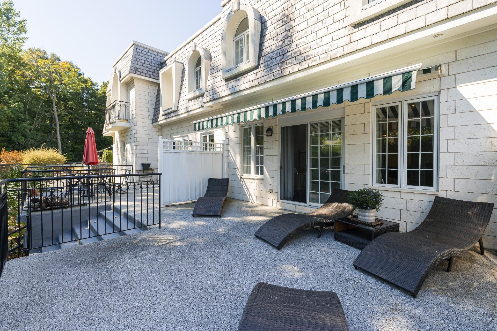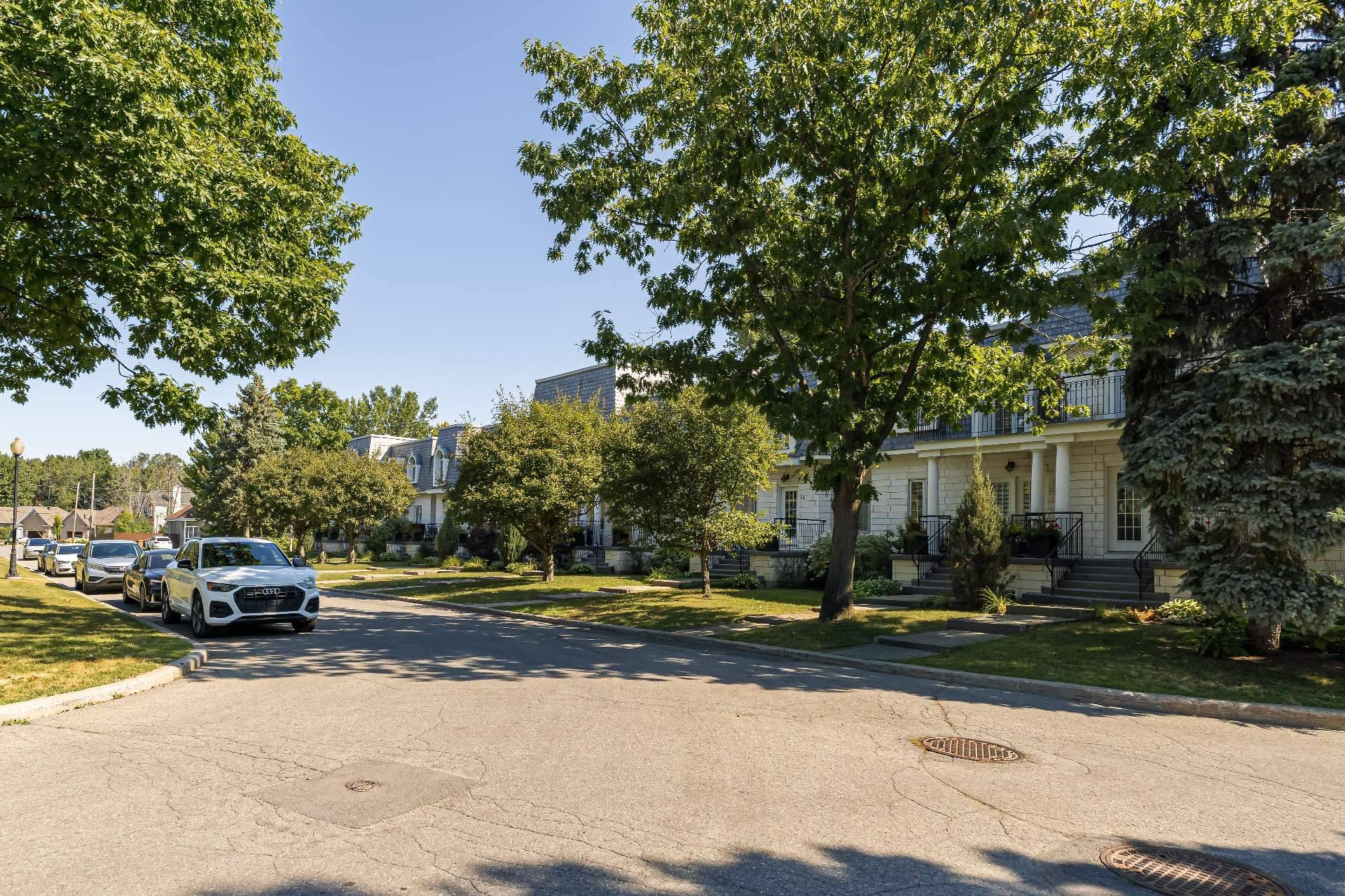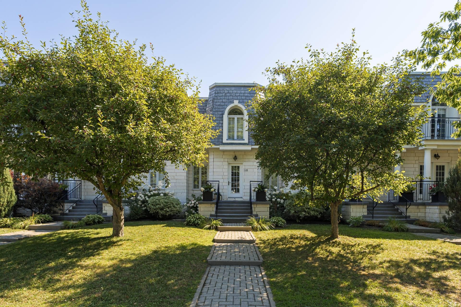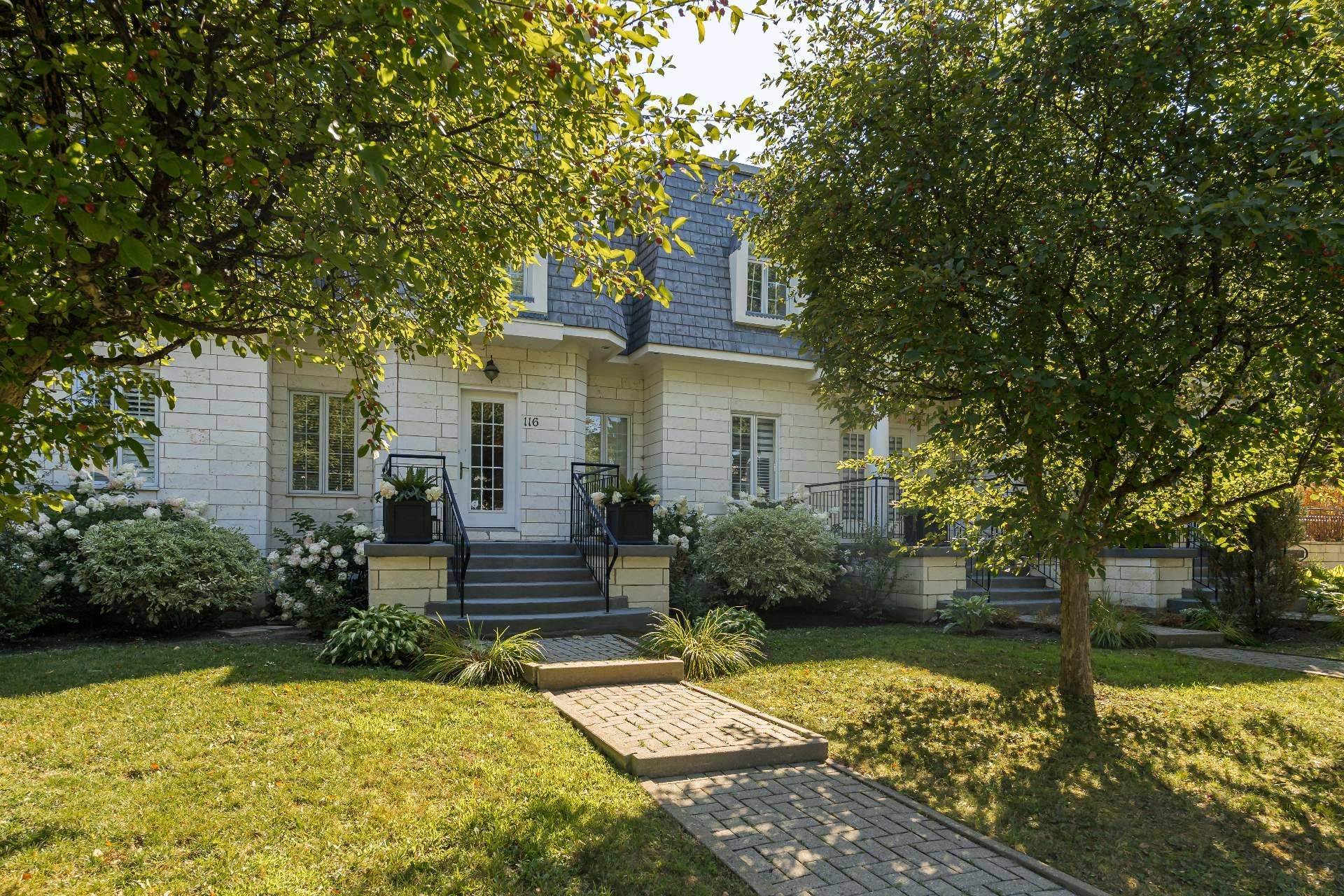 Les Castels du Lac - Fully renovated 2+1 bedroom, 3+1 bathroom townhouse with high-end finishes! Inspired by le Petit Trianon in Versailles this rare larger unit has an open concept living and dining room area, separate kitchen and powder room. The second level has a spacious primary bedroom with ensuite bathroom, and the second bedroom was originally two separate rooms that can easily be converted back to have three bedrooms upstairs. The basement has a family room with patio doors accessing the yard, a bedroom, and full bathroom with laundry. Enjoy the serene private backyard with sizeable deck and leisure area on a secluded street!