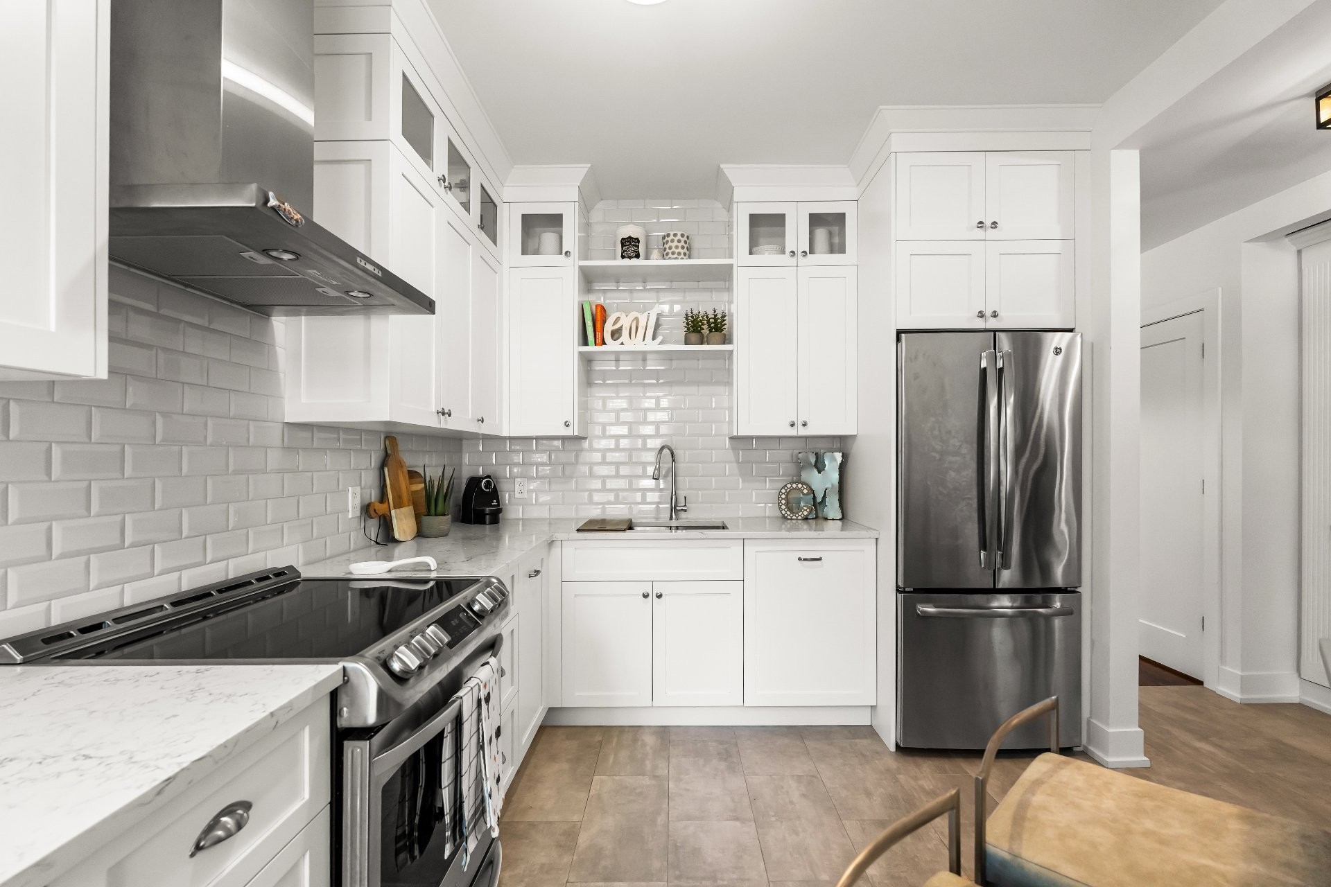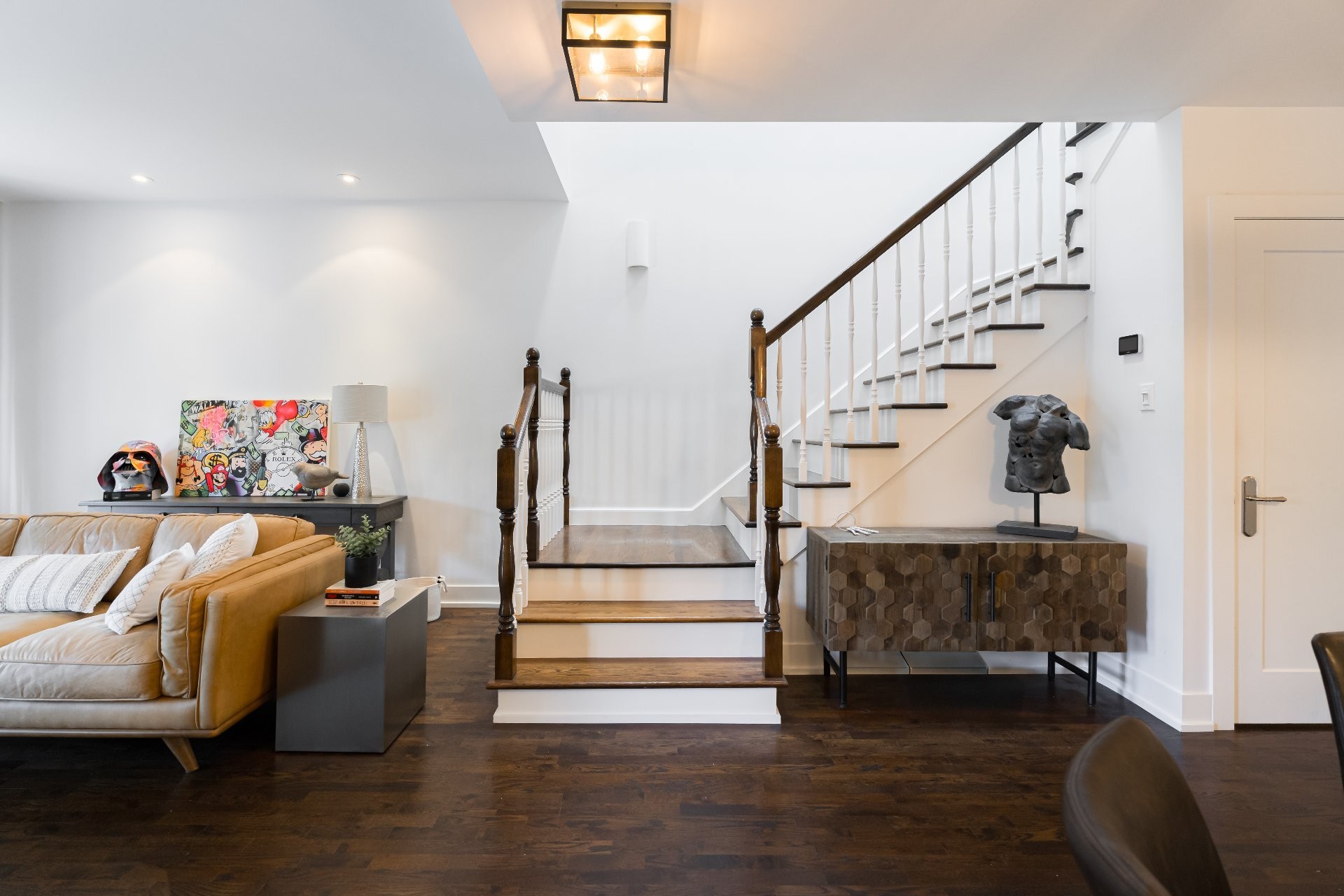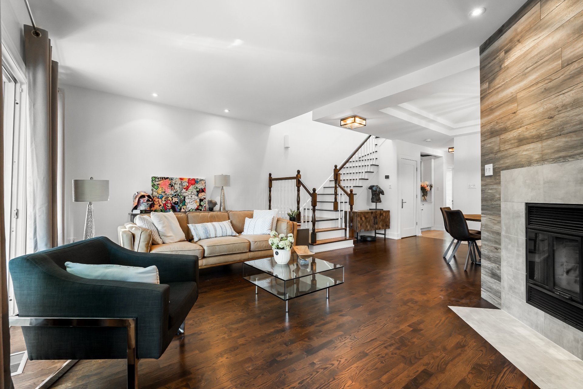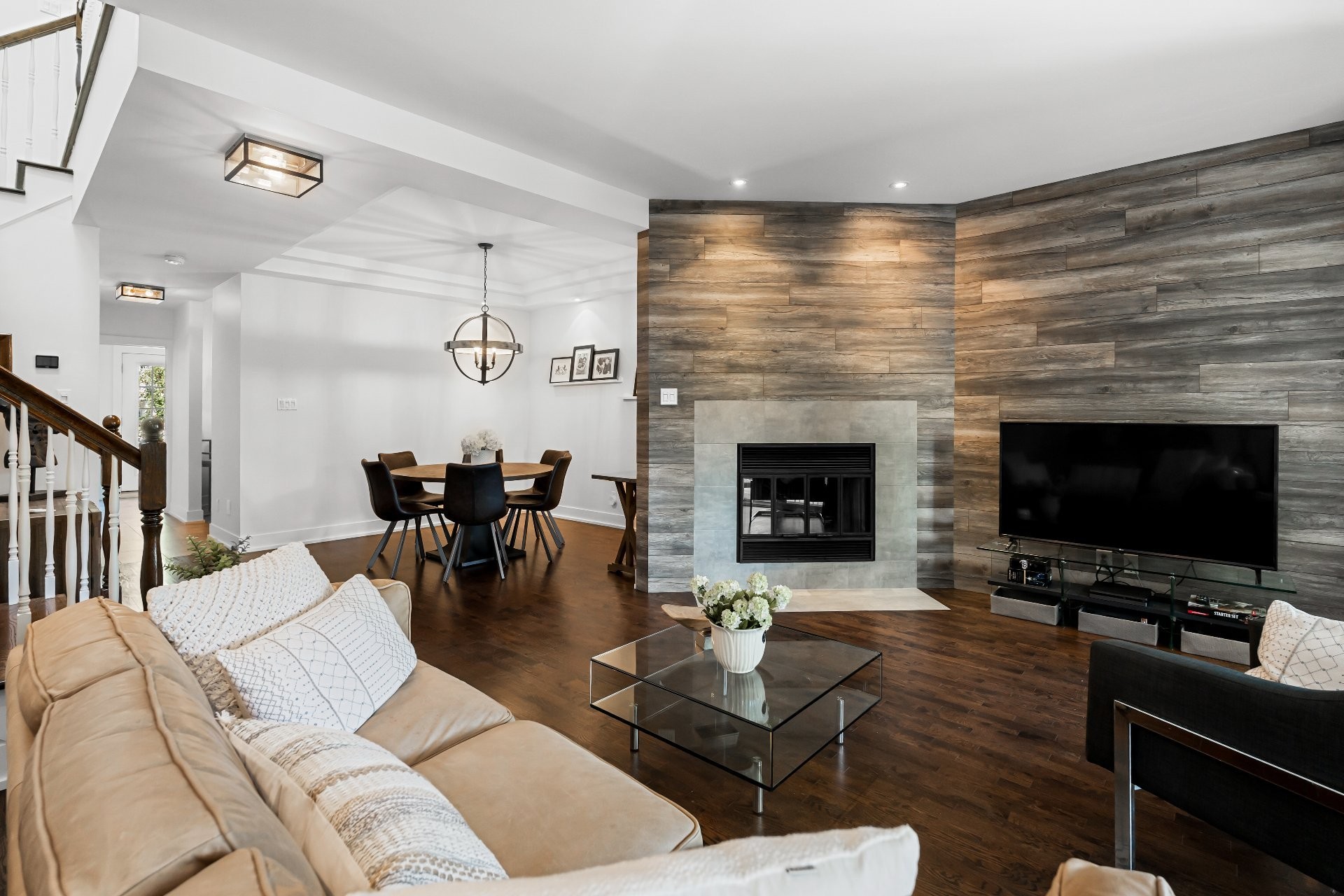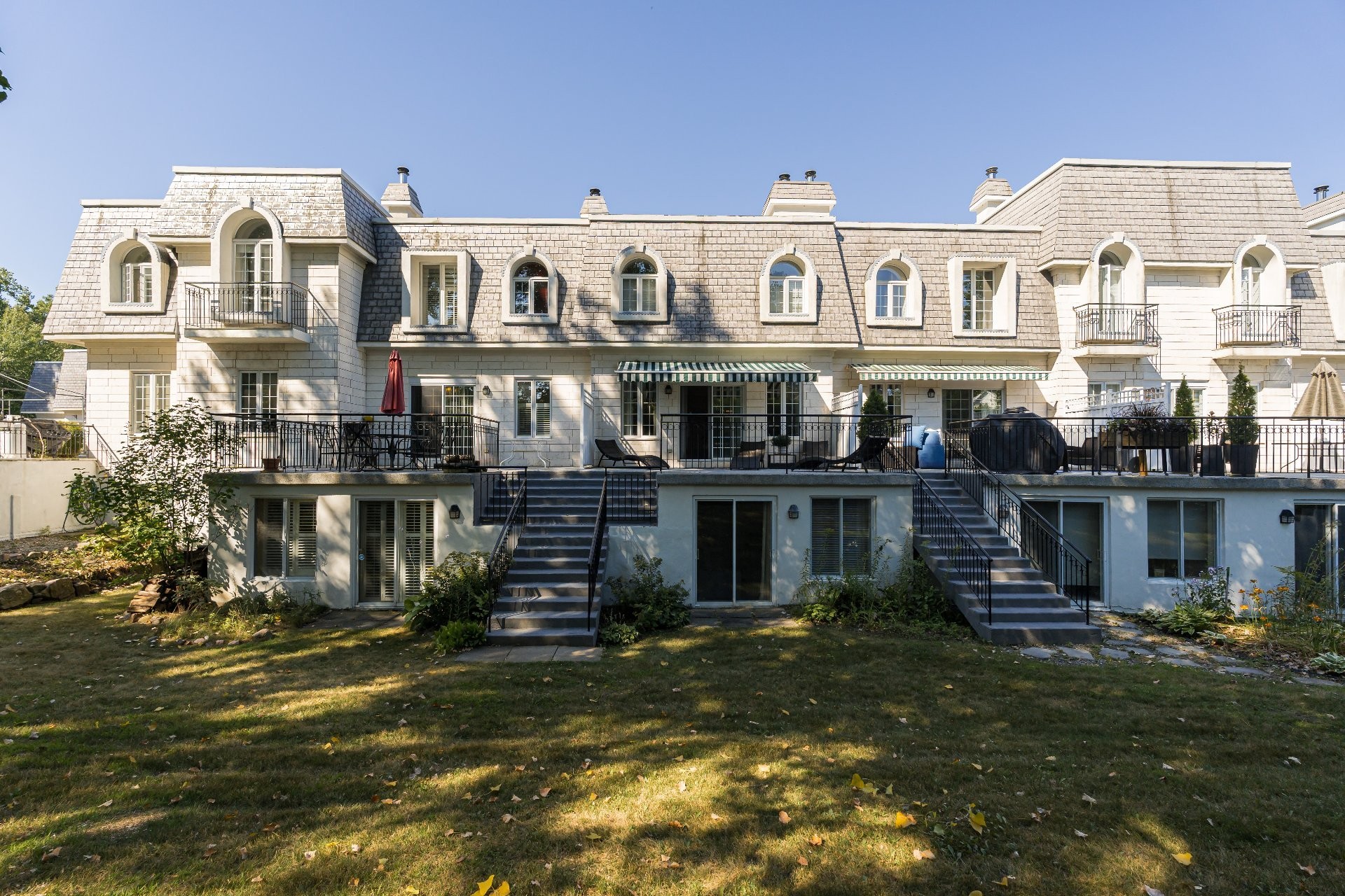 Les Castels du Lac - Fully renovated 2+1 bedroom, 3+1 bathroom townhouse with high-end finishes! Inspired by le Petit Trianon in Versailles this rare larger unit has an open concept living and dining room area, separate kitchen and powder room. The second level has a spacious primary bedroom with ensuite bathroom, and the second bedroom was originally two separate rooms that can easily be converted back to have three bedrooms upstairs. The basement has a family room with patio doors accessing the yard, a bedroom, and full bathroom with laundry. Enjoy the serene private backyard with sizeable deck and leisure area on a secluded street!
