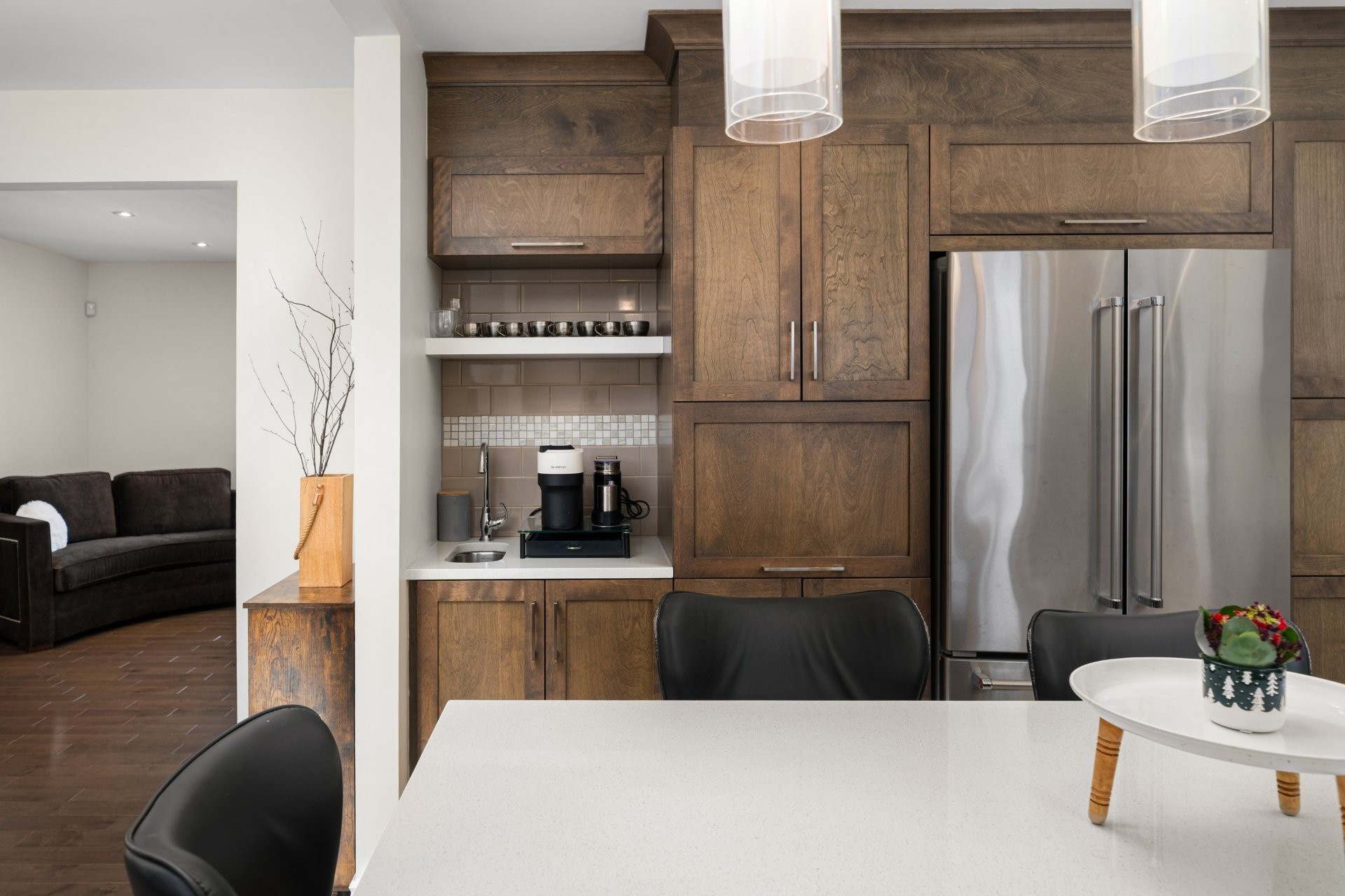 The main floor features a functional and inviting layout, perfect for everyday living and entertaining. A bright living room flows seamlessly into the open-concept kitchen and dining area. The updated kitchen boasts heated floors, a central island, a coffee station, and abundant cabinetry. The cozy family room includes an electric fireplace with custom built-ins and patio doors leading to a south-facing, fully fenced backyard--ideal for relaxing or hosting guests.