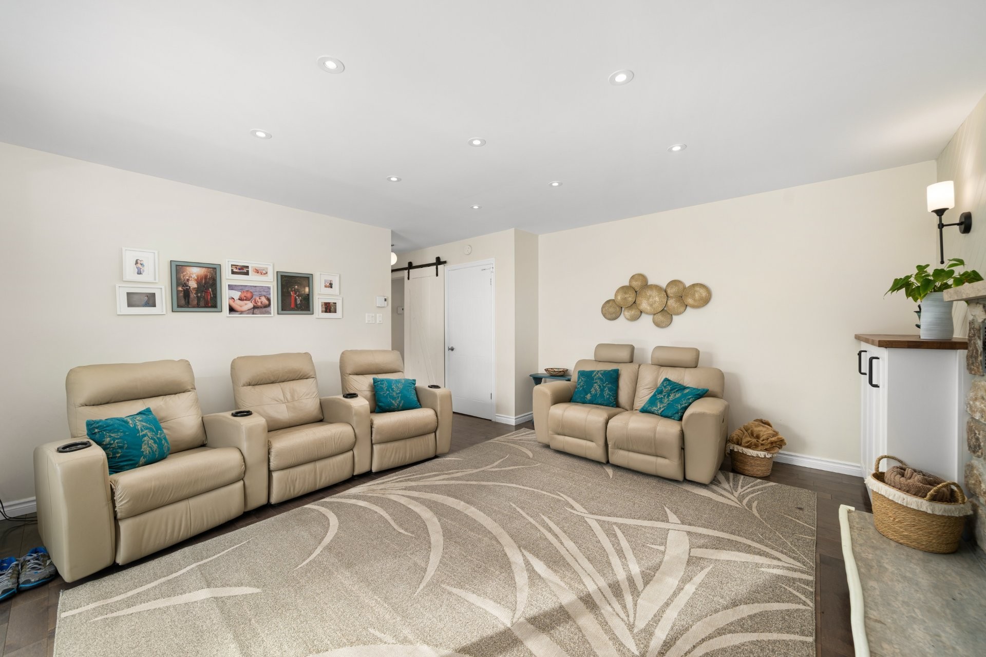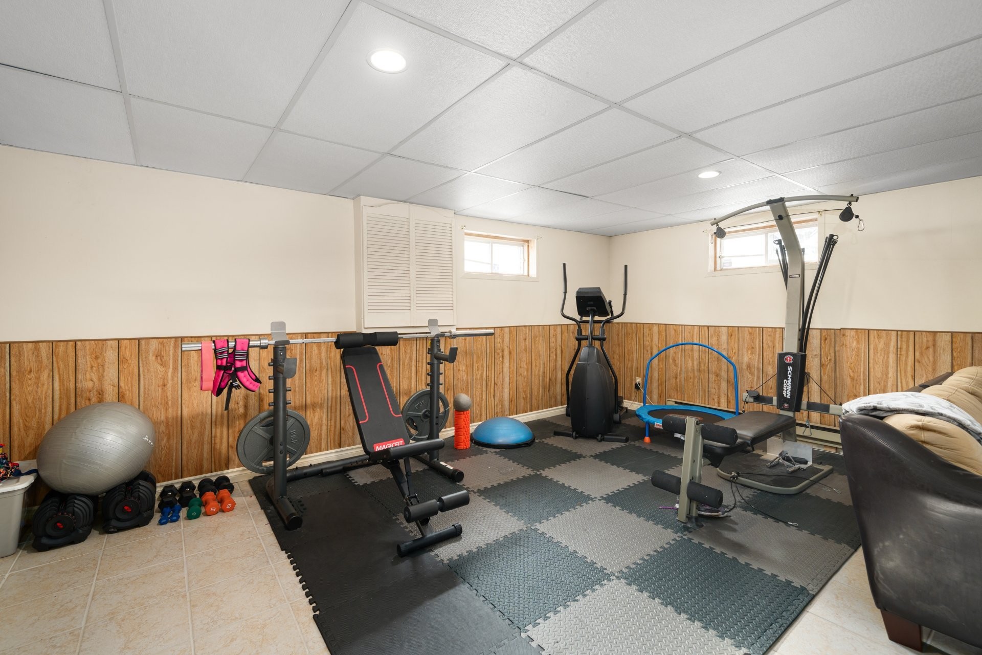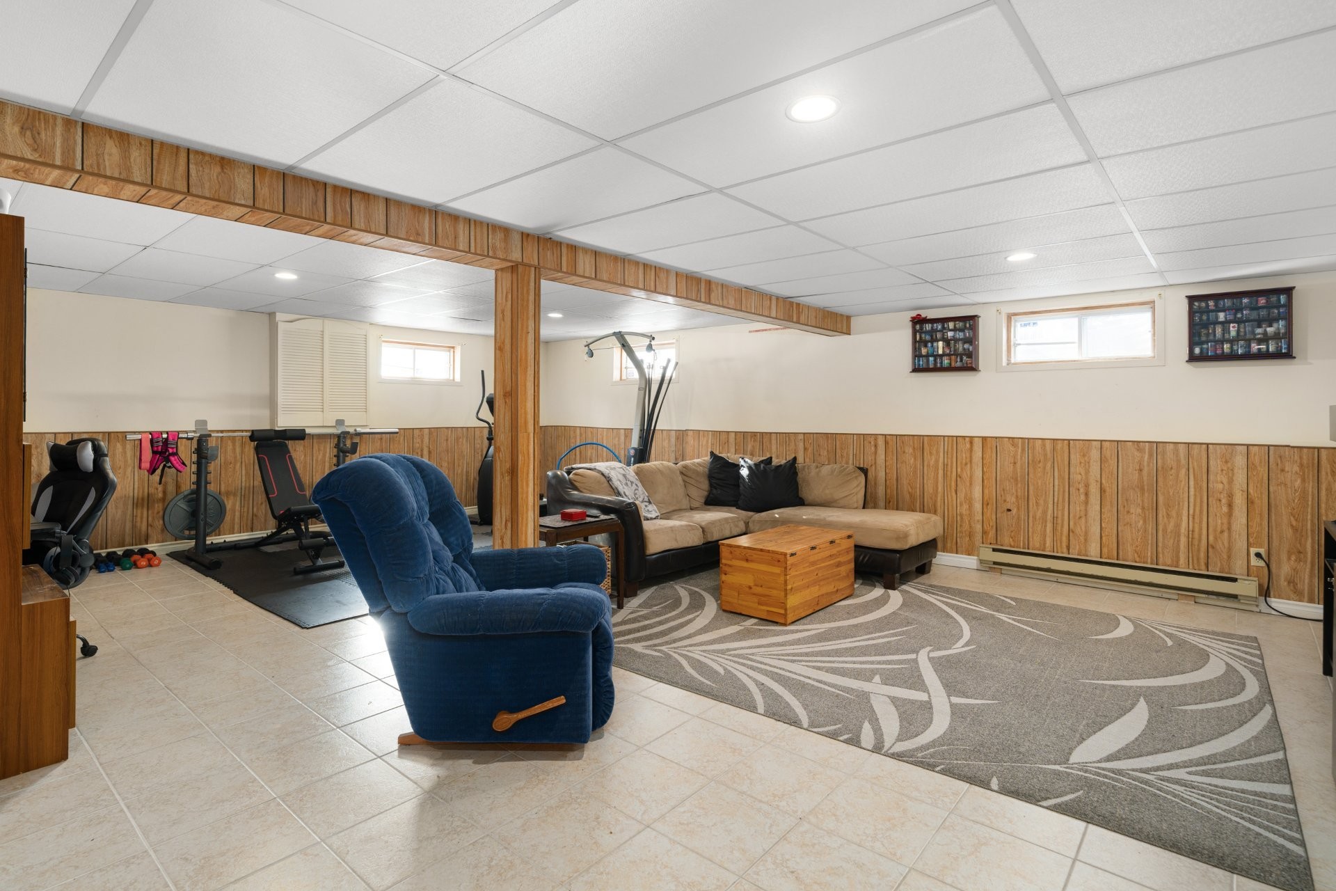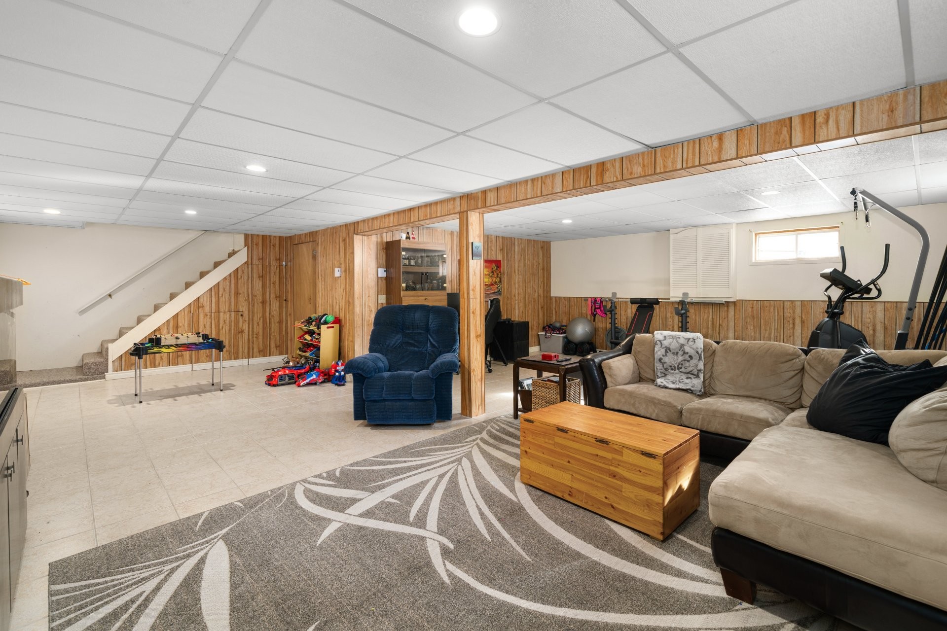 The finished basement provides versatile space for a playroom, home office, and ample storage.