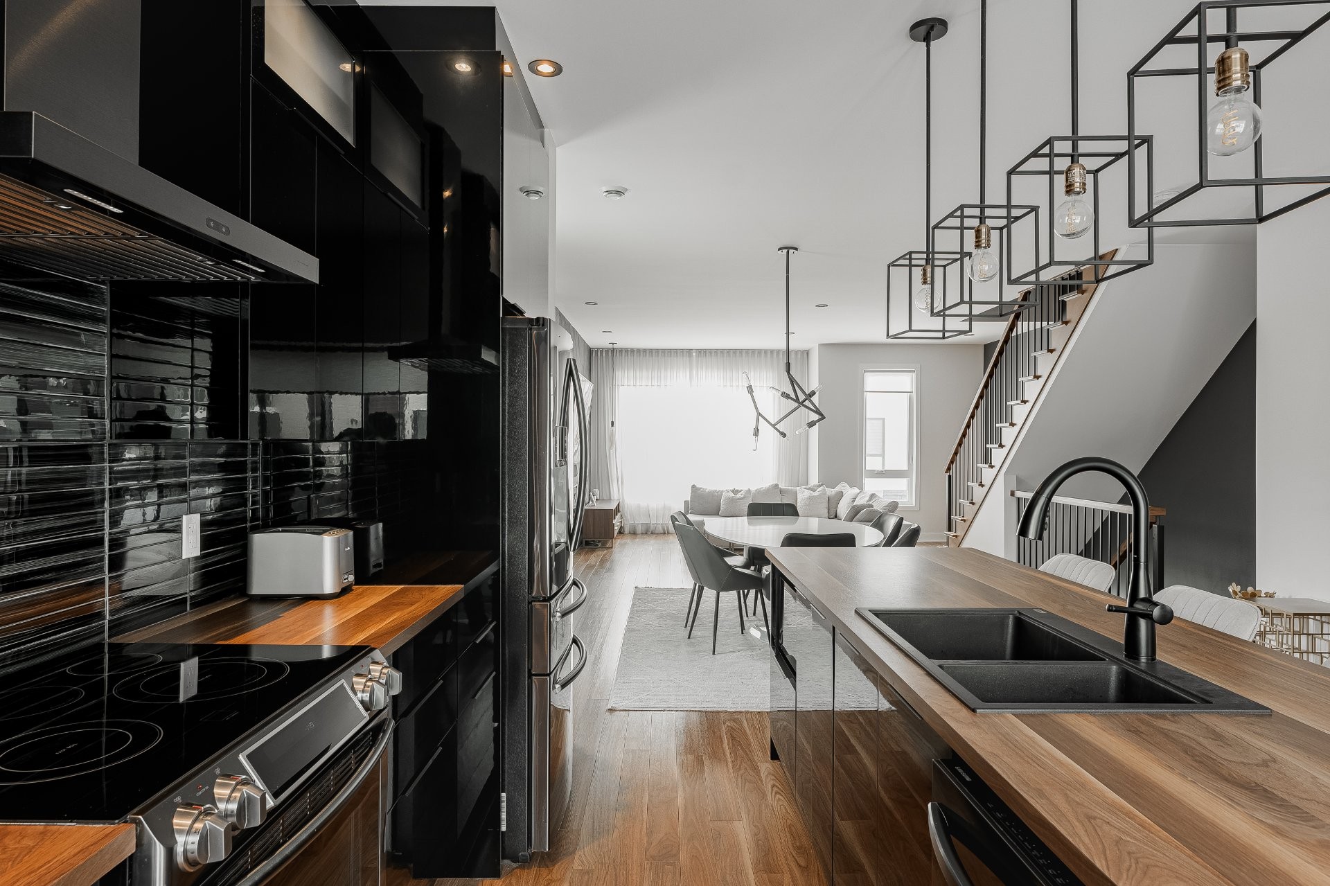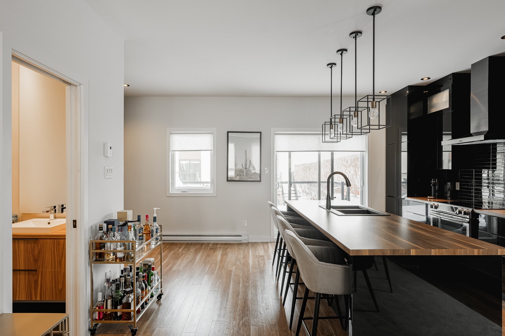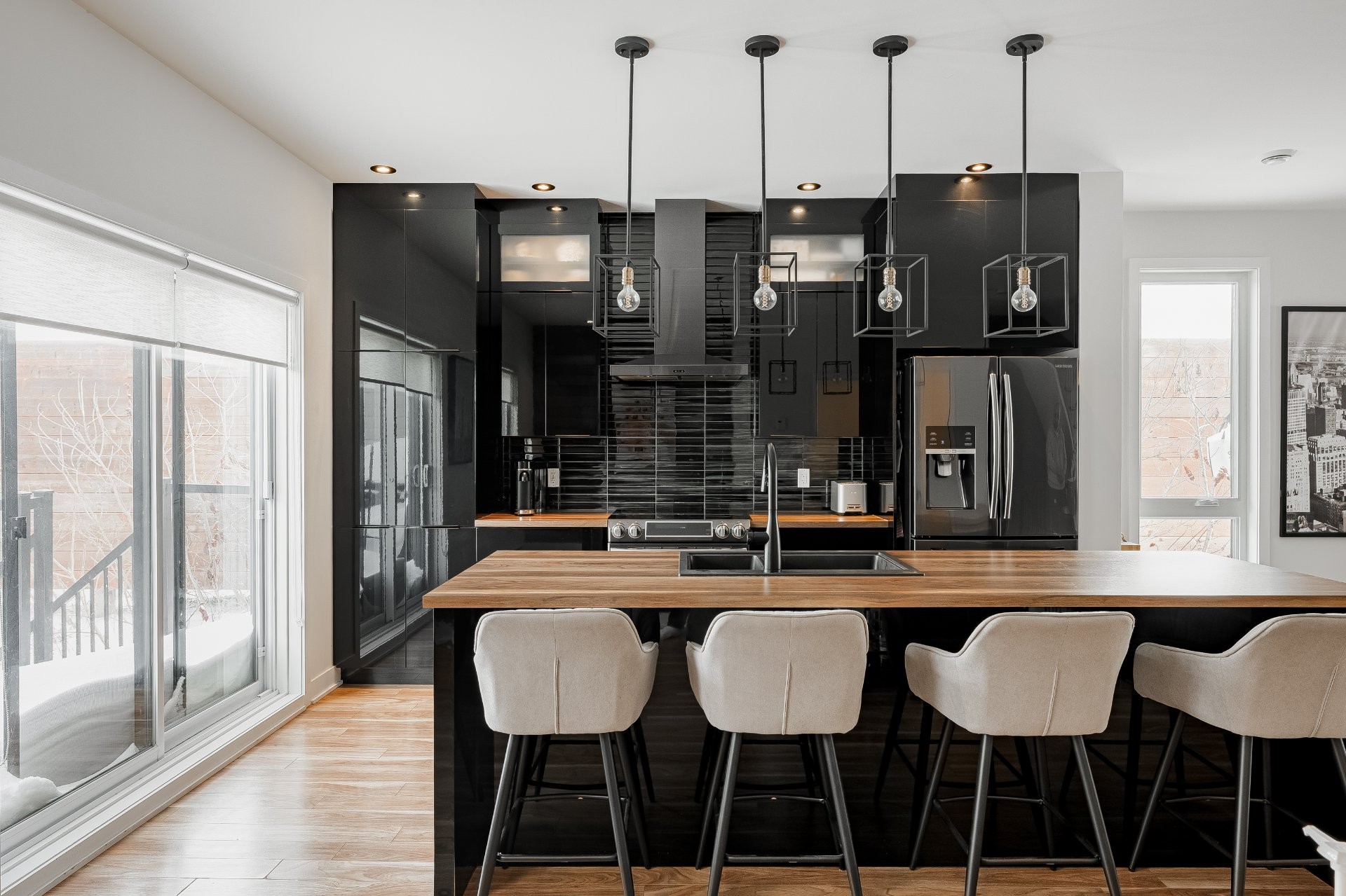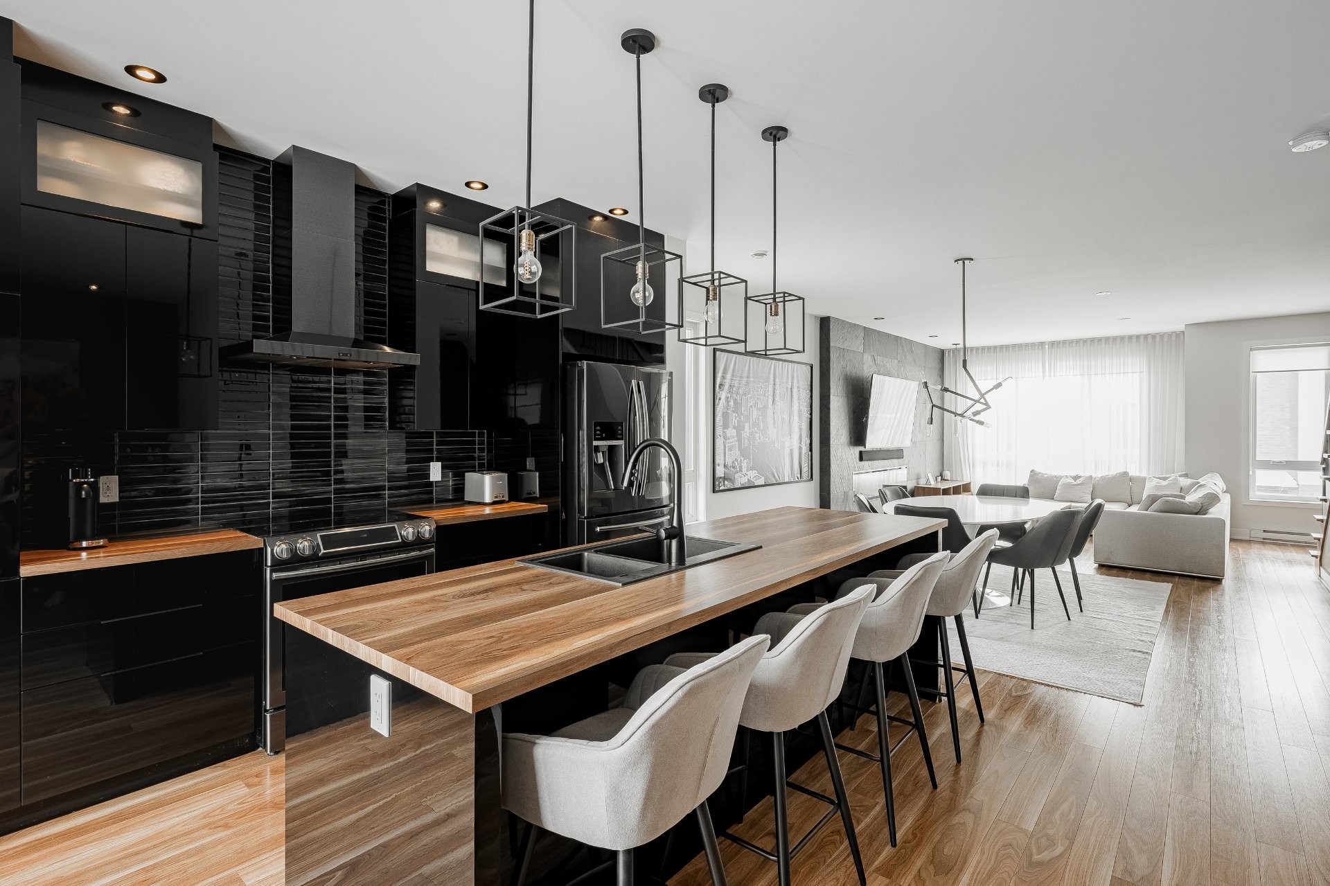 With all levels above ground, natural light pours in throughout the home. The main floor features 9-foot ceilings and an open-concept layout that feels both spacious and inviting. The kitchen is stylish and functional, complete with a large central island, sleek black cabinetry, ceramic backsplash, and a cozy nook perfect for a home office or reading space. A powder room is conveniently located on this level as well.