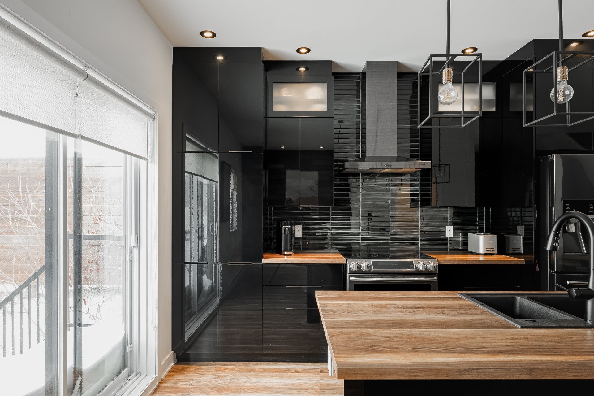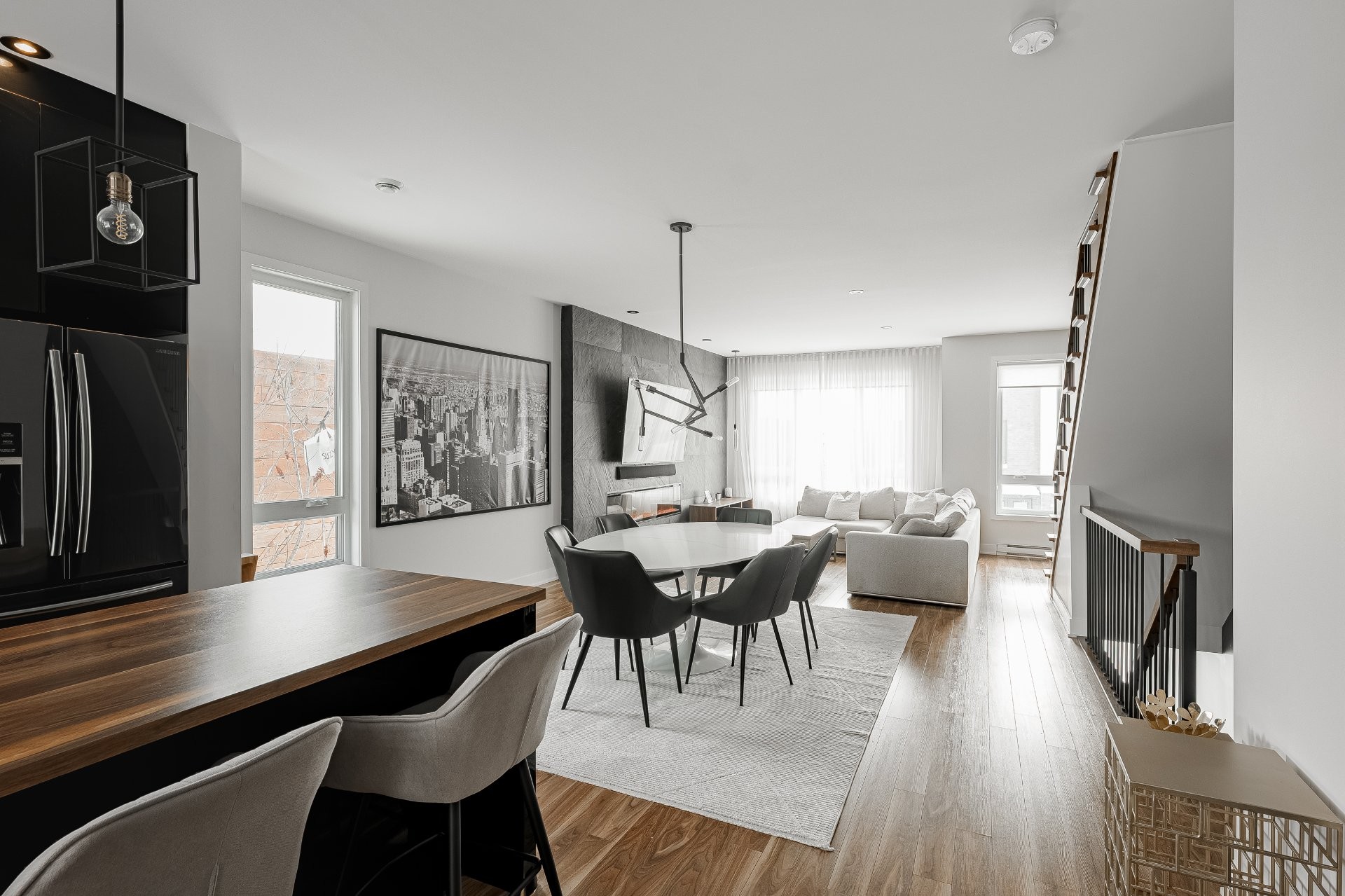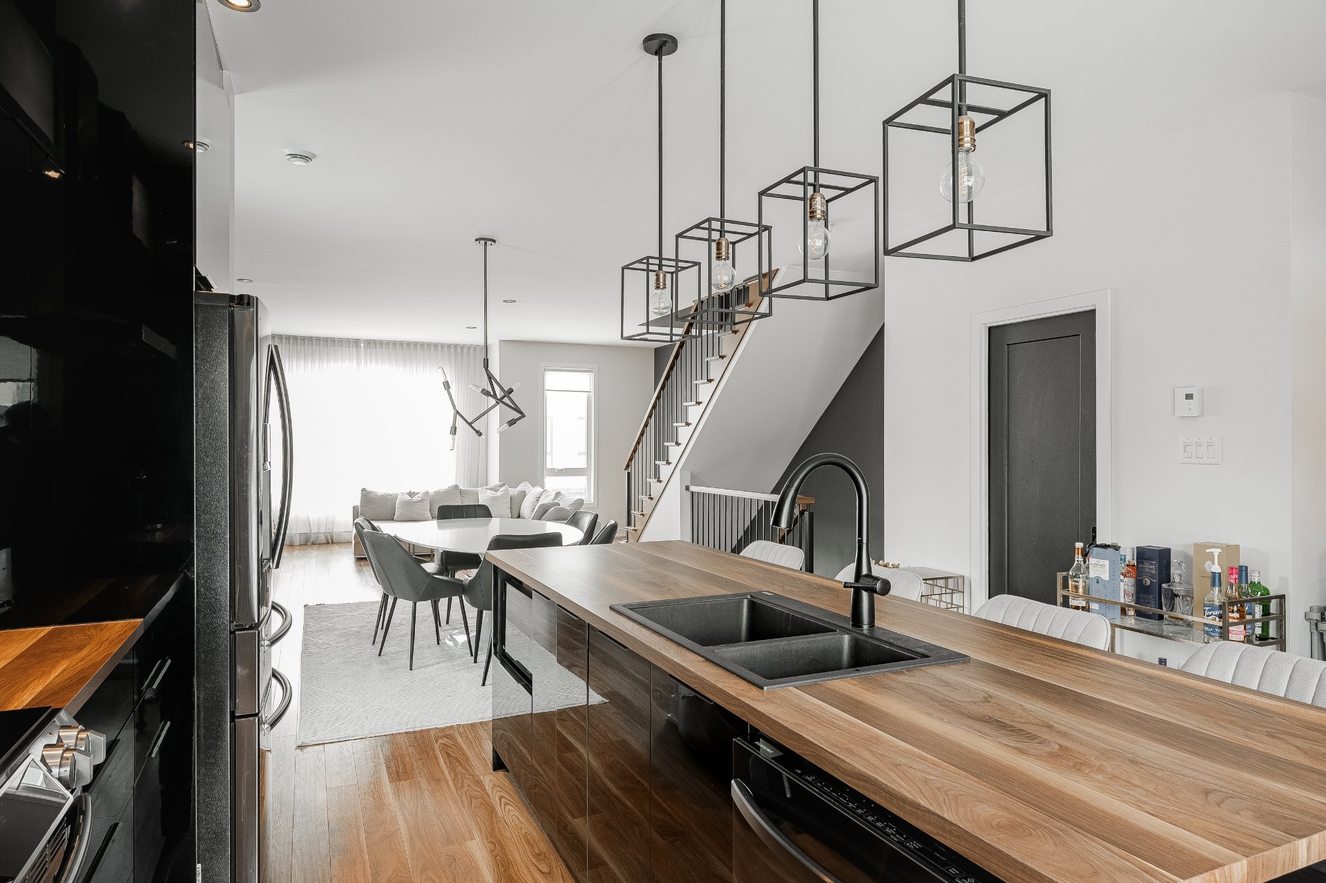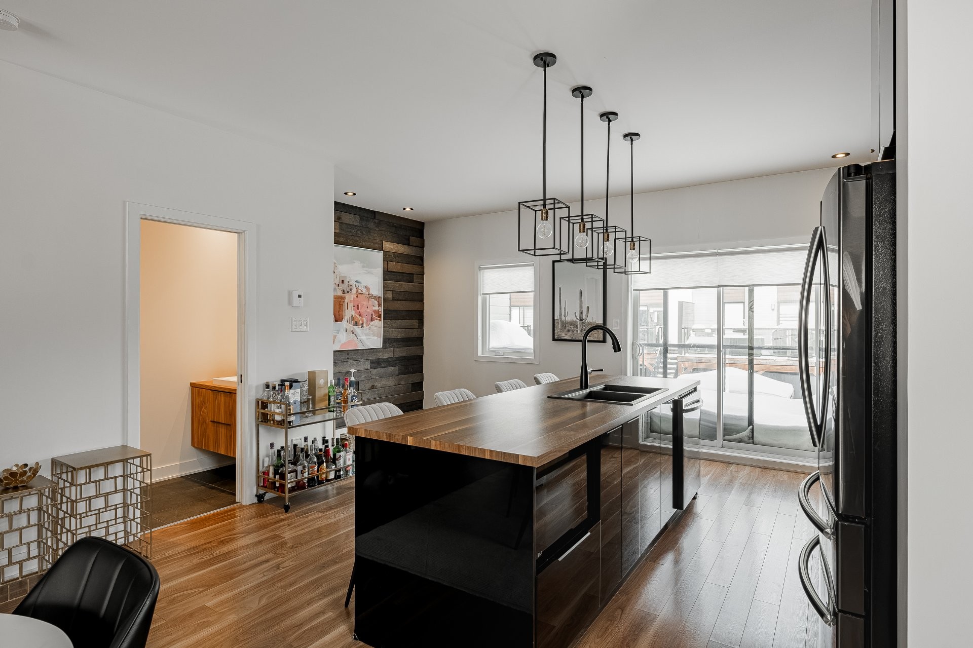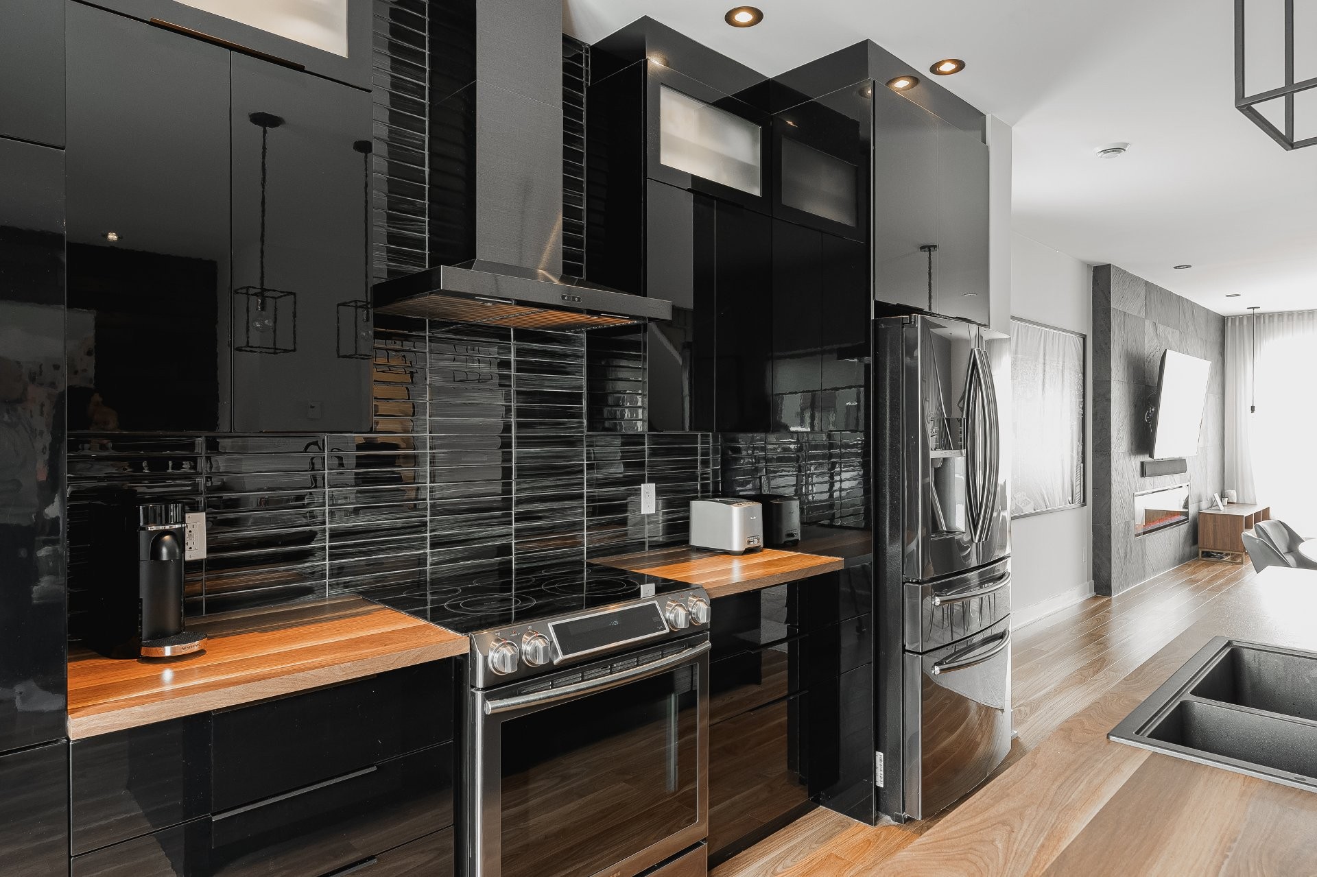 With all levels above ground, natural light pours in throughout the home. The main floor features 9-foot ceilings and an open-concept layout that feels both spacious and inviting. The kitchen is stylish and functional, complete with a large central island, sleek black cabinetry, ceramic backsplash, and a cozy nook perfect for a home office or reading space. A powder room is conveniently located on this level as well.