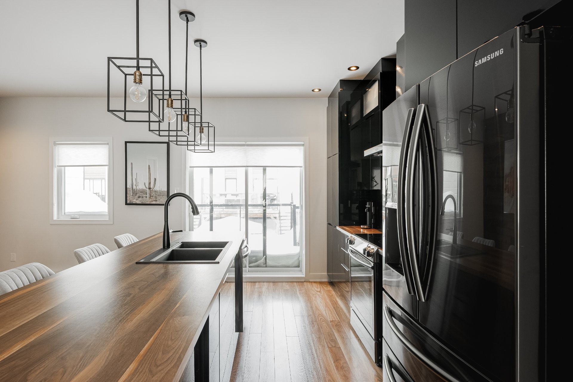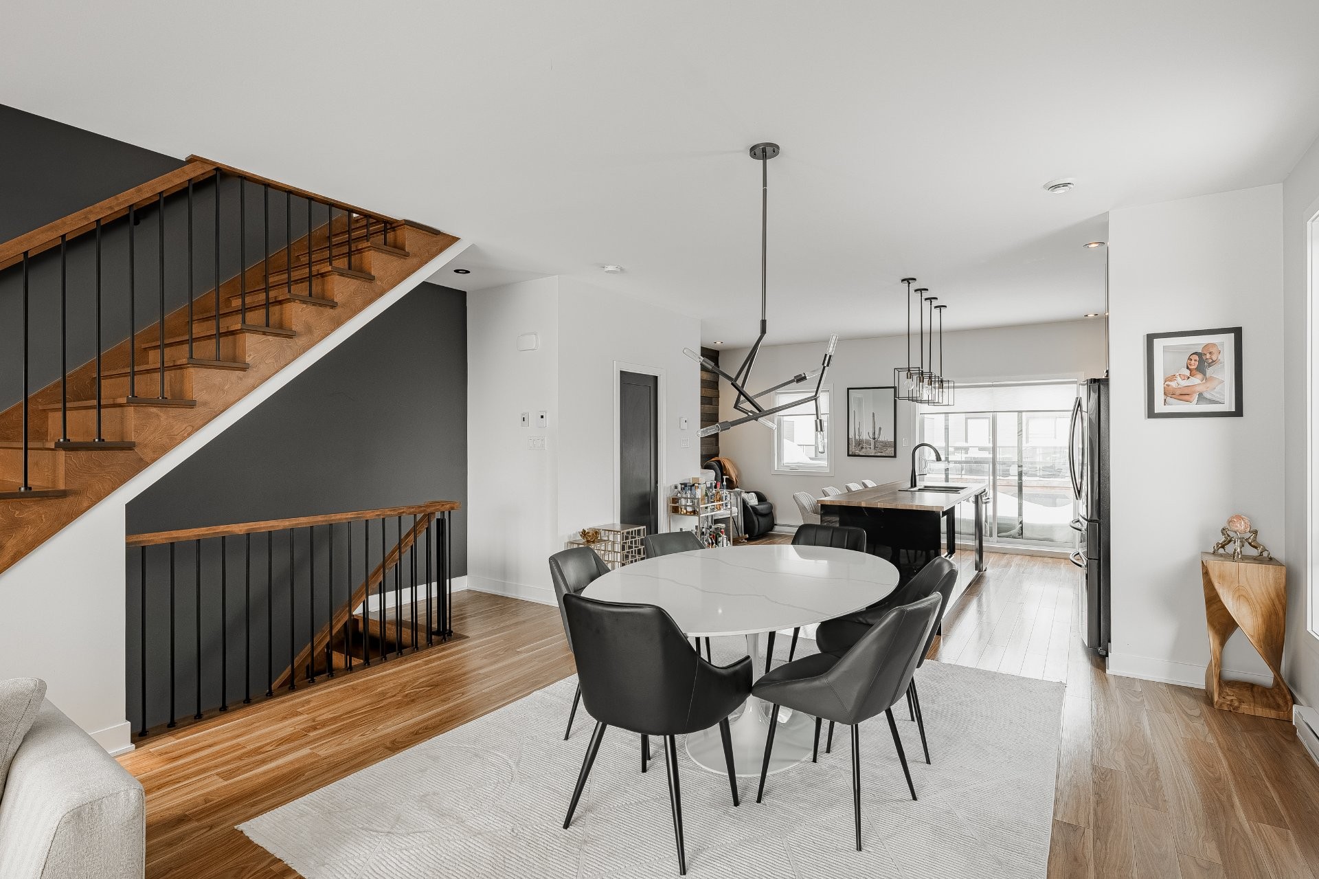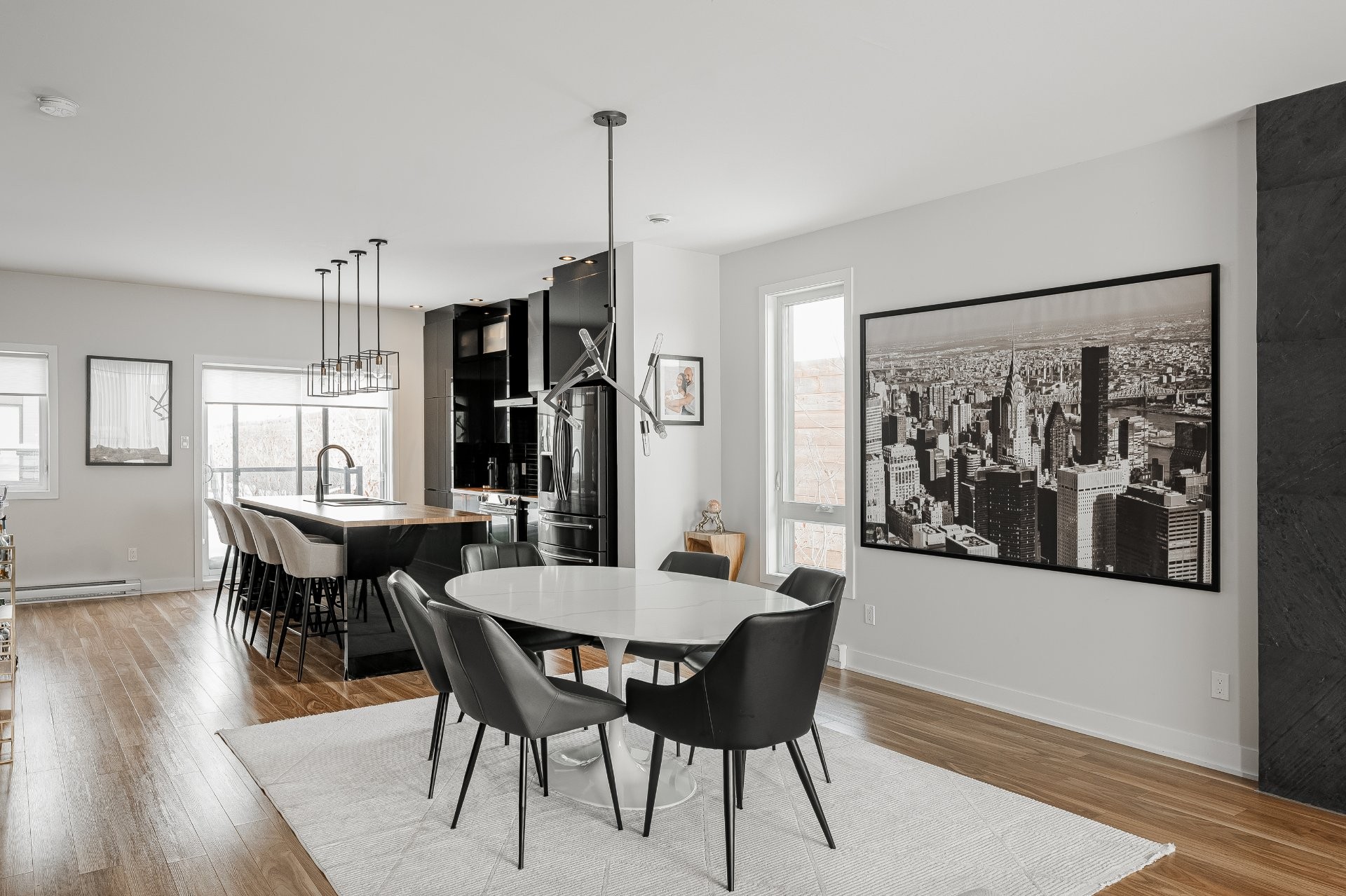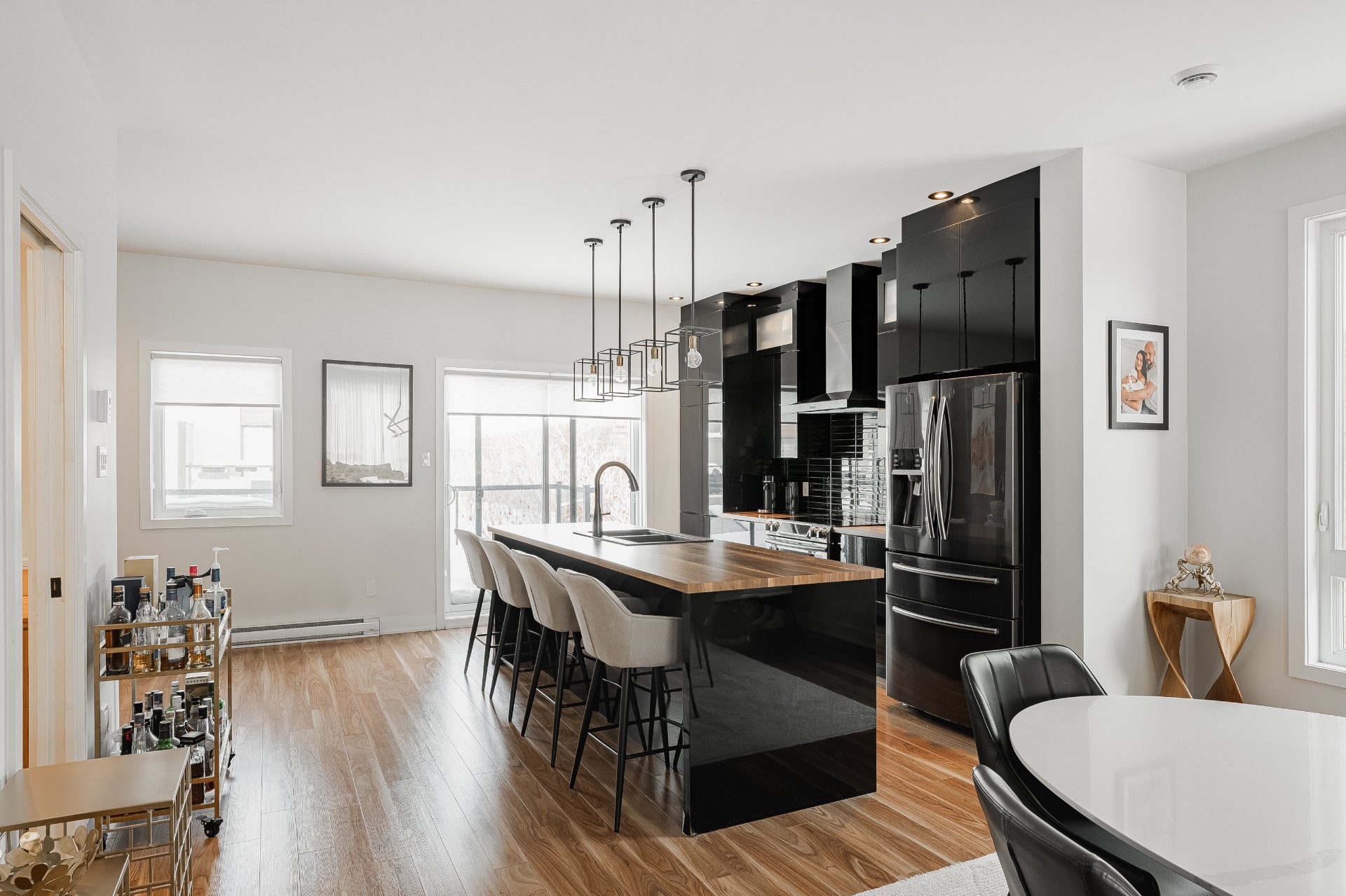 With all levels above ground, natural light pours in throughout the home. The main floor features 9-foot ceilings and an open-concept layout that feels both spacious and inviting. The kitchen is stylish and functional, complete with a large central island, sleek black cabinetry, ceramic backsplash, and a cozy nook perfect for a home office or reading space. A powder room is conveniently located on this level as well.