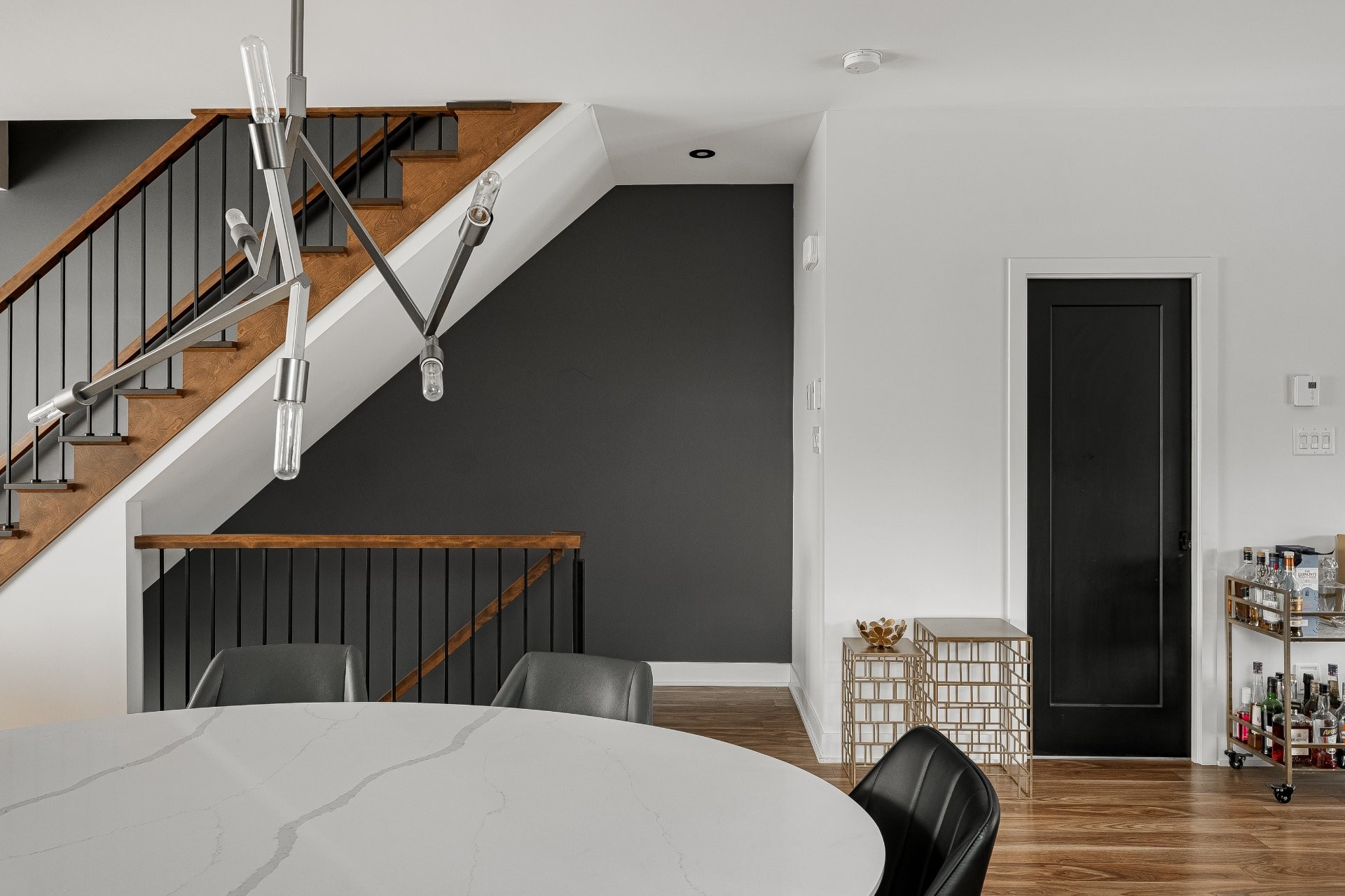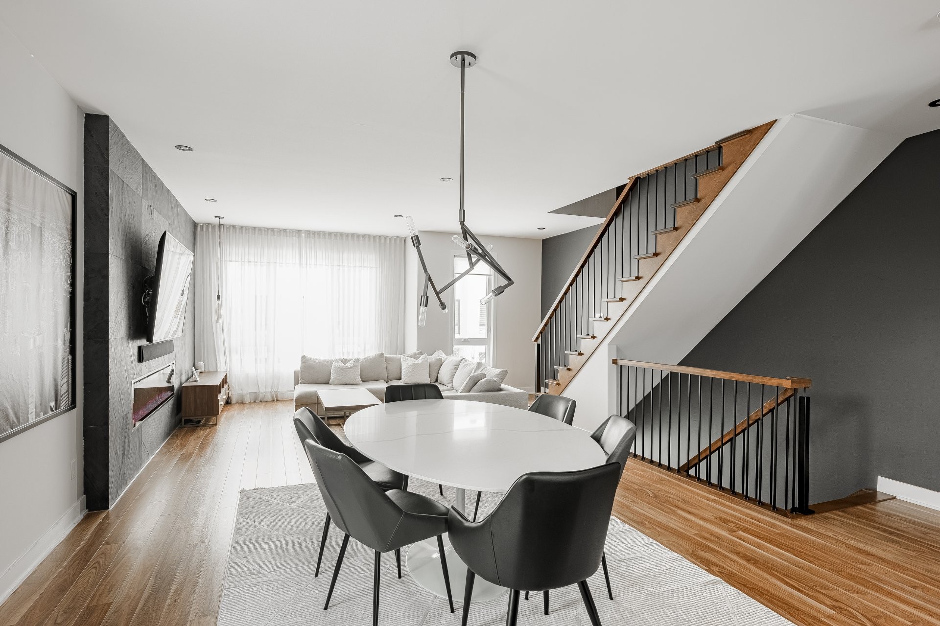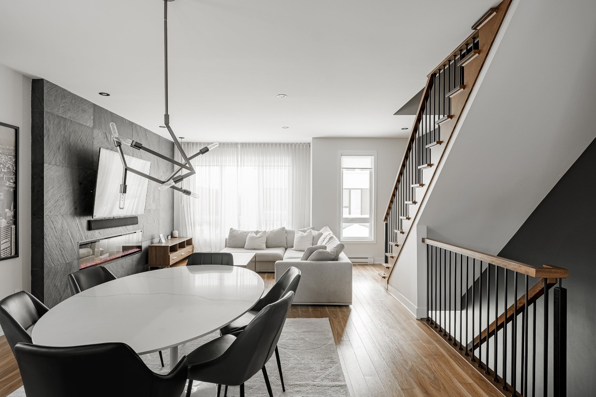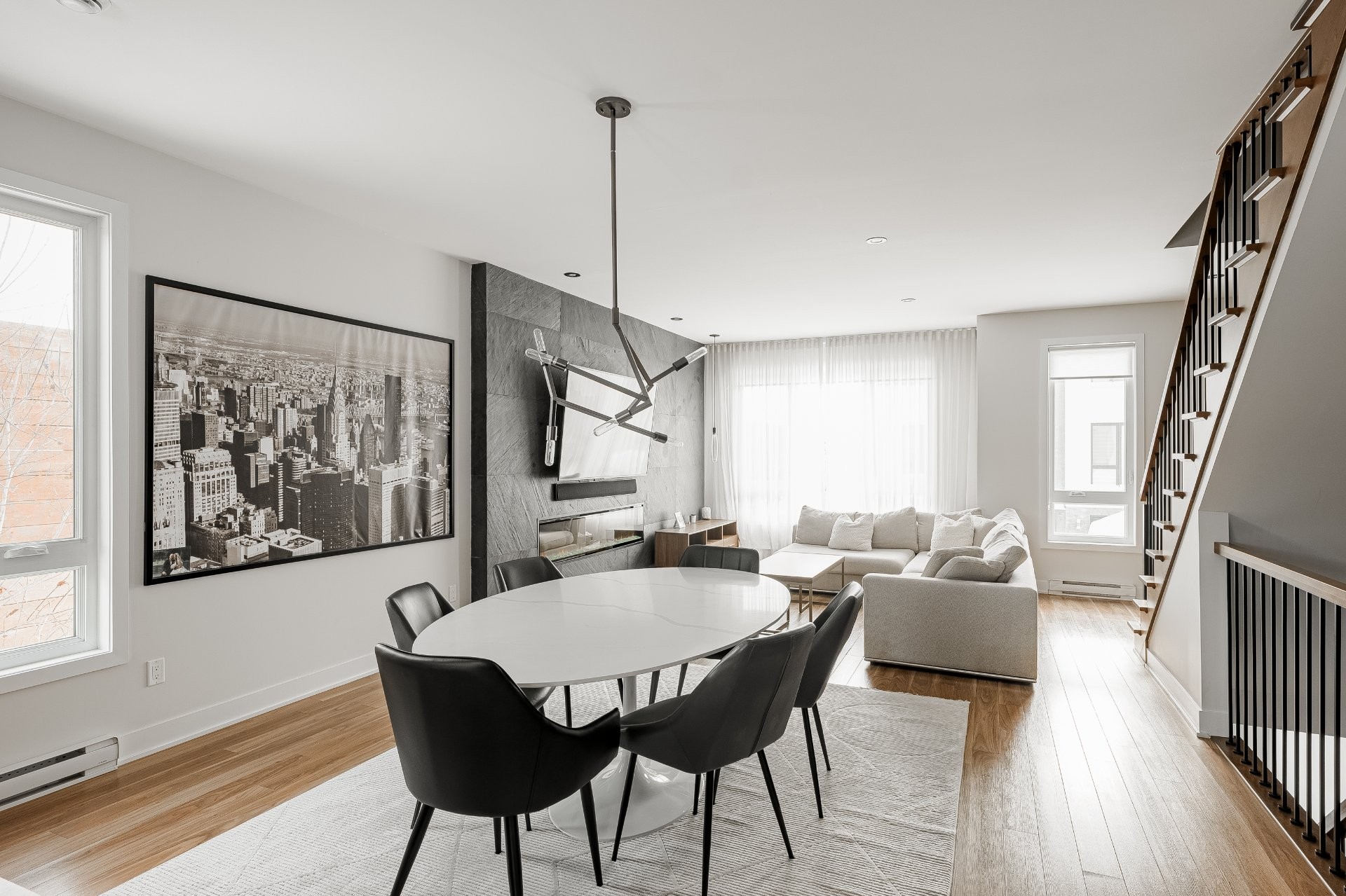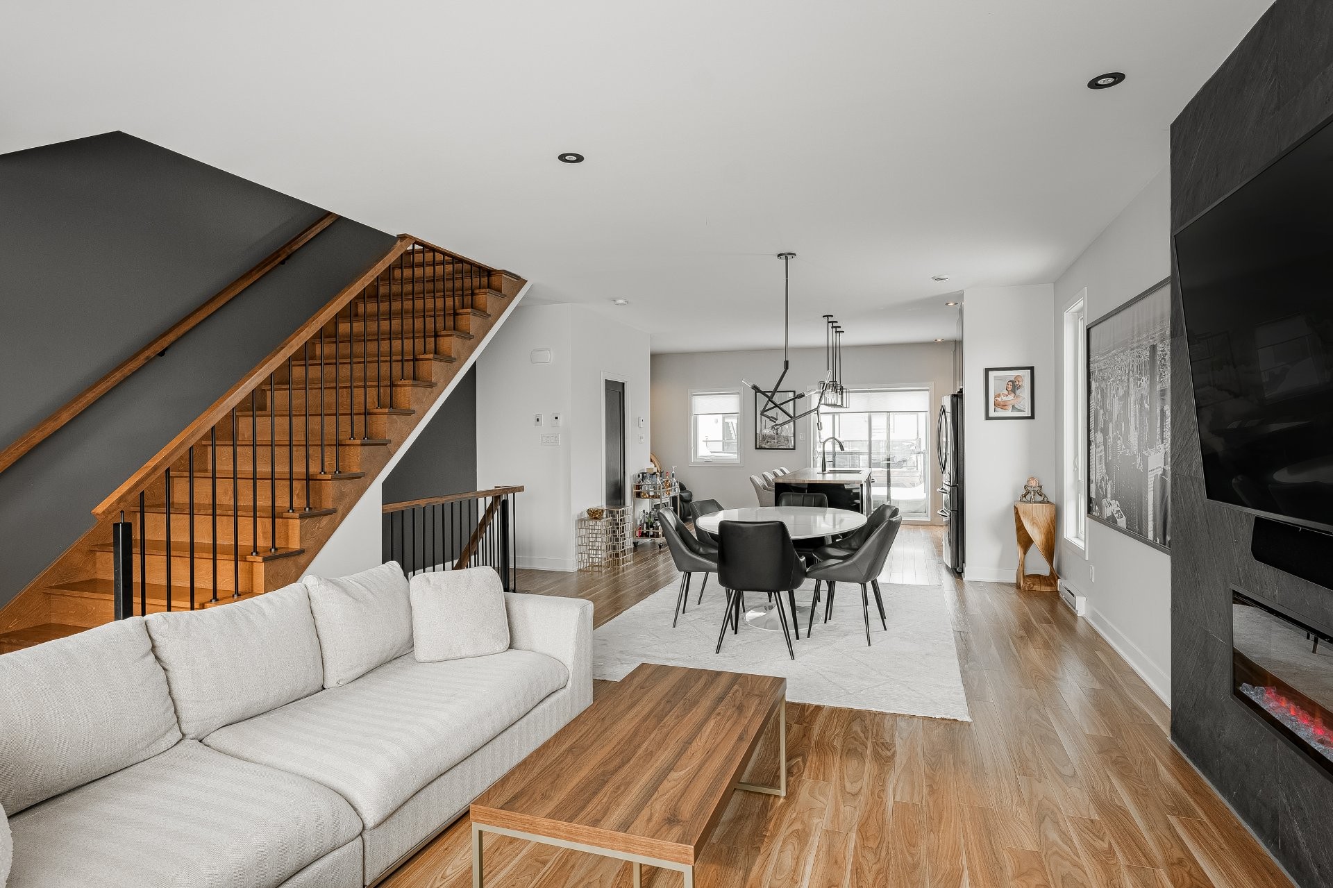 With all levels above ground, natural light pours in throughout the home. The main floor features 9-foot ceilings and an open-concept layout that feels both spacious and inviting. The kitchen is stylish and functional, complete with a large central island, sleek black cabinetry, ceramic backsplash, and a cozy nook perfect for a home office or reading space. A powder room is conveniently located on this level as well.