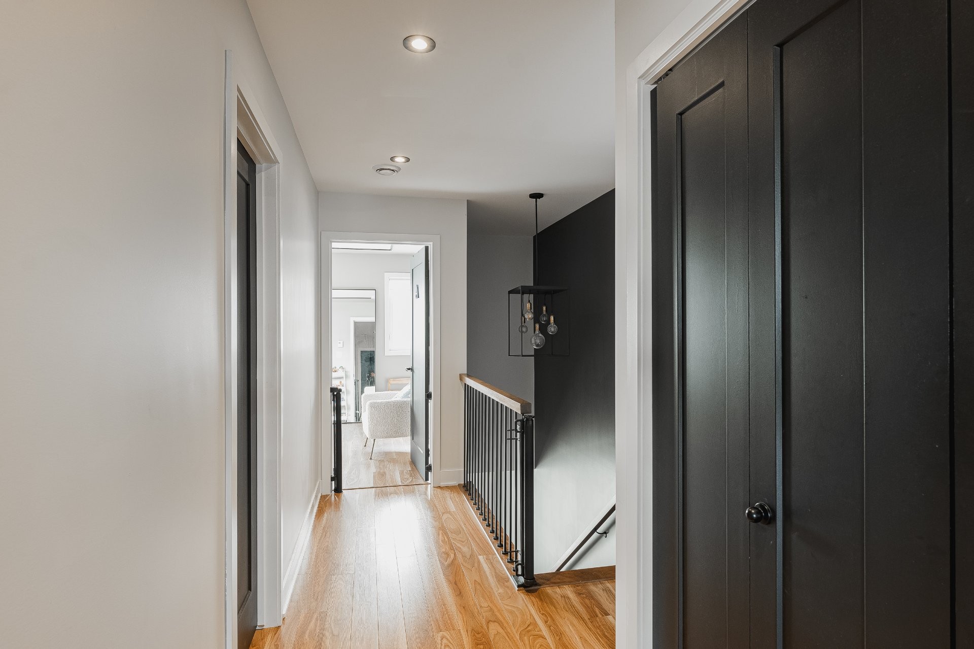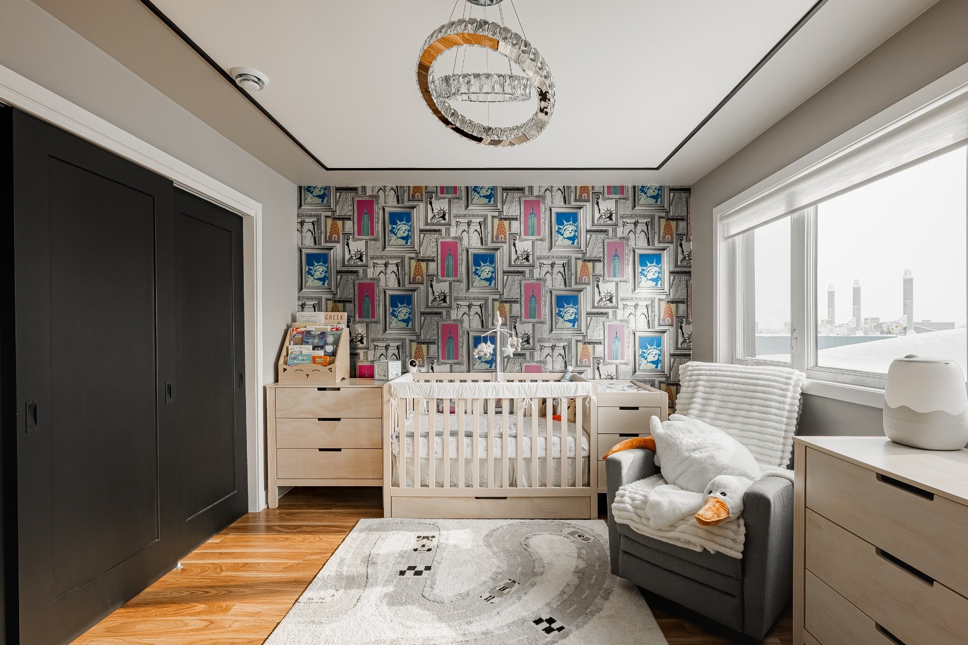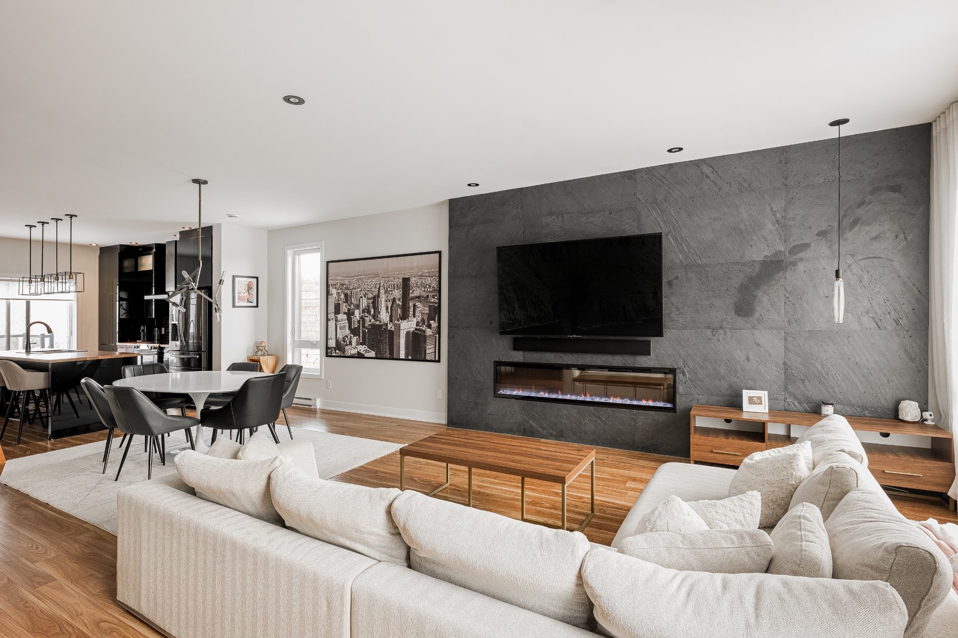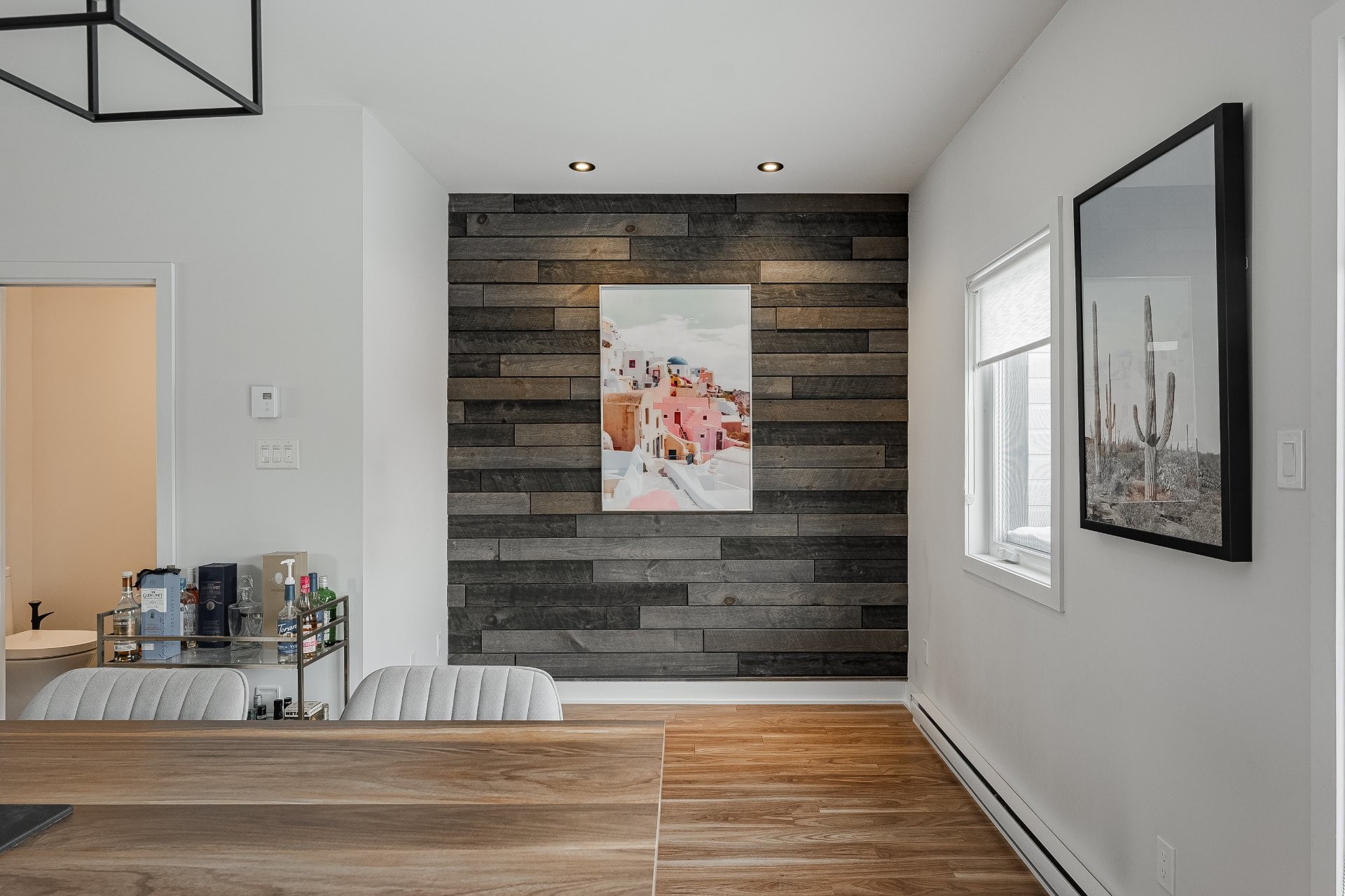 With all levels above ground, natural light pours in throughout the home. The main floor features 9-foot ceilings and an open-concept layout that feels both spacious and inviting. The kitchen is stylish and functional, complete with a large central island, sleek black cabinetry, ceramic backsplash, and a cozy nook perfect for a home office or reading space. A powder room is conveniently located on this level as well.