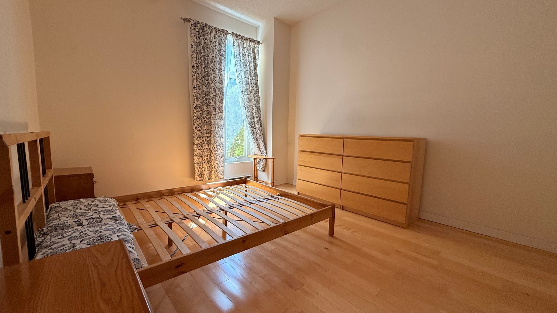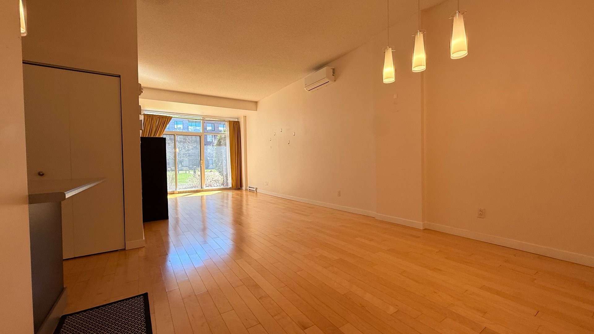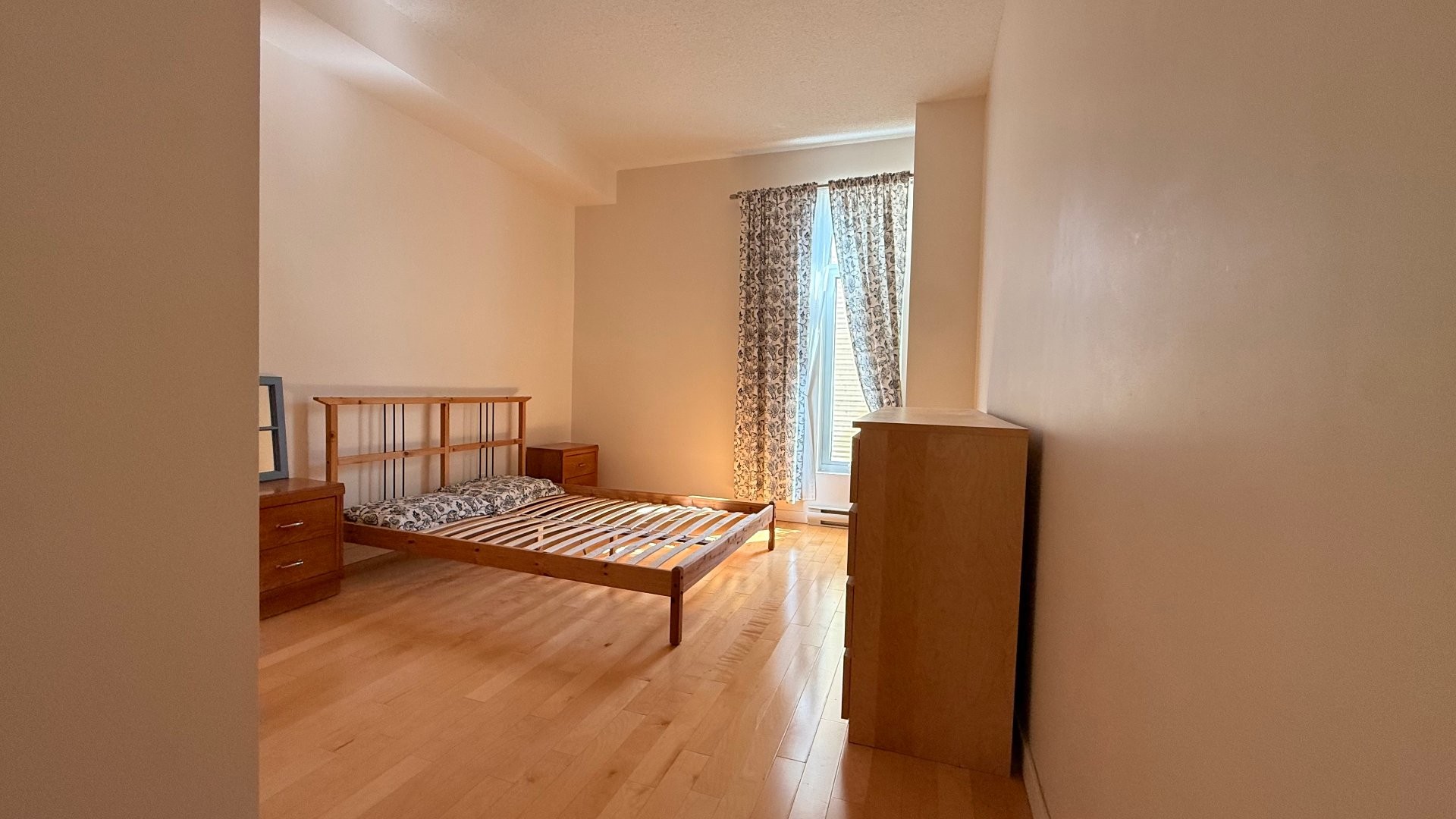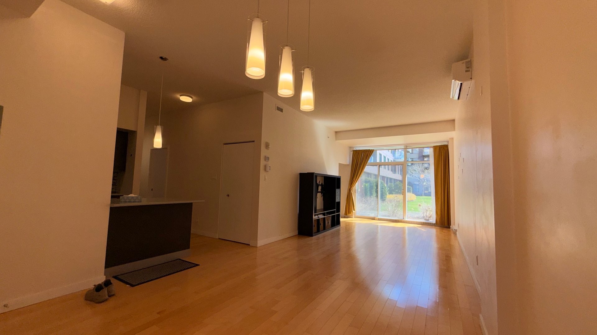 Contemporary condo featuring ceilings close to 10 ft. Offers 2 bedrooms + office, a large bathroom with separate shower and tub, A/C, indoor parking and storage locker. The primary bedroom includes a walk-in closet. The second bedroom features a custom Murphy bed with integrated lighting and TV. Enjoy direct outdoor access to the interior courtyard. The building offers an exterior ramp, elevators, security cameras, shared garden and playground. Ideally located in Lachine near grocery store and pharmacy. A short stroll to the summer farmers' market and the beginning of thee Lachine Canal. Quick access to highways 20, 520 and 13.