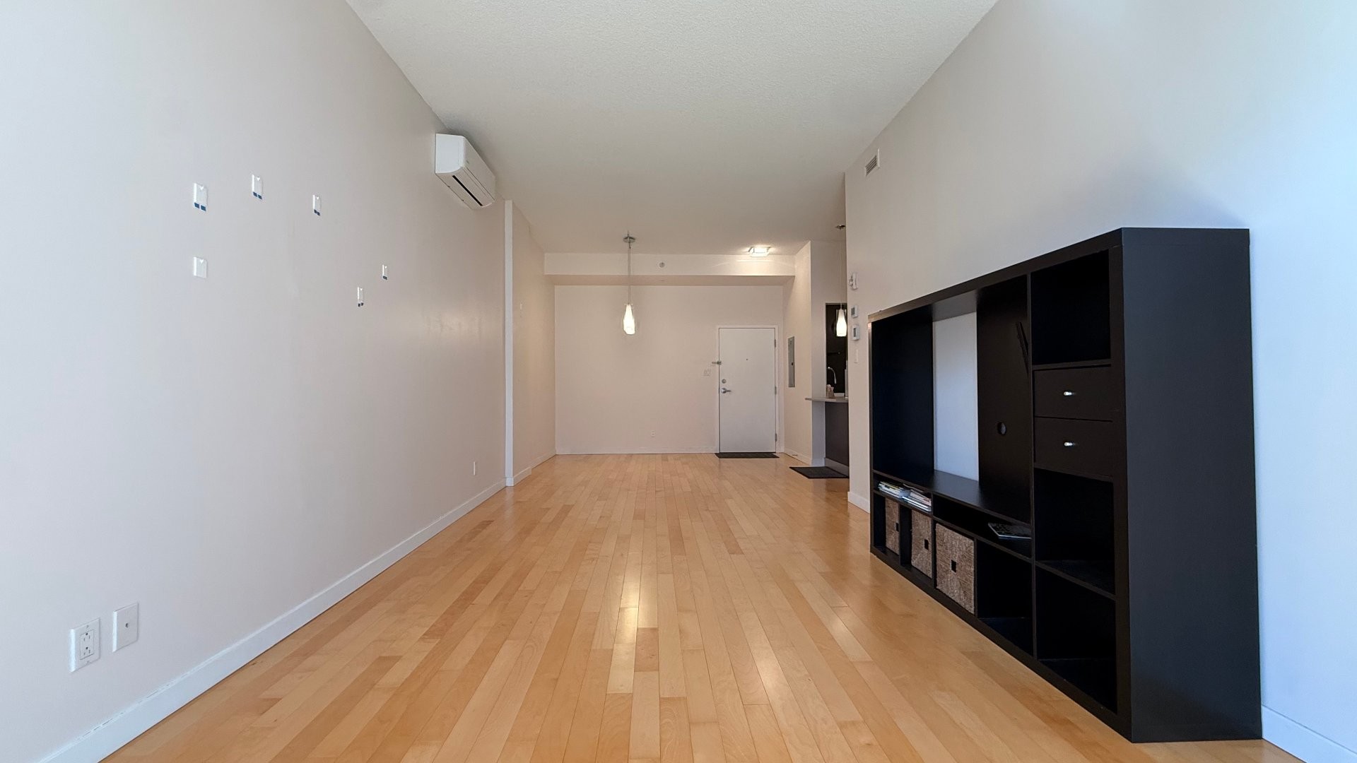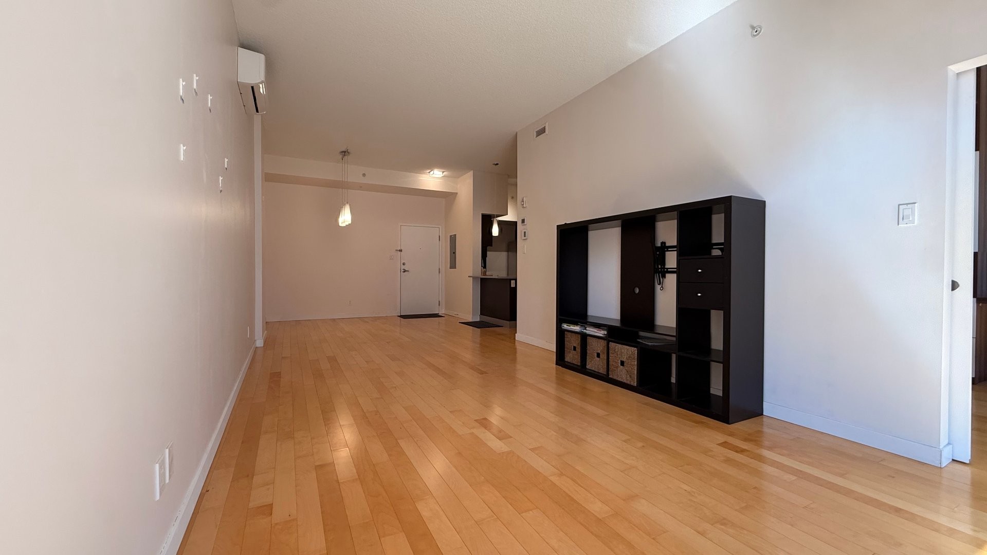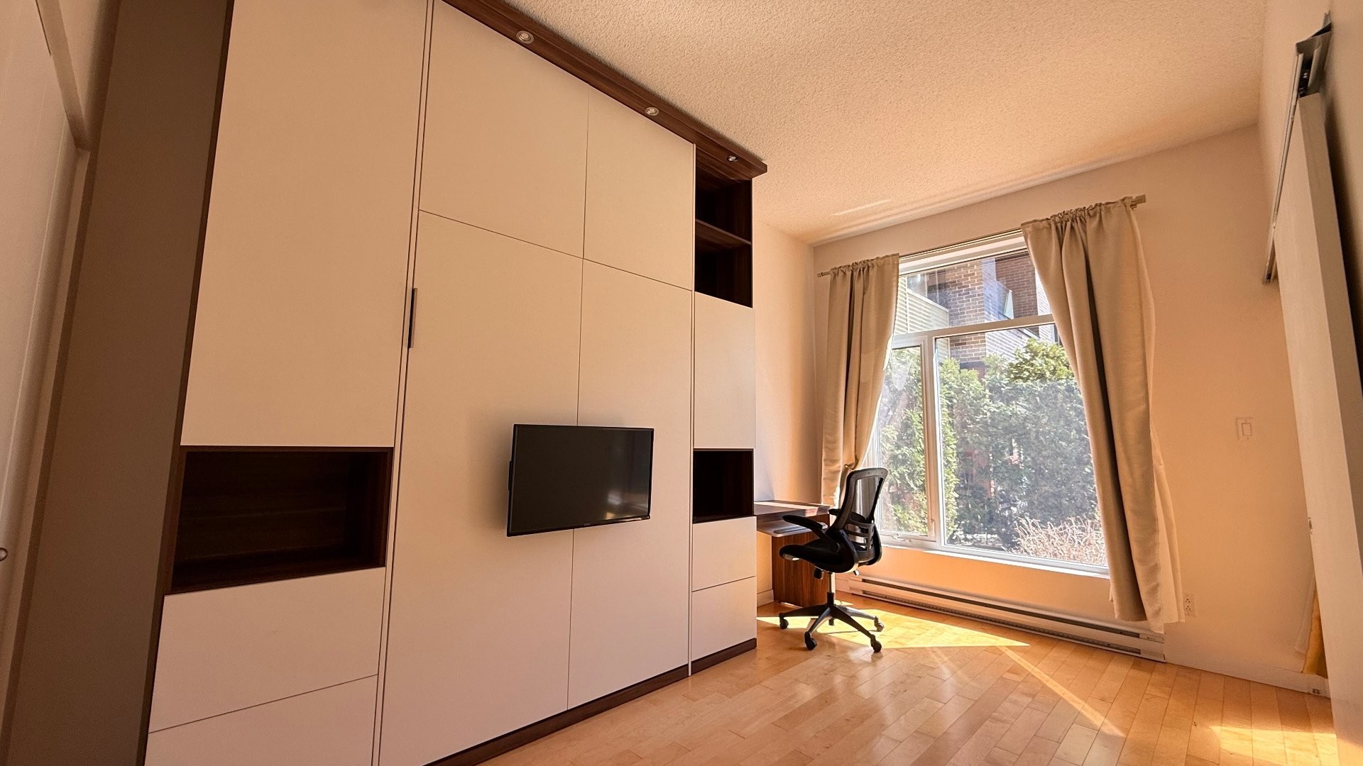 Located at 2305 Rue Remembrance in Lachine, Montreal, this contemporary condo features ceilings close to 10 ft and a well-designed layout. It offers 2 bedrooms + office, a spacious bathroom with a separate shower and tub, A/C, indoor parking, and a storage locker. The primary bedroom includes a walk-in closet, while the second bedroom features a custom Murphy bed with integrated lighting and TV--ideal for flexible use of space. Enjoy direct outdoor access leading to the interior courtyard, creating a seamless indoor-outdoor living experience.