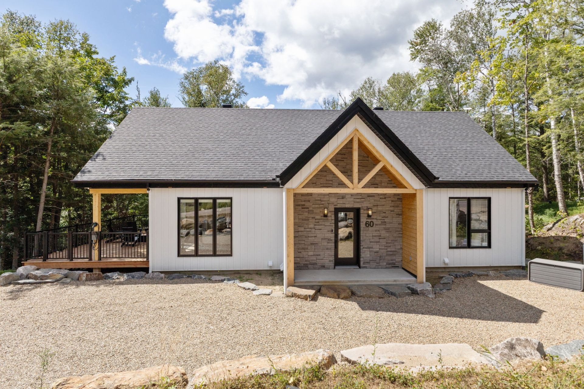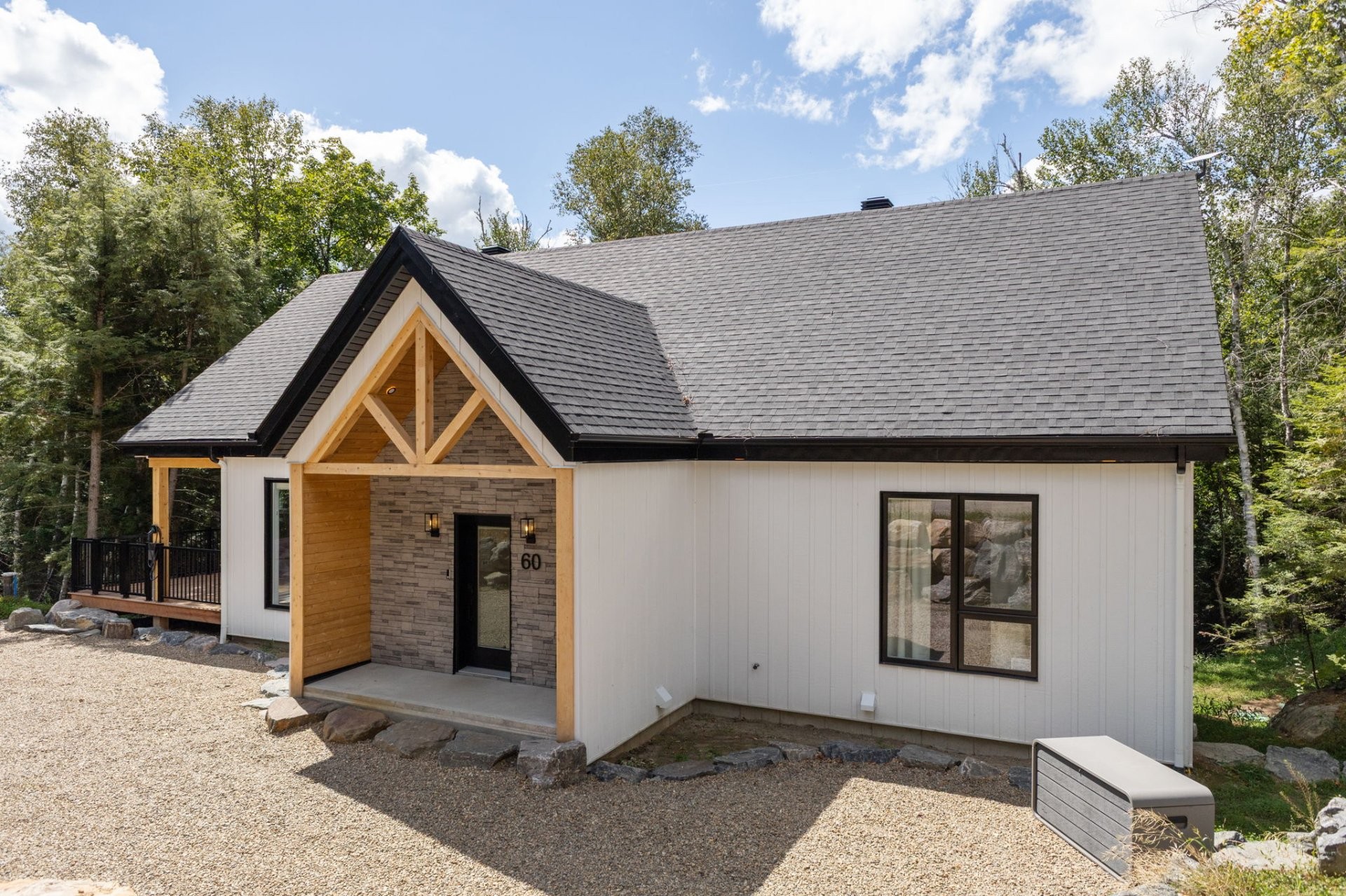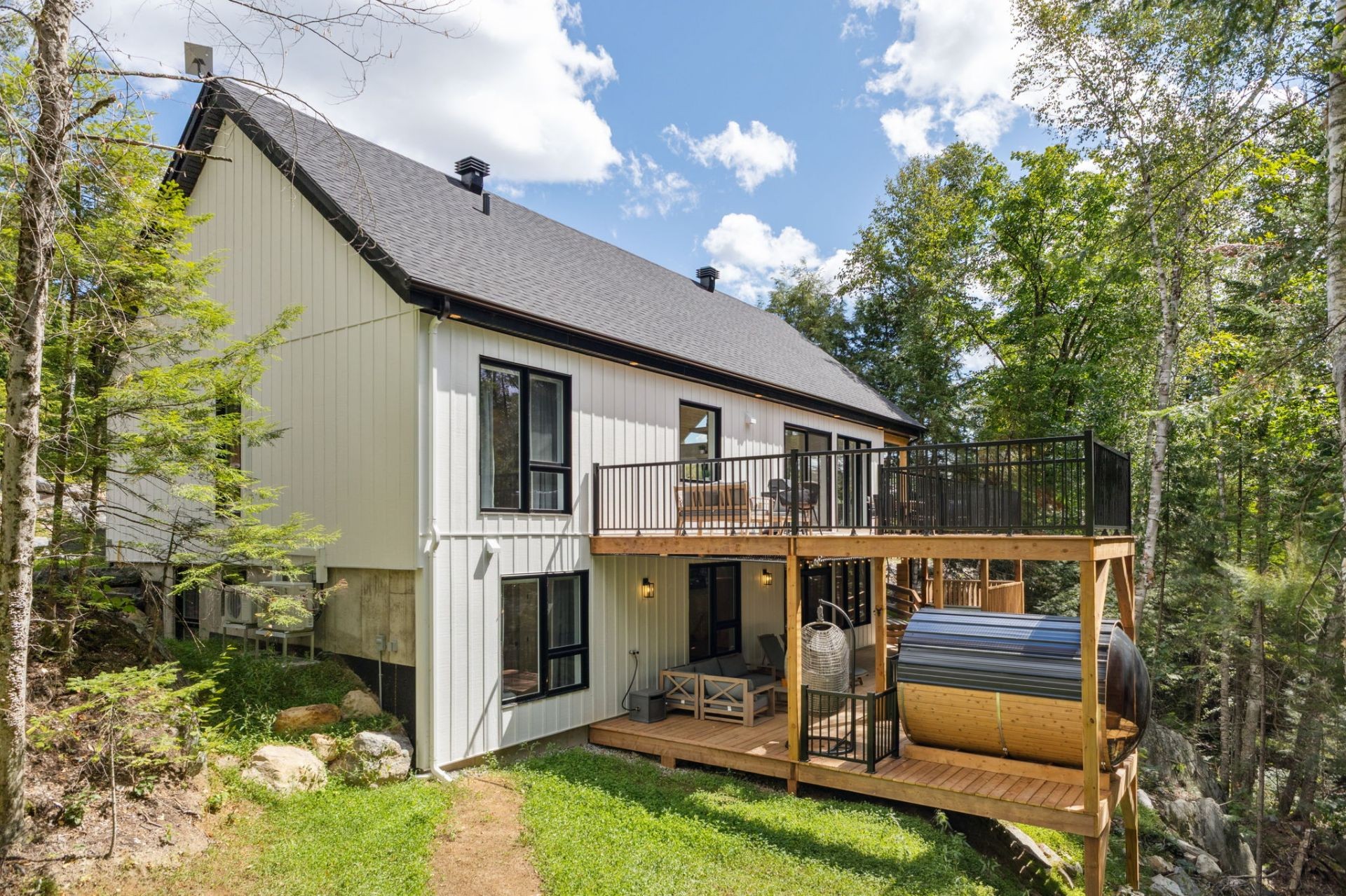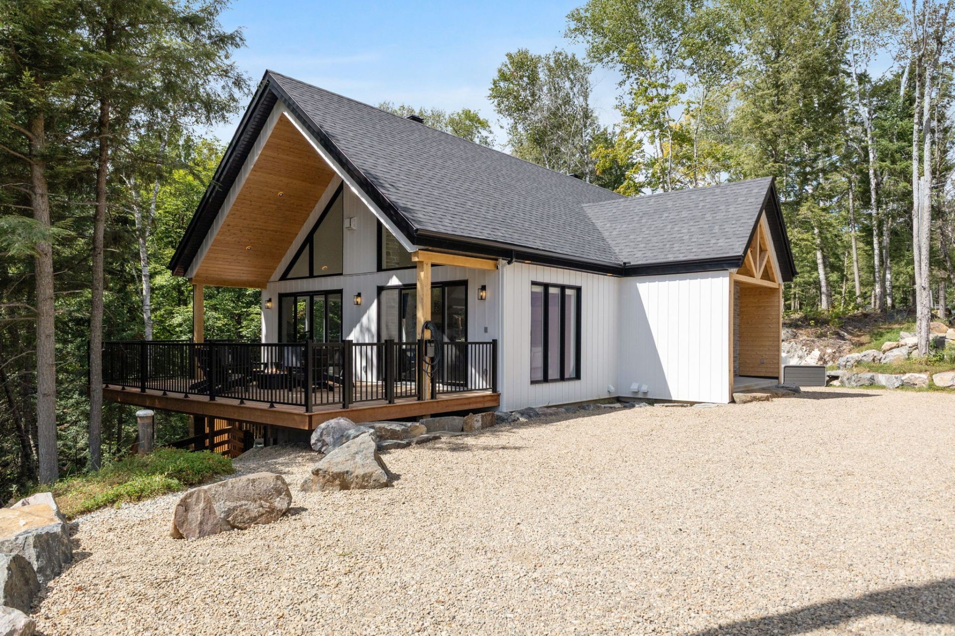 SHORT-TERM RENTALS PERMITTED! Stunning luxury chalet with 5 bedrooms, 4 bathrooms, and 1 powder room, located just 12 minutes from Mont-Tremblant. Modern design, high-end materials, heated floors, large terrace with jacuzzi. A perfect balance between comfort, nature, and performance. A turnkey investment combining pleasure and profitability, in the heart of the ChicShack domain!