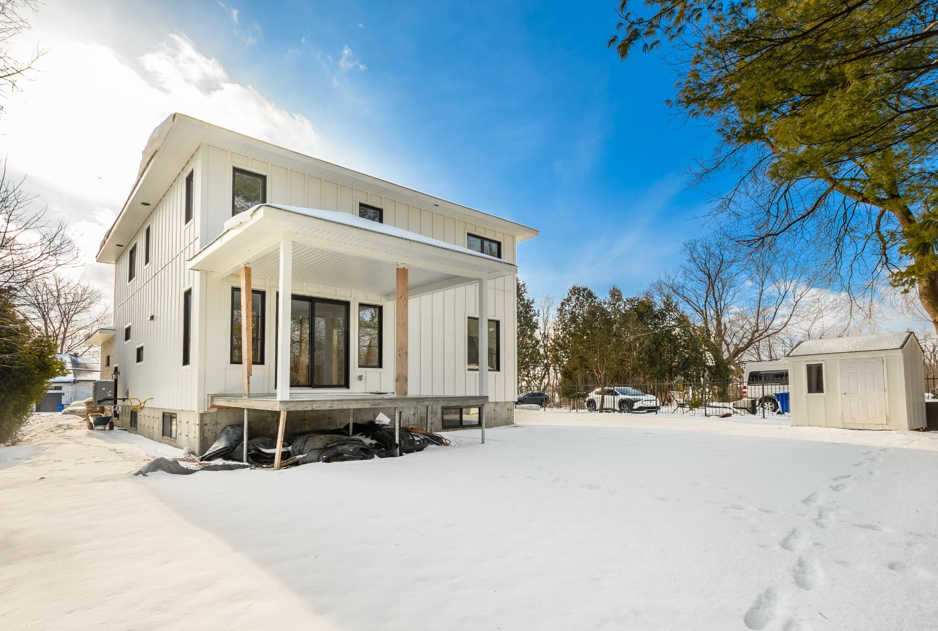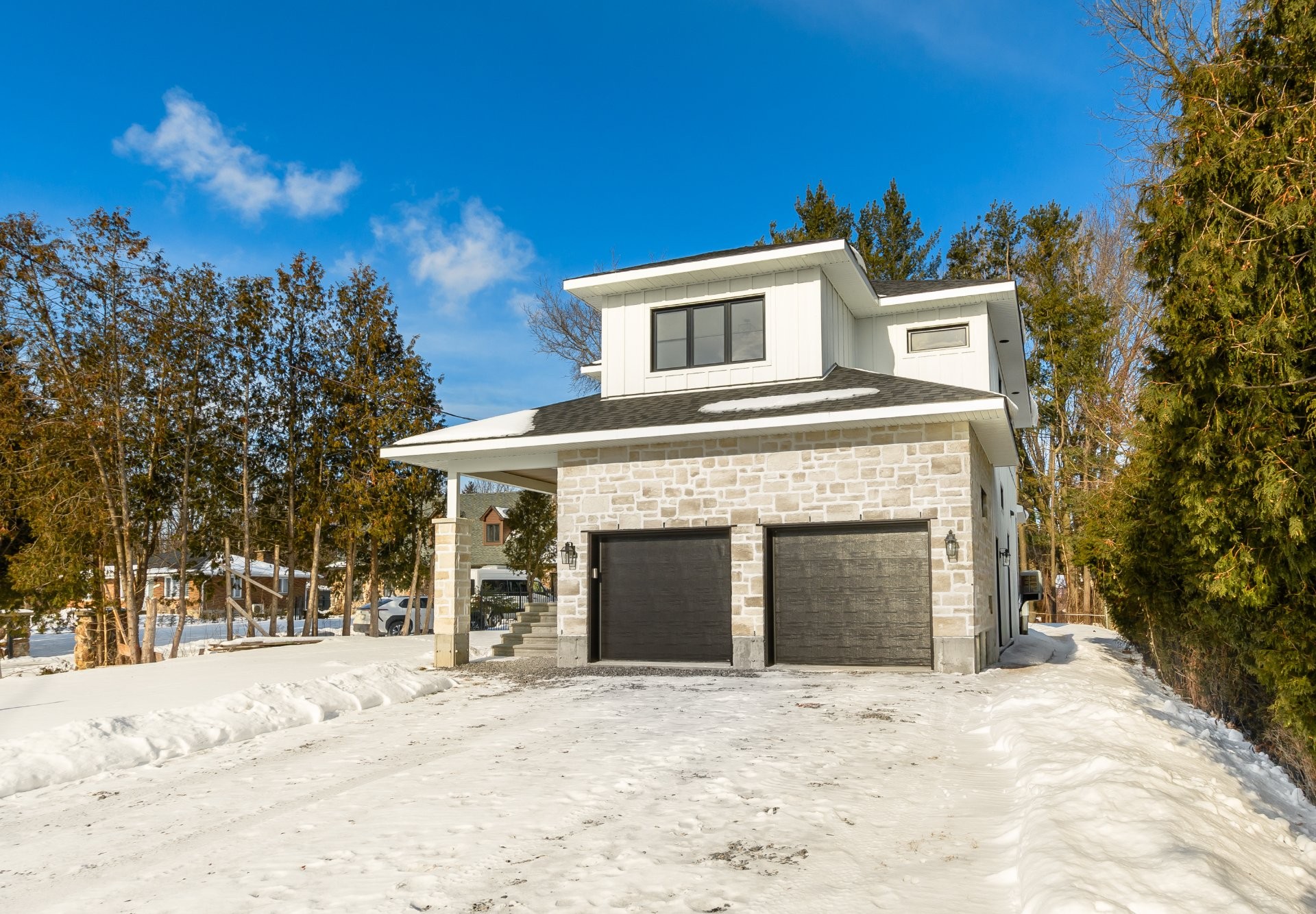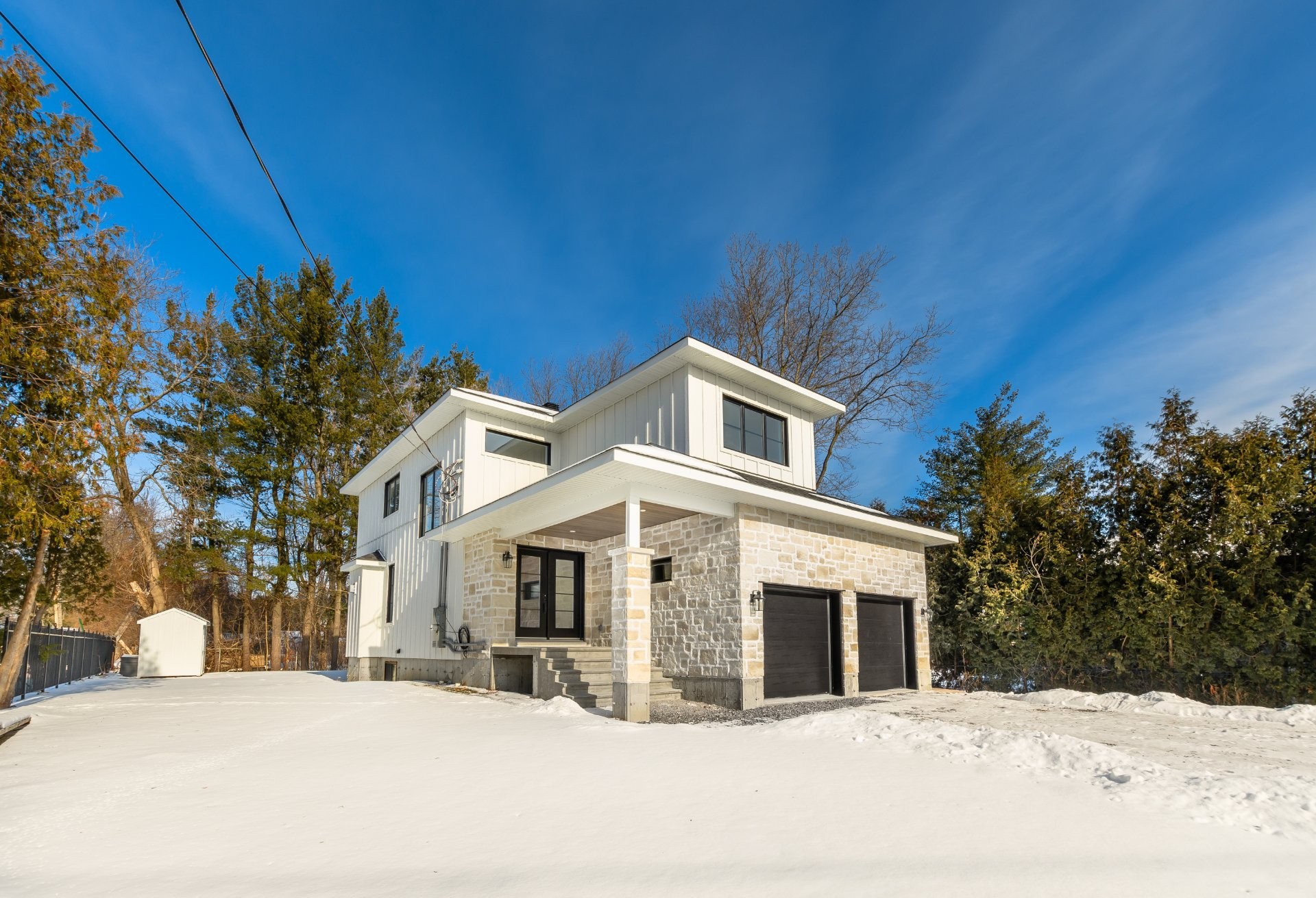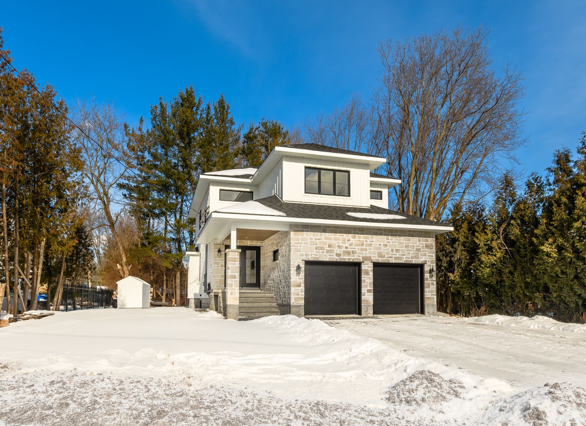 Gorgeous white board & batten exterior siding as well as beautiful stone craftsmanship façade with an antiqued finish. Newly installed sod and custom designed board and batten shed. Property partially bordered by hedges and fence. Concrete roof covered front & back porch. Mature and private property. W/no rear neighbours.