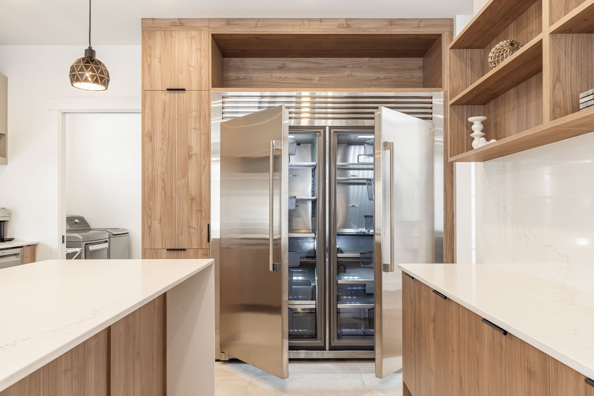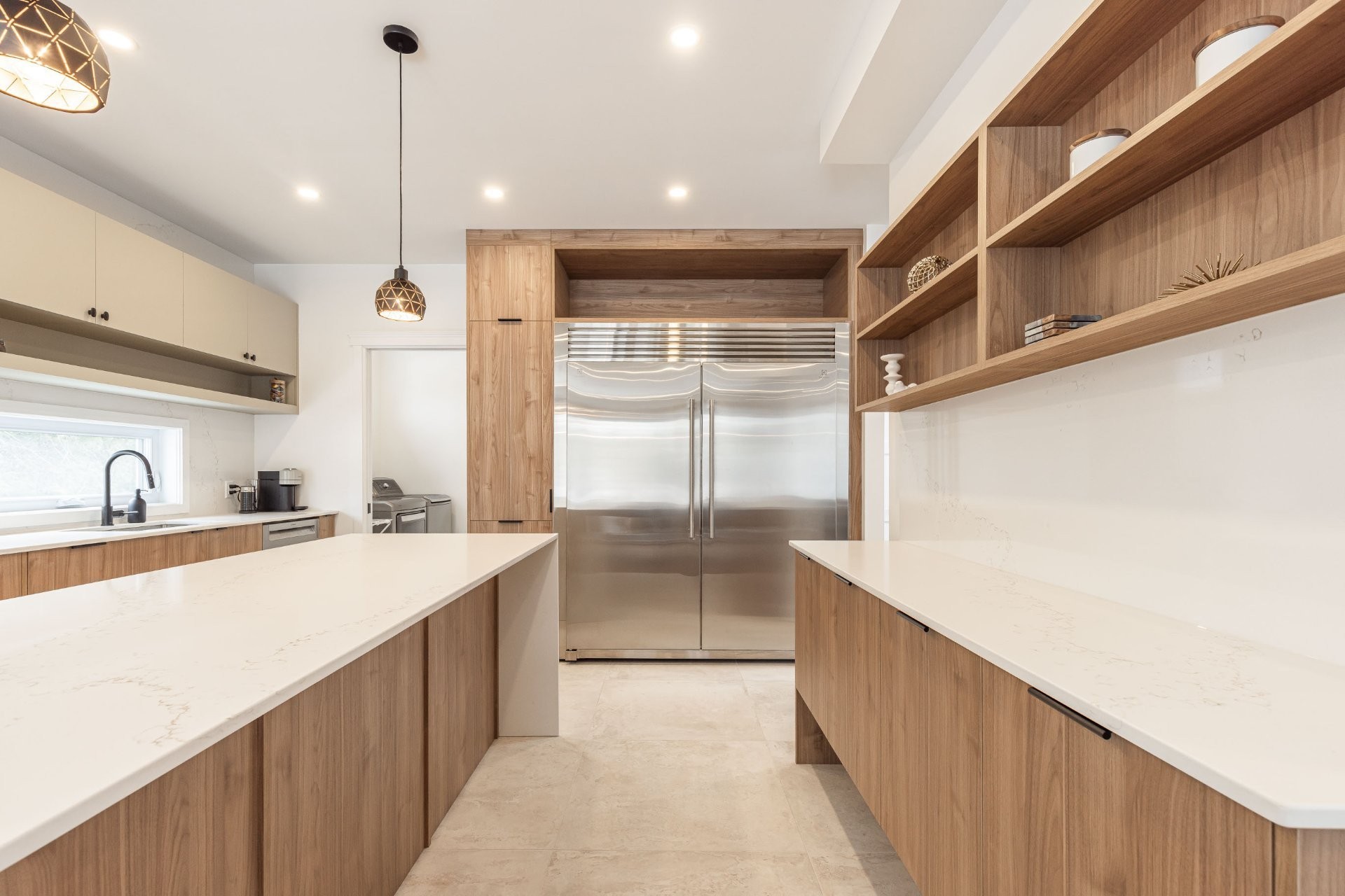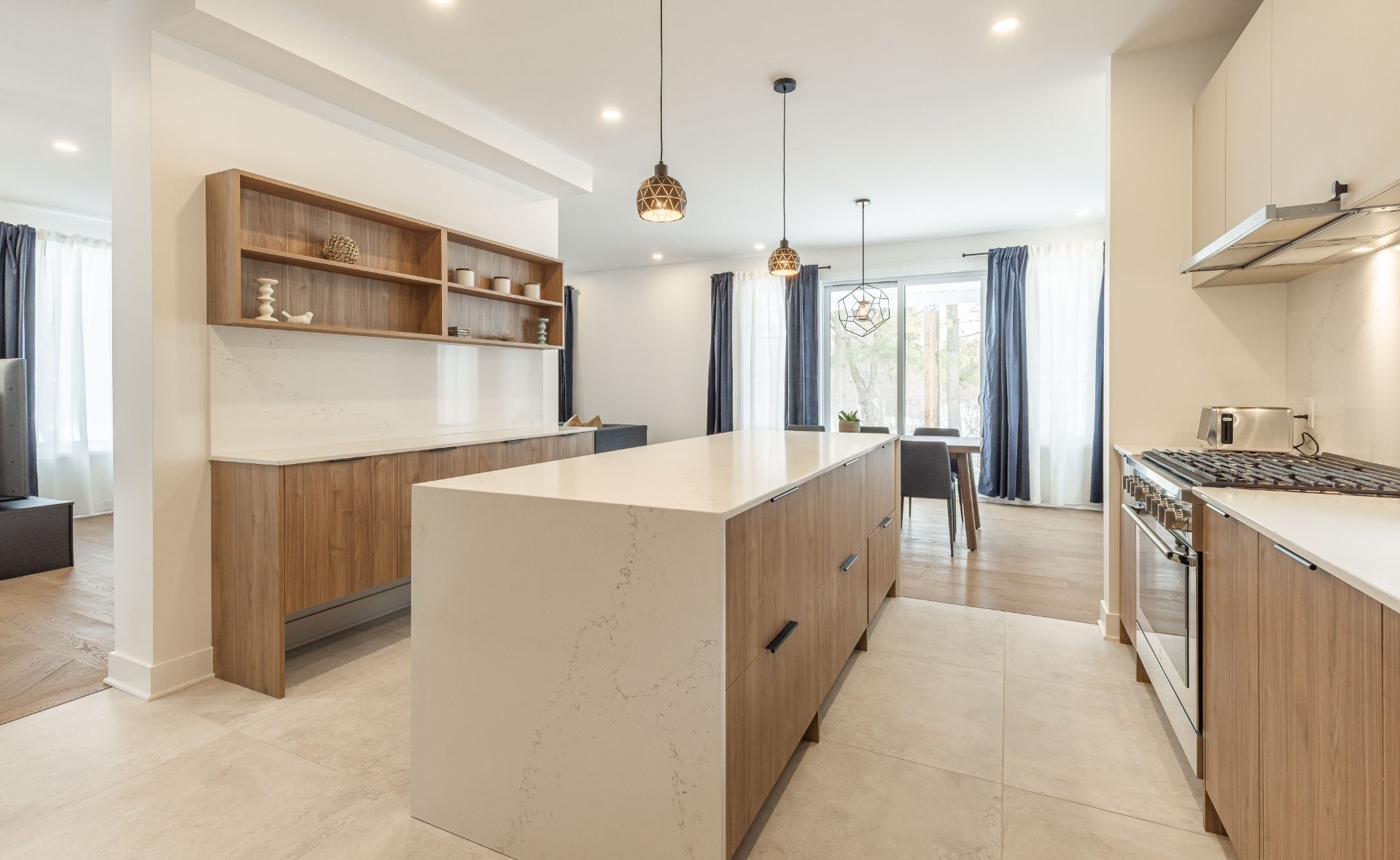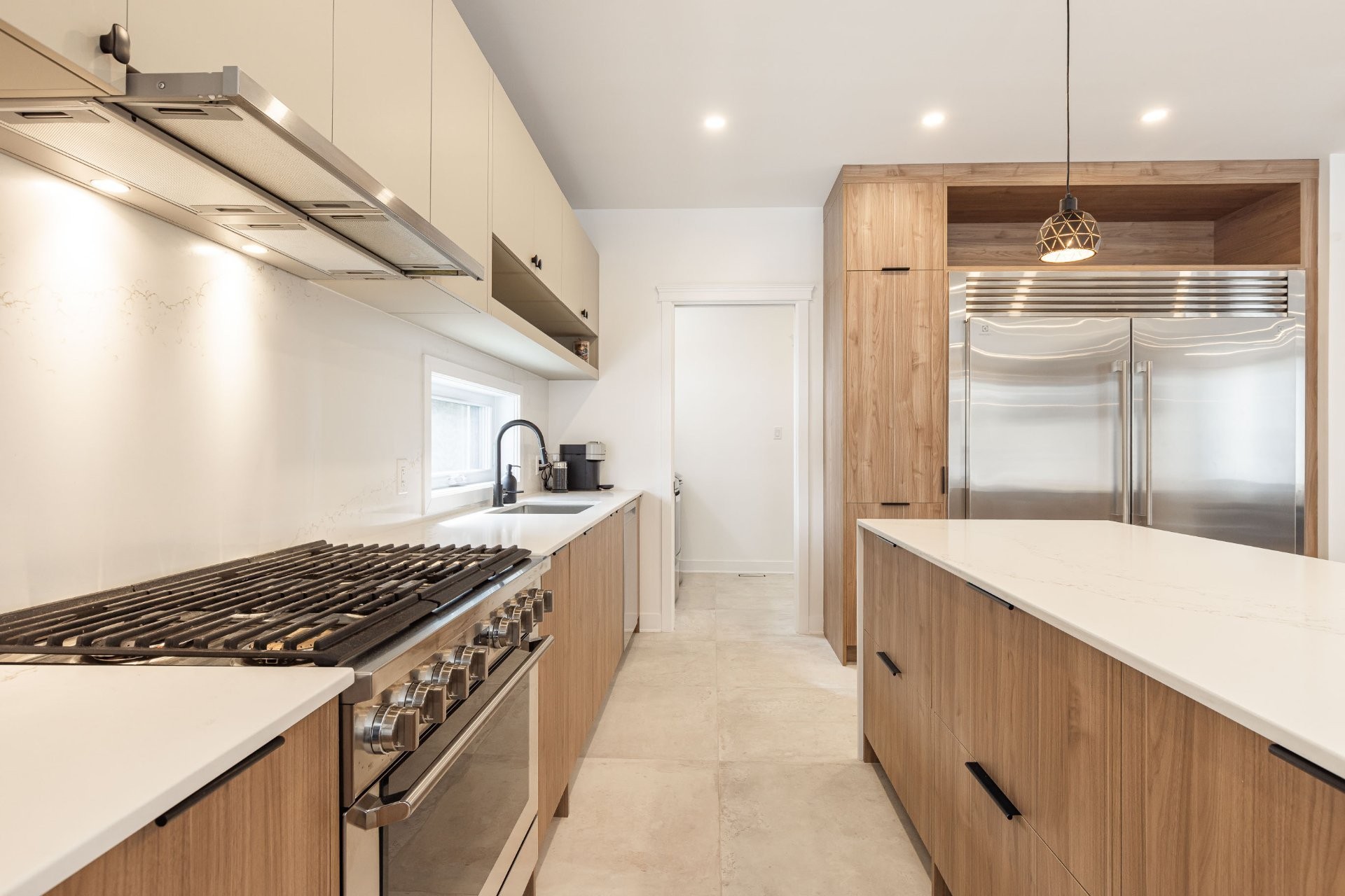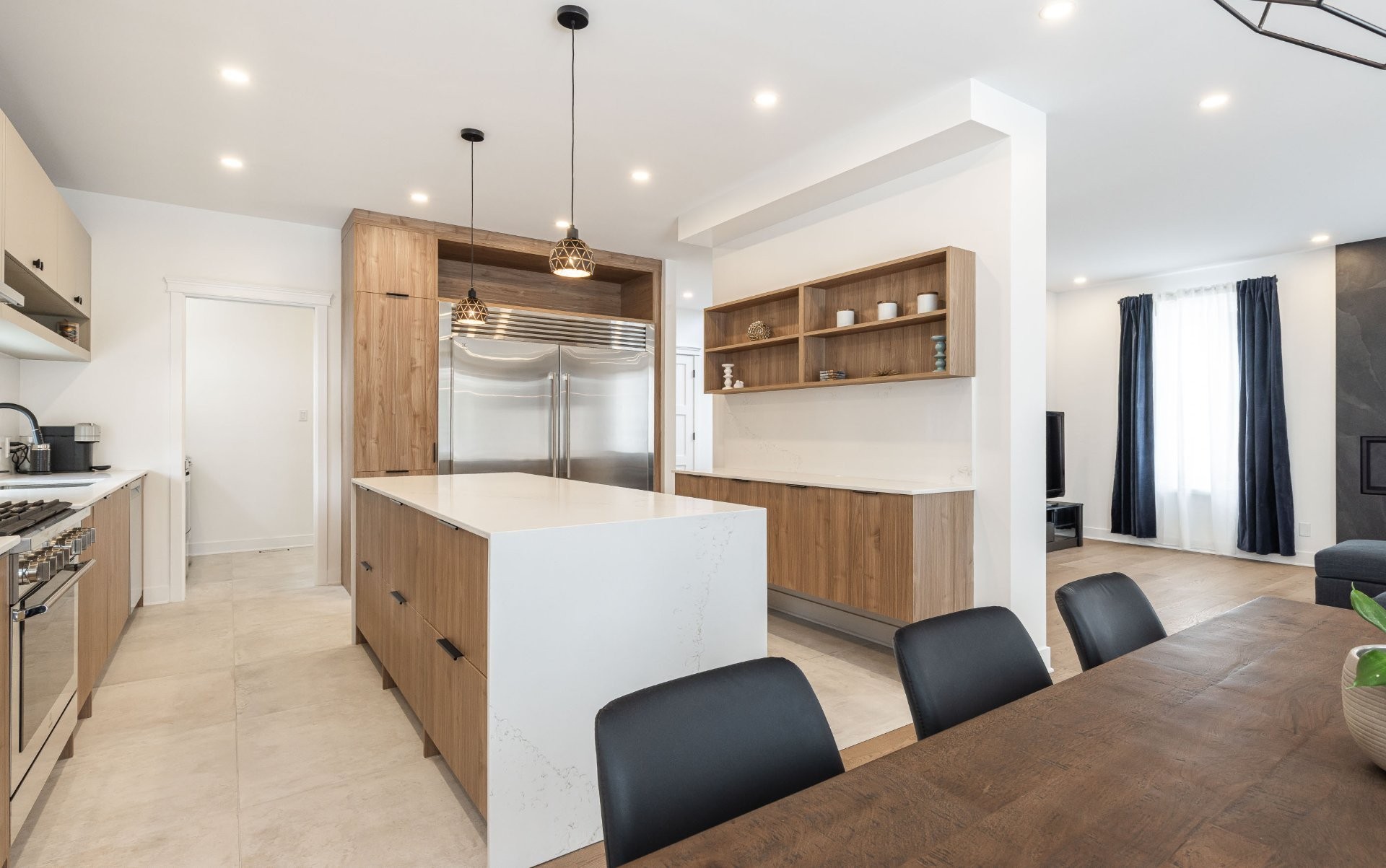 A welcoming entrance gives way through the covered front porch, which leads to a beautiful hall entrance decorated with herringbone floor. The wood flooring carries on through to the welcoming living room featuring a stunning modern gas fireplace, tiled from floor to ceiling. Continuing on into the beautiful dining room, which leads to the spacious and inviting back covered porch. The spectacular kitchen offers, luxurious custom cabinetry, a massive island with oversize pot drawers and lots of seating space, a coffee station & bar w/quartz backsplash and functional shelving, as well as a gas range w/convection oven and super sleek hood vent. Elegant counter-tops continuing to the ceiling as a backsplash. Massive fridge & freezer side by each. Connecting to a mudroom/laundry-room/walk-in-pantry w/microwave cabinet which gives access to the garage. All tiles throughout imported from Italy, 9 foot ceilings on main floor, high-quality Benjamin Moore paint, beautiful light fixtures & an abundance of pot-lights!