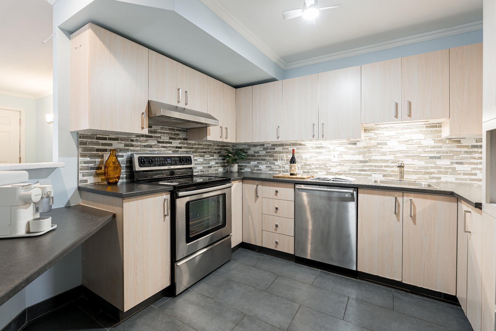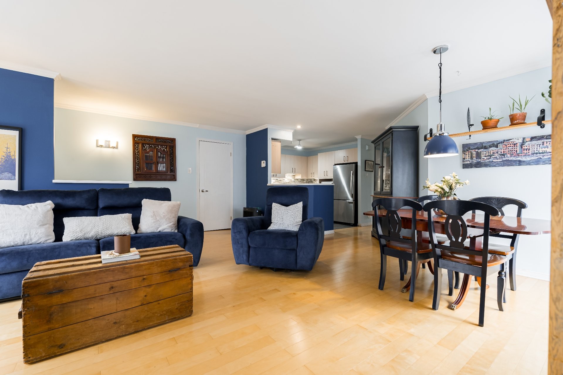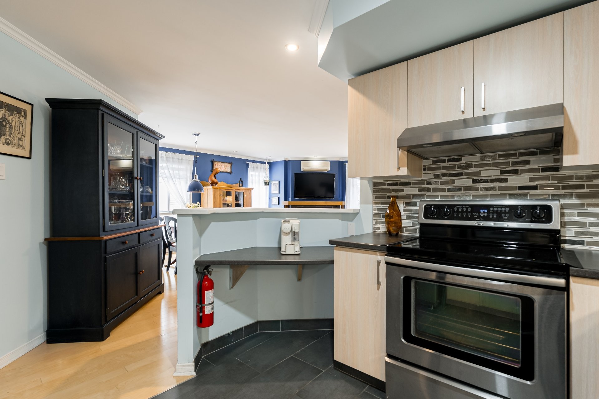 Step inside to a bright, open-concept living and dining area featuring an electric fireplace and inviting light wood floors. The kitchen offers generous counter space and ample cabinetry - perfect for everyday living and entertaining.